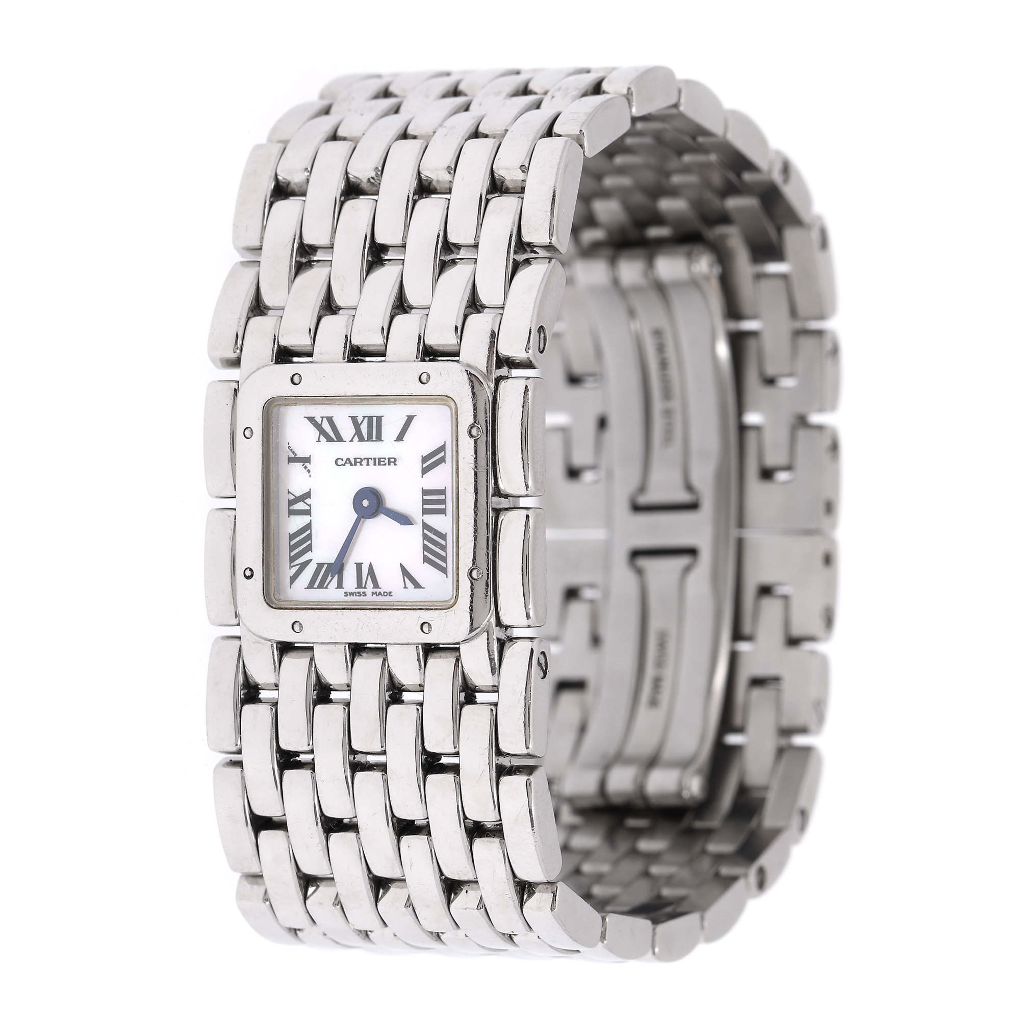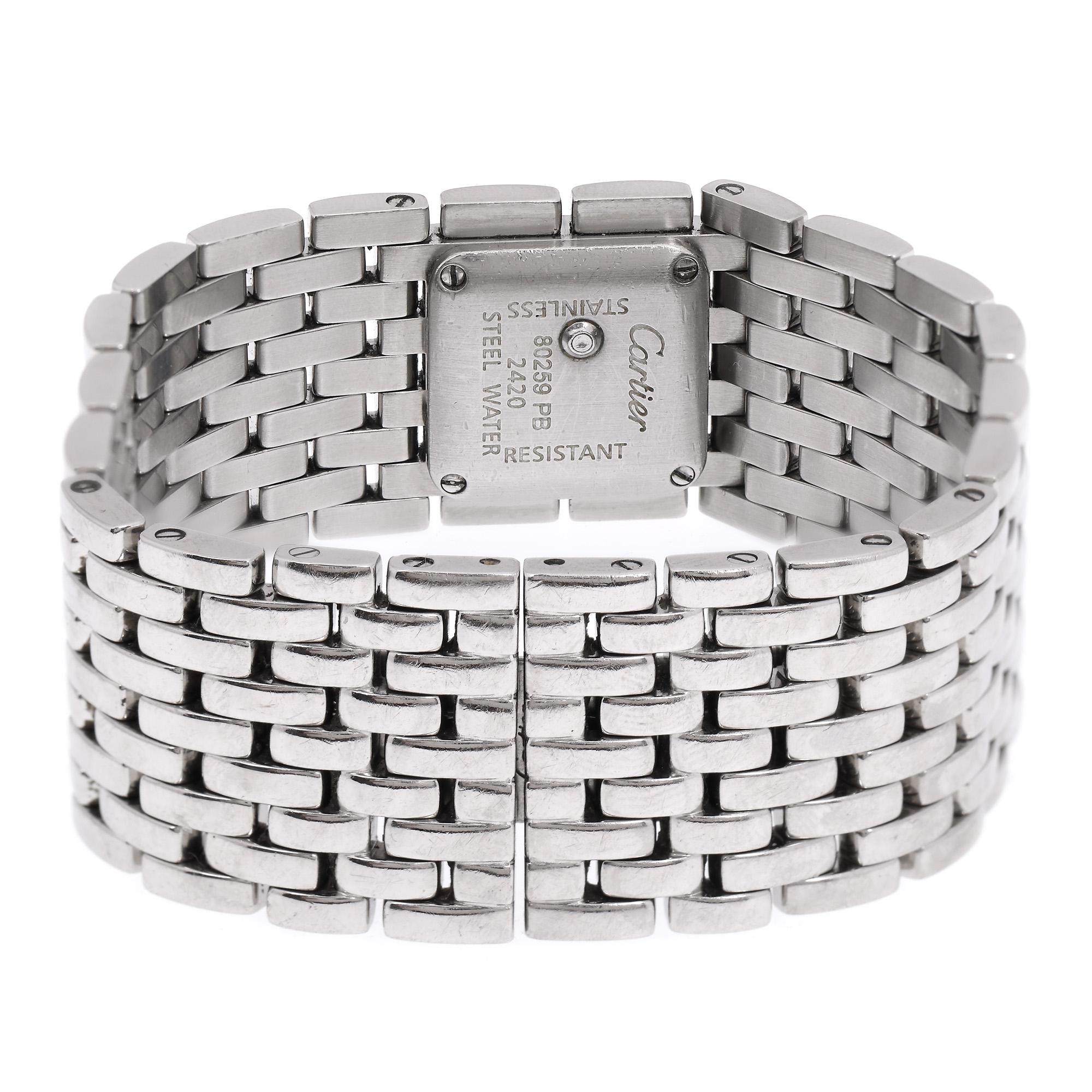 Ceas Cartier Panthere, de mână, de damă, referință 2420. Mecanism quartz. Cadran din sidef cu indici numerale romane. Brățară originală, din oțel, cu sistem de închidere tip deployant.