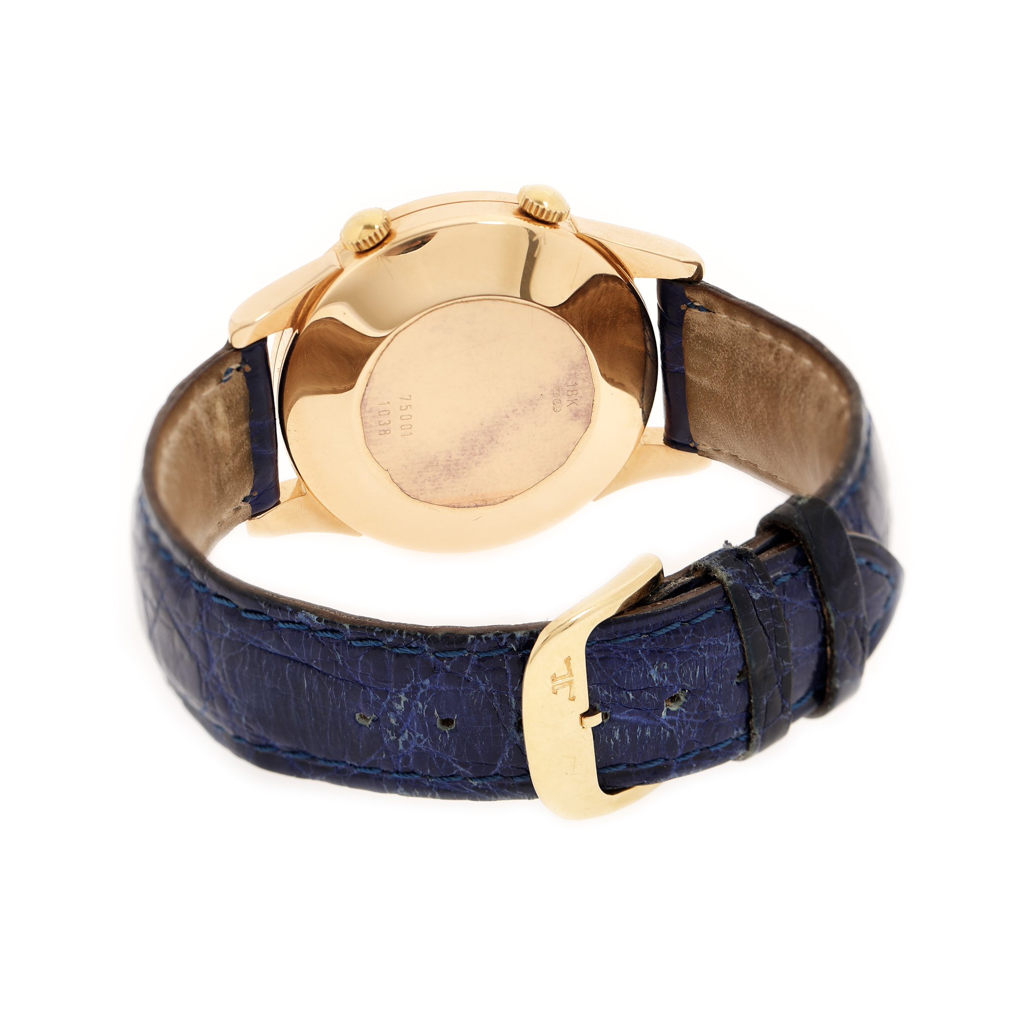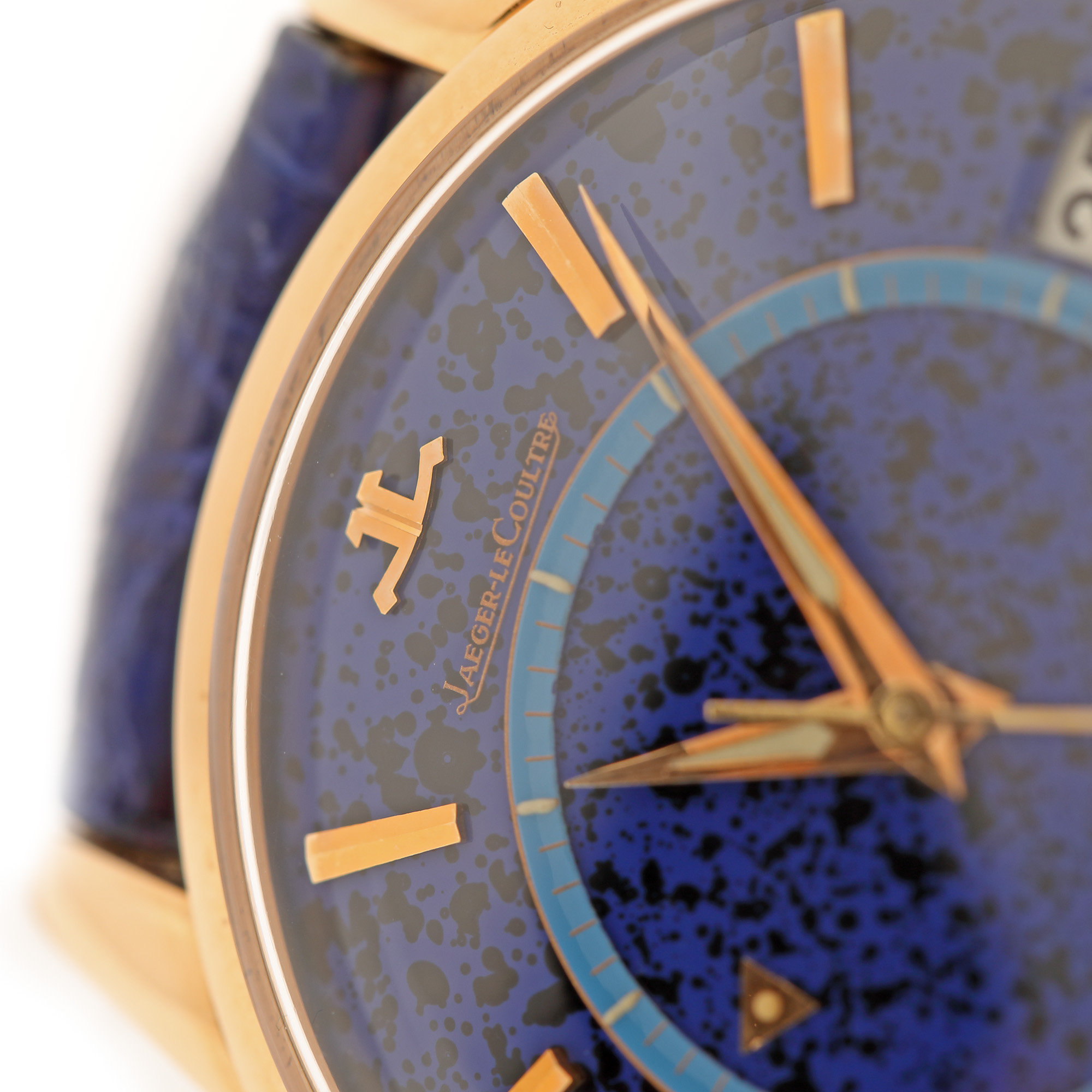 Ceas Jaeger LeCoultre Memovox, din aur, de mână, bărbătesc, referință E855. Mecanism automatic, calibrul JLC K825, cu funcție de alarmă. Cadran foarte rar, de culoare albastru, din piatră lapis lazuli, cu registru circular, central și mobil pentru reglarea alarmei, cu indici baghete din aur, registru rectangular pentru dată în dreptul orei 3. Curea din piele de culoare albastră, adăugată aftermarket cu sistem de închidere clasic cu cataramă originală din aur.