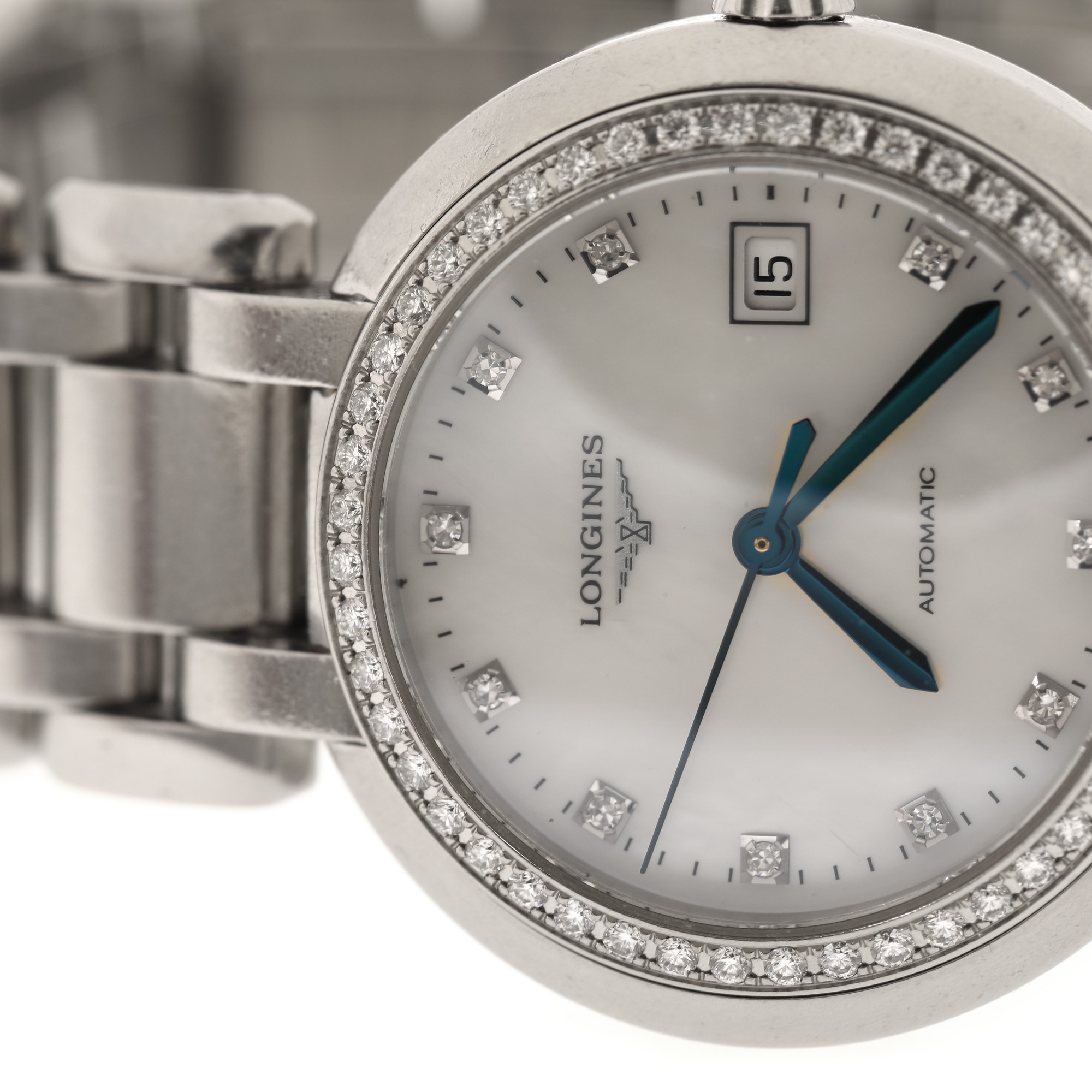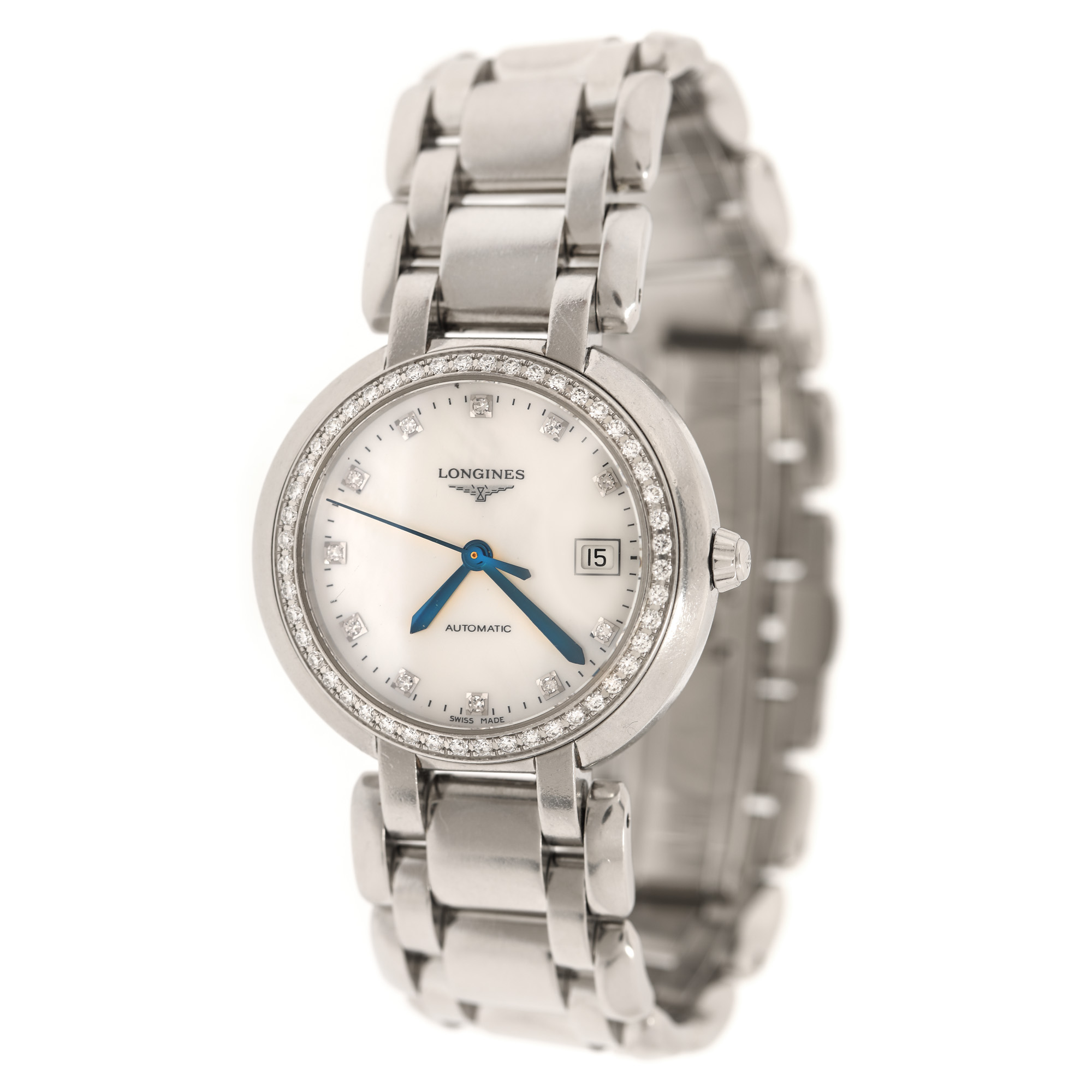 Ceas Longines Primaluna, cu diamante, de mână, de damă, referință L8.113.0. Mecanism automatic, bezel acoperit integral cu diamante. Cadran din sidef, cu indici diamante, registru pentru dată în dreptul orei 3. Brățara originală cu sistem de închidere de tip deployant