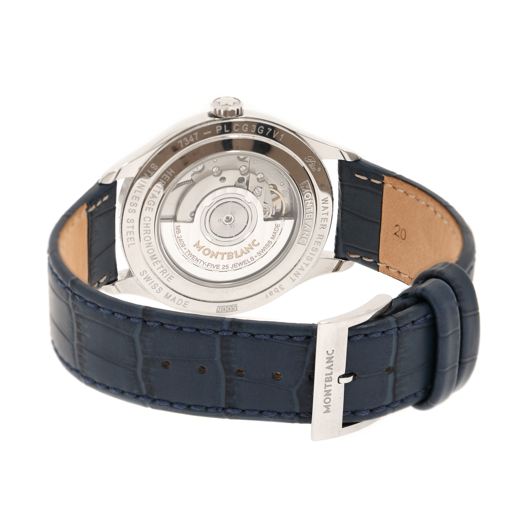 Ceas Montblanc Heritage Chronometrie, de mână, bărbătesc, referință 112533. Mecanism automatic, calibrul MB 2409, cu 25 de rubine, anterior vitrat. Cadran de culoare argintiu cu indici numerale arabe pentru orele 3, 9 și 12 și baghete pentru restul orelor, cu registru pentru dată în dreptul orei 6. Curea din piele, adăugată aftermarket, de culoare albastră, cu sistem de închidere clasic cu catarama originală. Accesorii: cutia originală, curea originală din piele de aligator de culoare neagră.