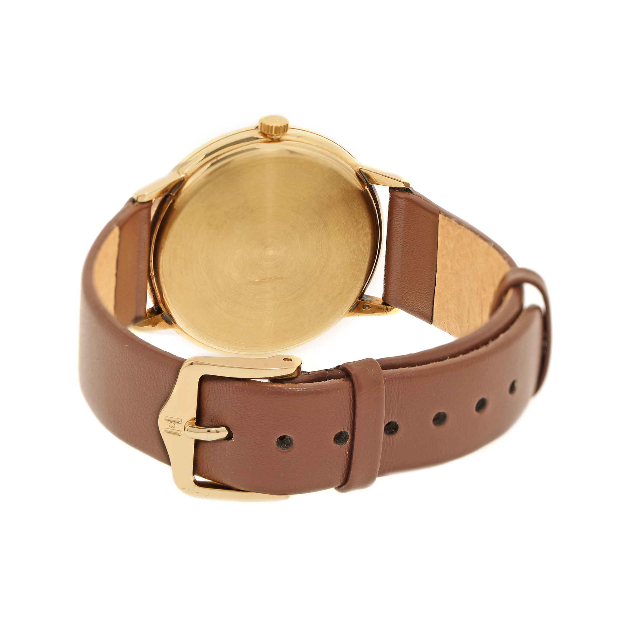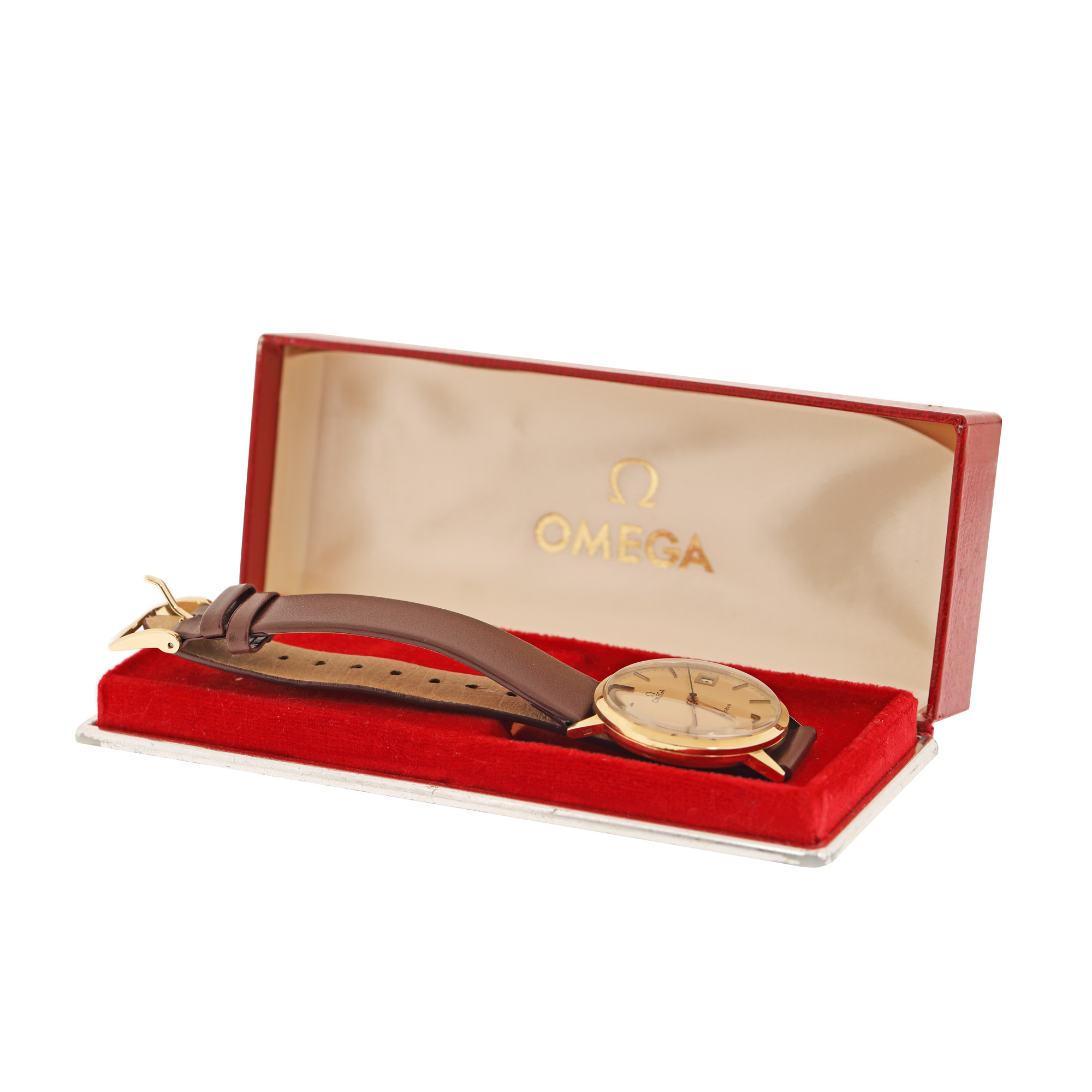 Ceas Omega Geneve, din aur, de mână, bărbătesc. Mecanism cu armare manuală, calibrul 1030. Cadran de culoare auriu șampanie, cu indici baghete și registru pentru dată în dreptul orei 3. Curea din piele cu sistem de închidere clasic adăugată aftermarket. Vine însoțit de cutia originală.