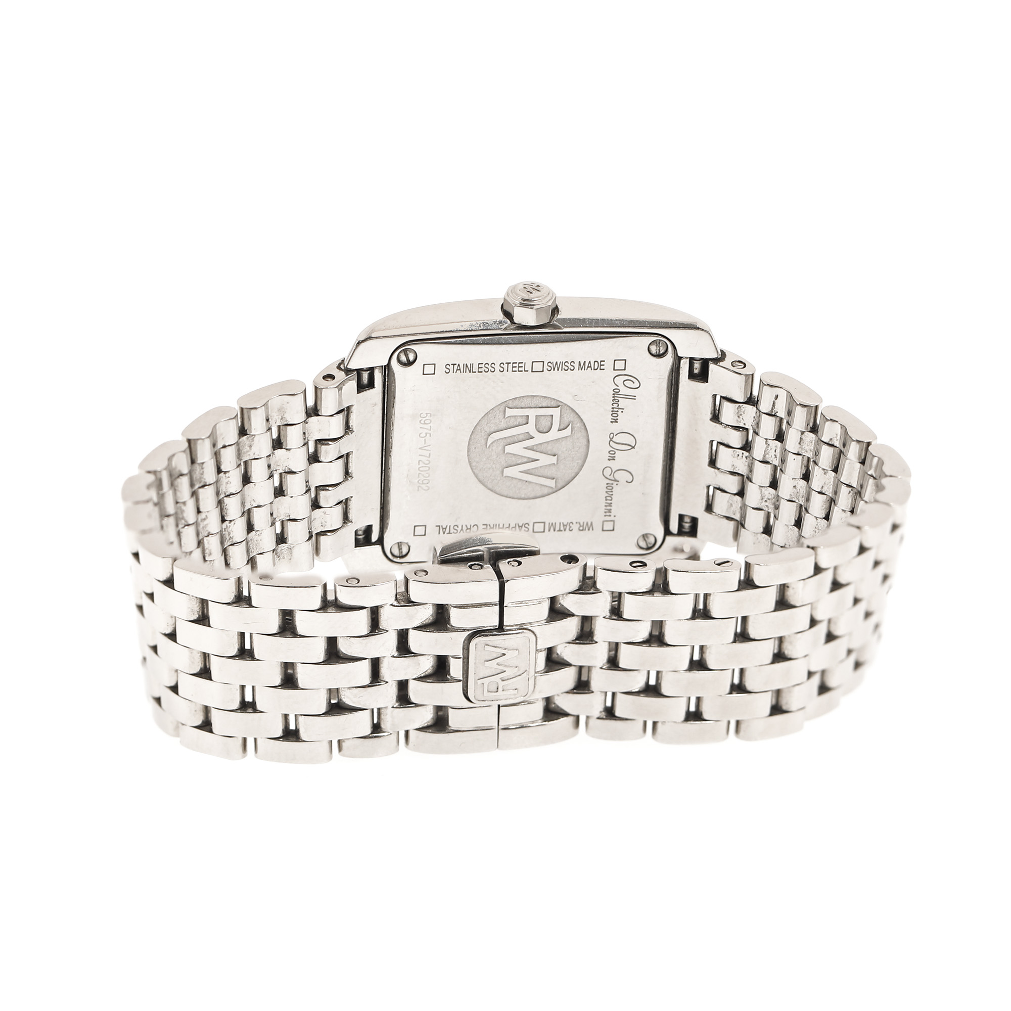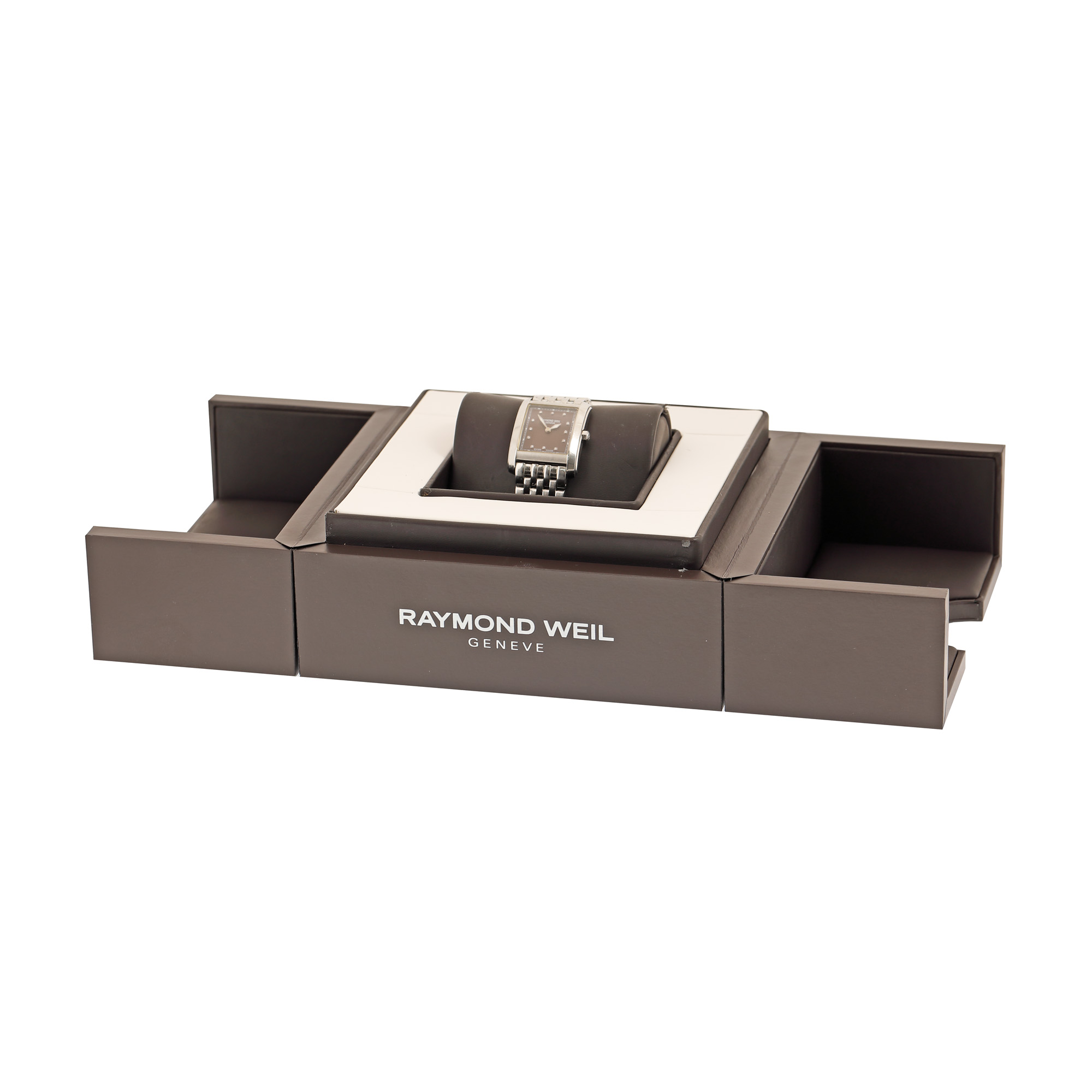 Ceas Raymond Weil, colecția Don Giovanni, cu diamante, de mână, de damă, referință 5975-ST-70081. Mecanism quartz. Cadran de culoare antracit cu indici diamante. Brățară originală, din oțel cu sistem de închidere de tip deployant. Accesorii: cutia originală, acte de proveniență, certificat de autenticitate, card de garanție datat 31.8.2012, instrucțiuni de folosire, patru zale suplimentare pentru brățară.
