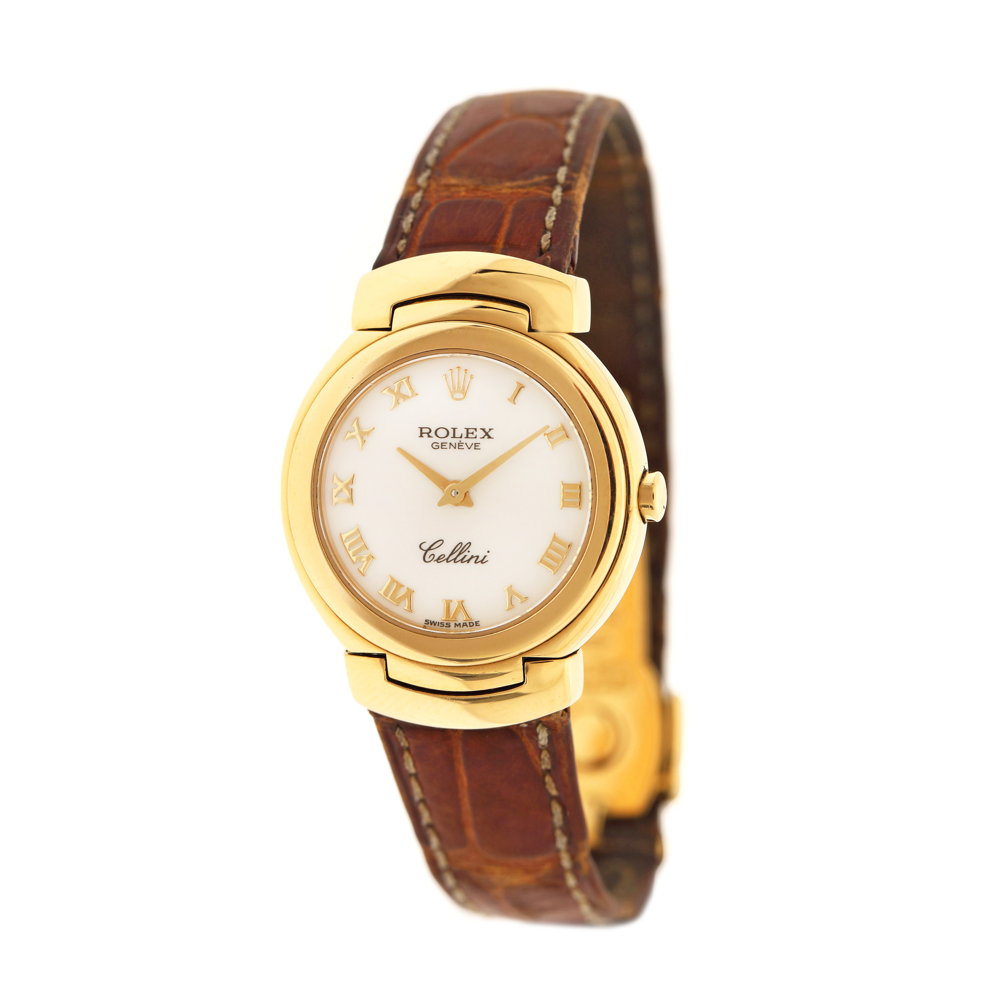Ceas Rolex Cellini, din aur, de mână, de damă, referință 6621. Cadran de culoare alb, indici numerale romane. Curea originală, din piele, de culoare maro cu sistem de închidere de tip deployant.