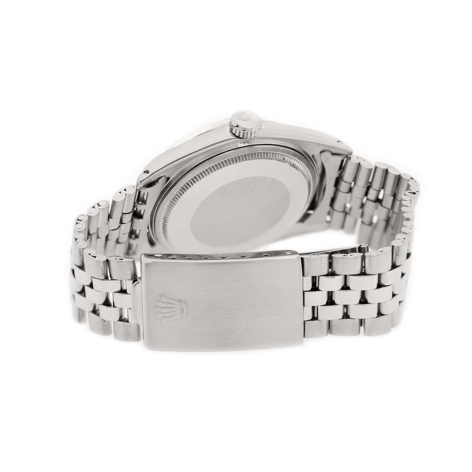 Ceas Rolex Datejust, de mână, bărbătesc, referință 1603. Mecanism automatic, calibrul 1570, cu 26 de rubine. Cadran de culoare argintiu, indici baghete, registru pentru dată, cu lupă, în dreptul orei 3. Brățară originală, din oțel, cu sistem de închidere de tip deployant.