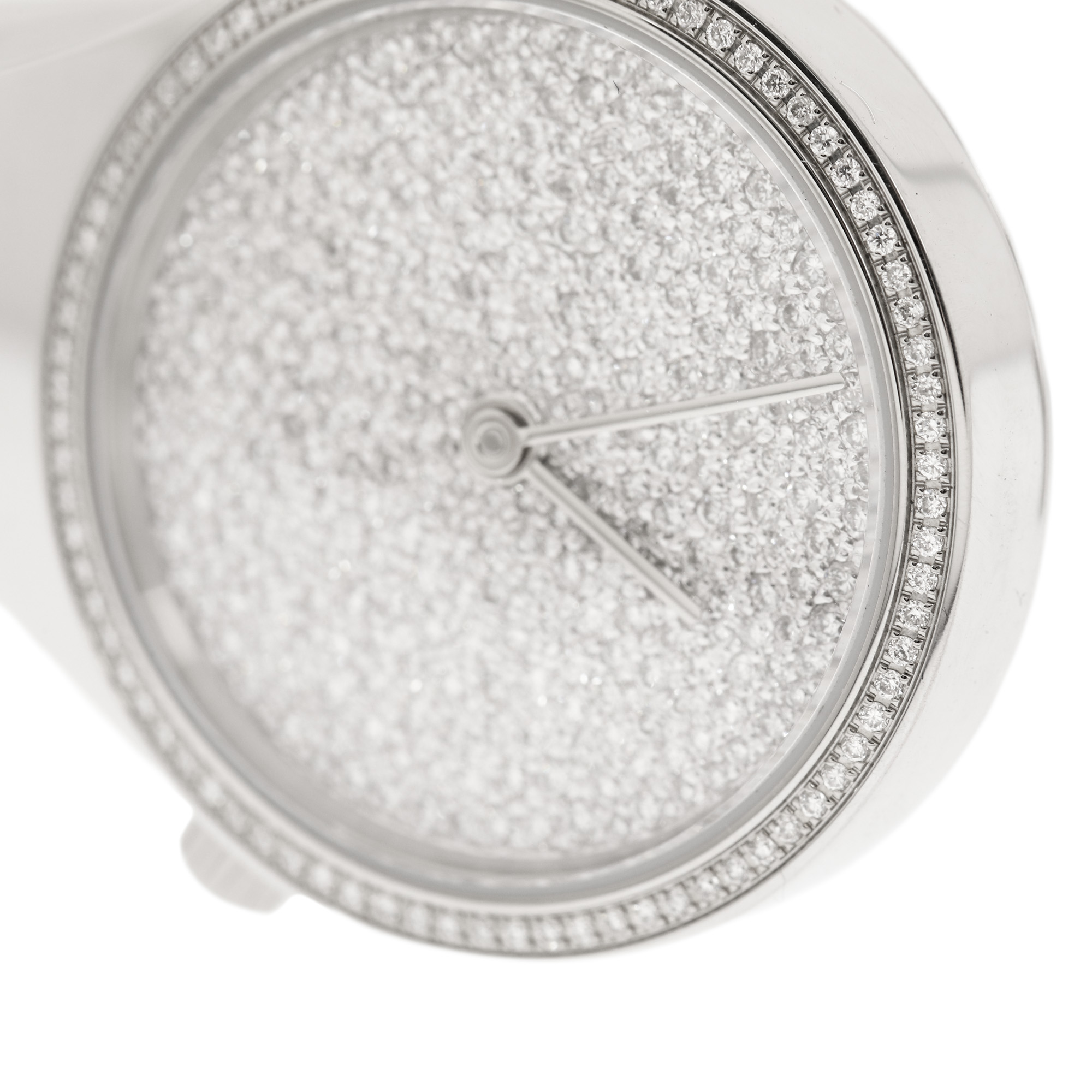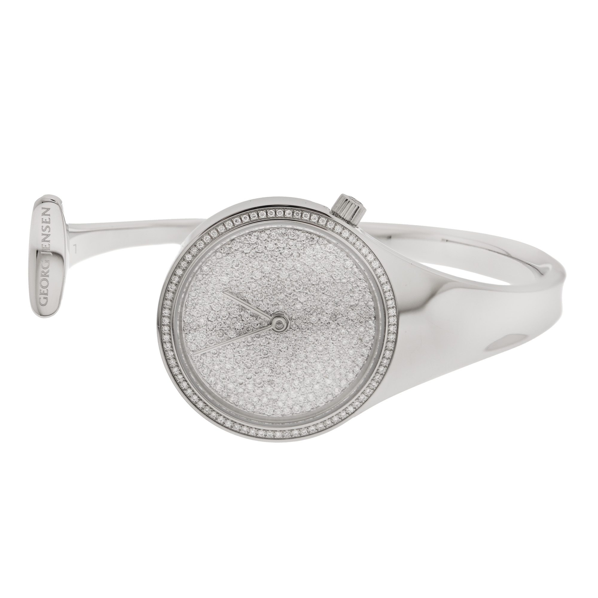 Ceas Georg Jensen din argint, ornat cu diamante, de mână, de damă, referință V2L-ST01. Mecanism quartz. Cadran pavat integral cu diamante fară indici. Cadranul și cureaua sunt monobloc. Accesorii: cutia originală și certificat de garanție datat 25.1.2018