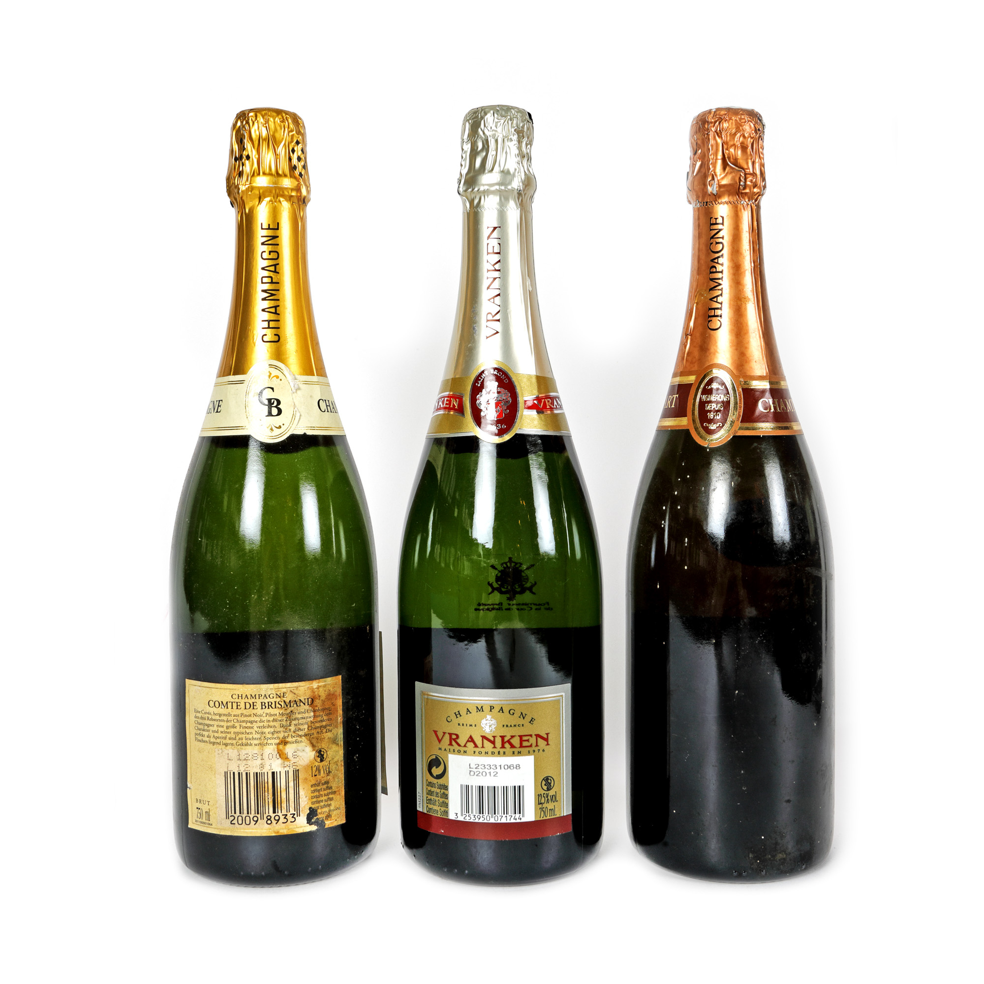 12. Champagne Vranken, Premier Cru, 2012, Champagne Fallet-Dart, 2006, Champagne Comte de Brismand, Brut Reserve, 3st x 0,75l