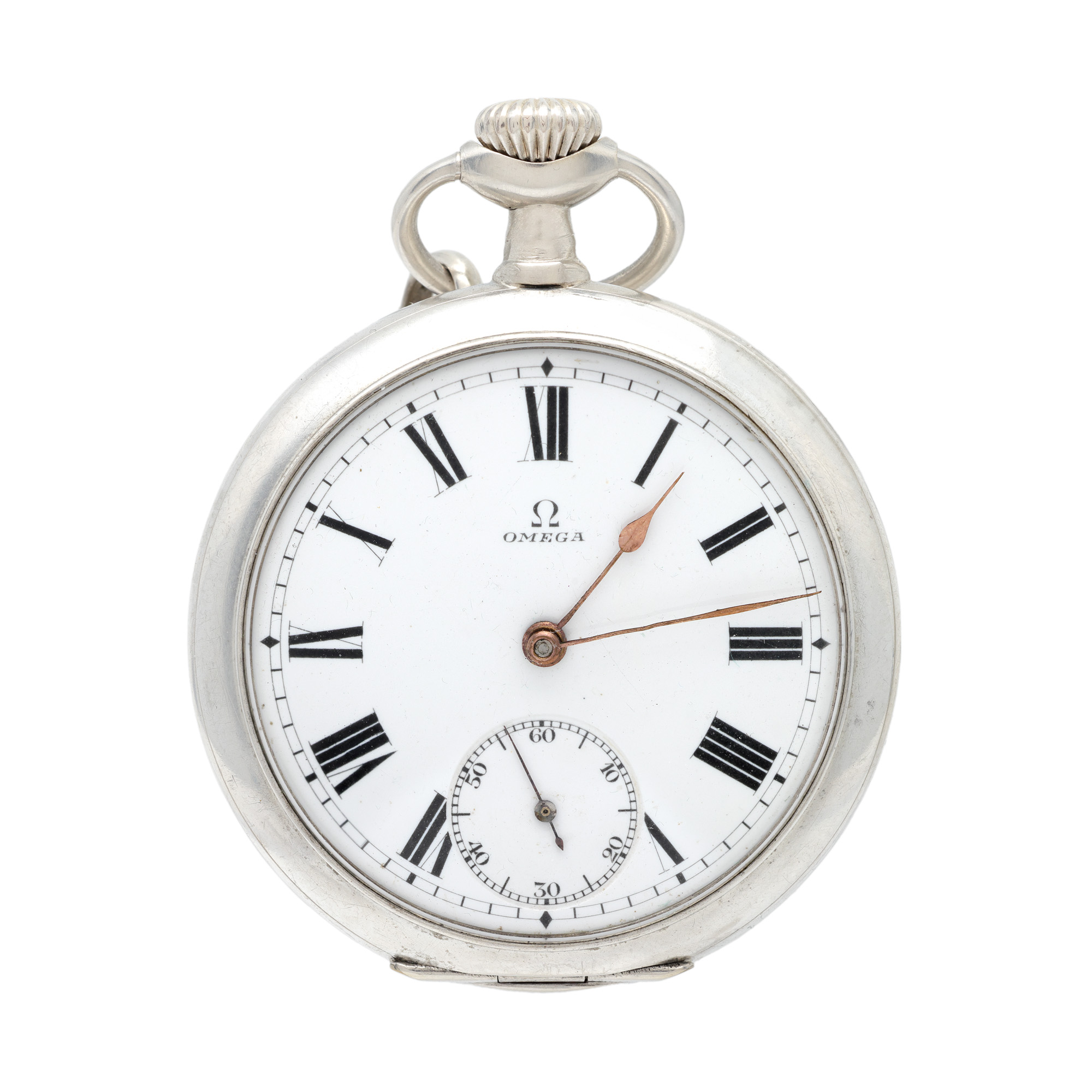 34. Ceas Omega, din argint, de buzunar, bărbătesc, însoțit de lanț și monede din argint [Cca. 1930]