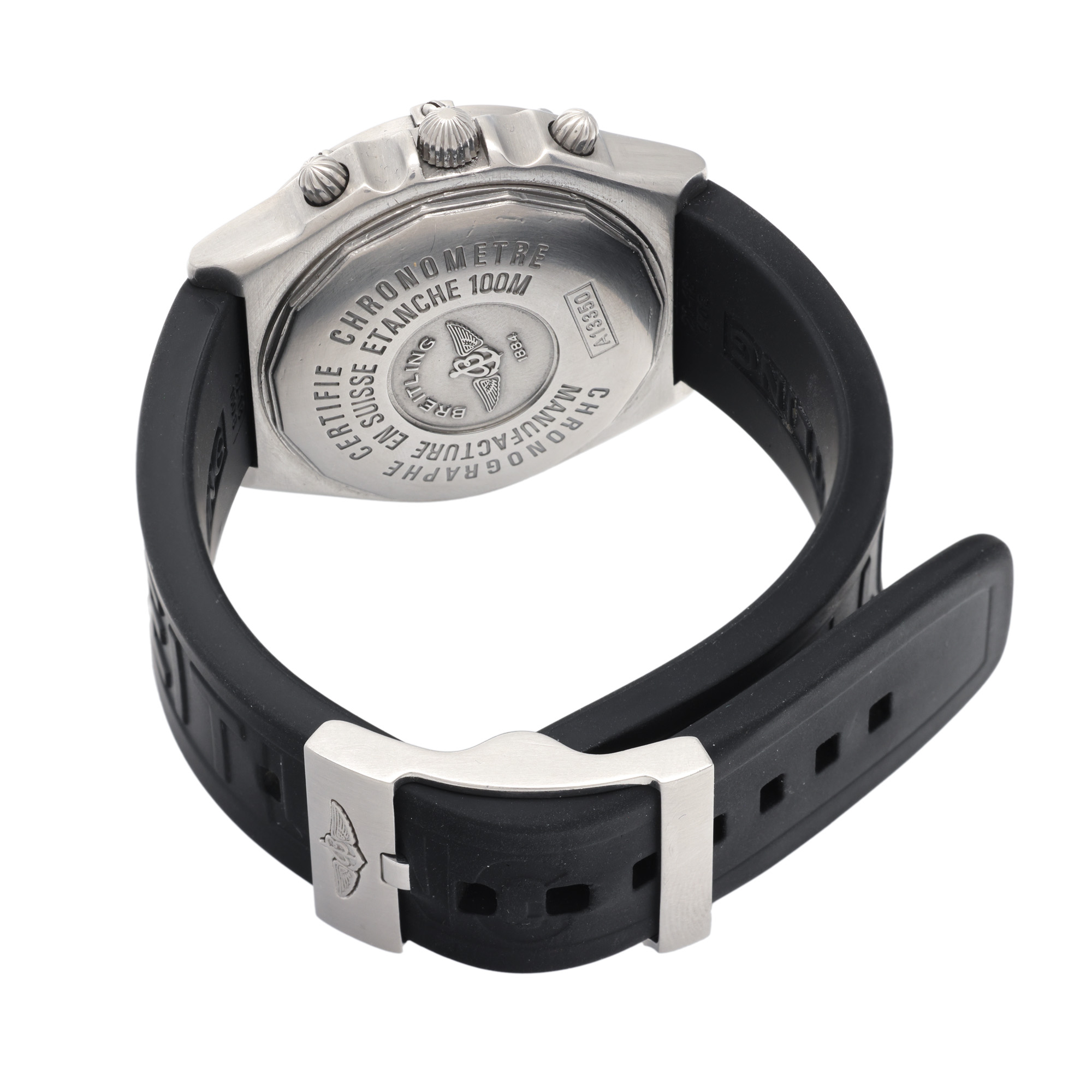 Ceas Breitling Chronomat Blackbird "Serie Speciale", de mână, bărbătesc, referință A13350. Mecanism automatic, calibrul Breitling 13, cu funcție de chronograph. Cadran de culoare negru, indici cu numerale arabe, cu un registru pentru dată în dreptul orei 3, două registre pentru funcția de chronograph în dreptul orelor 12 și 6 și un registru pentru secundar în dreptul orei 9. Curea originală, din cauciuc, de culoare neagră, cu sistem de închidere de tip clasic dublat.
