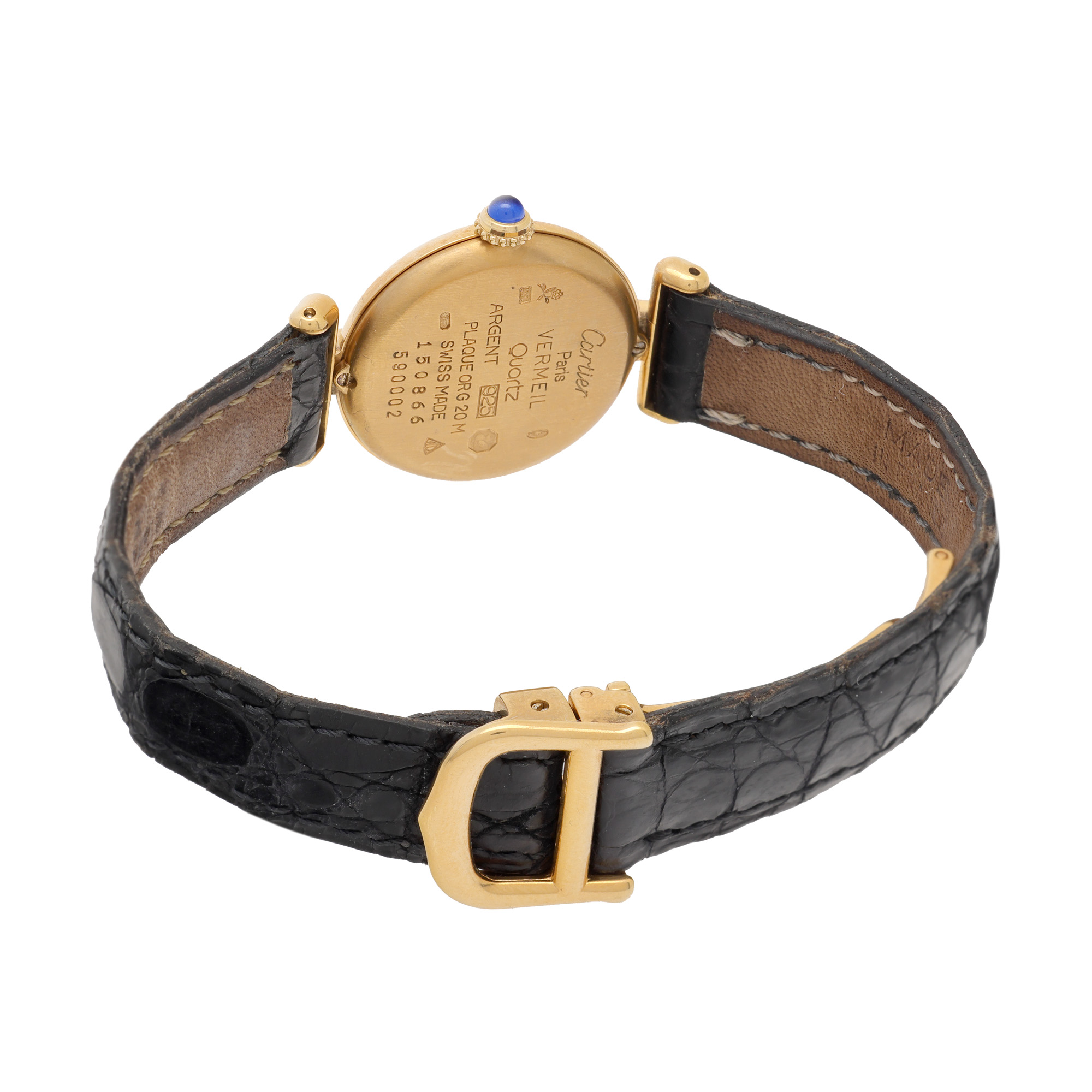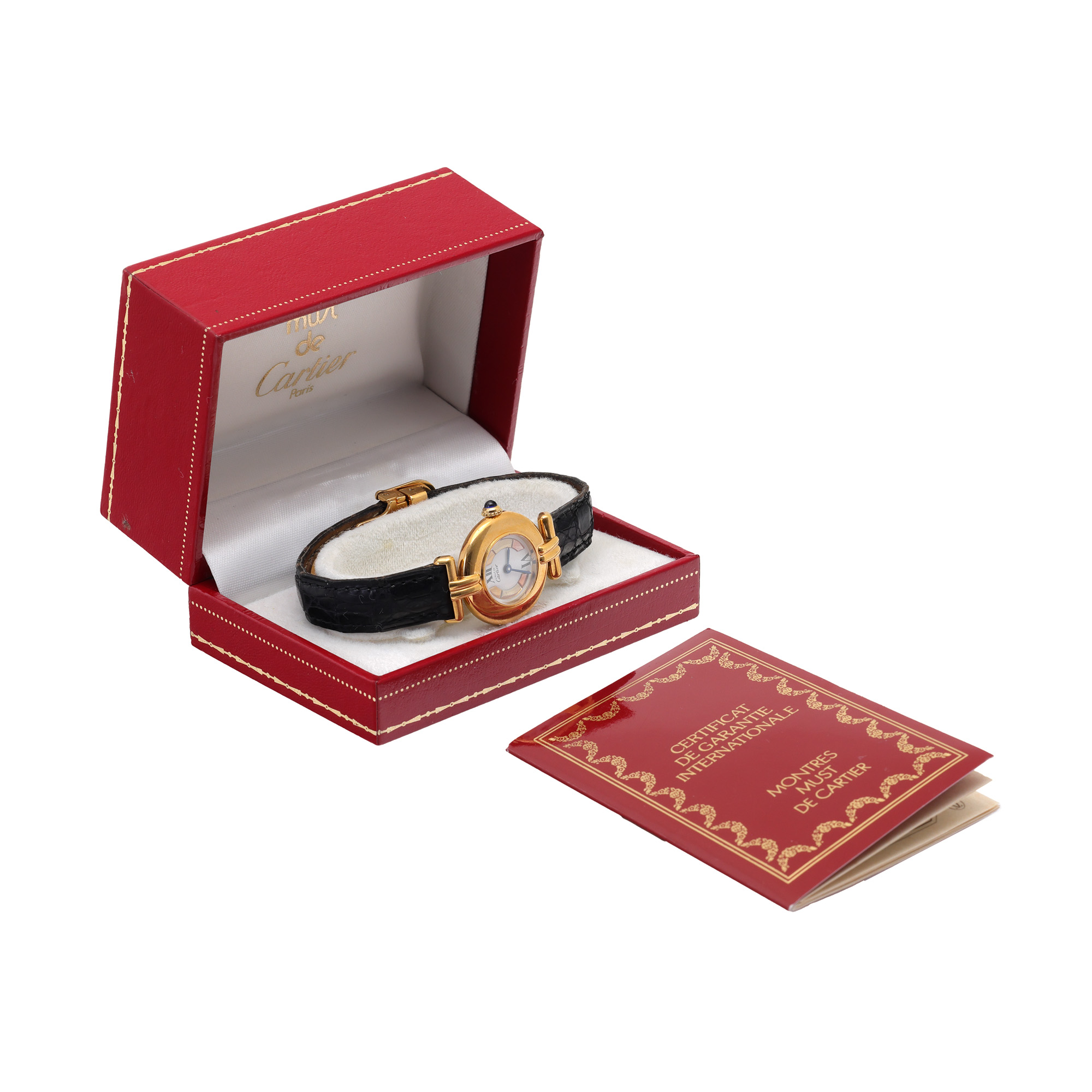 Ceas Cartier Must de Cartier Vermeil, din argint aurit, de mână, de damă. Mecanism quartz. Cadran de culoare alb, indici numerale romane pentru orele 6 și 12. Curea originală, din piele, de culoare neagră, cu sistem de închidere de tip deployant. Accesorii: cutie originală; certificat de garanție.