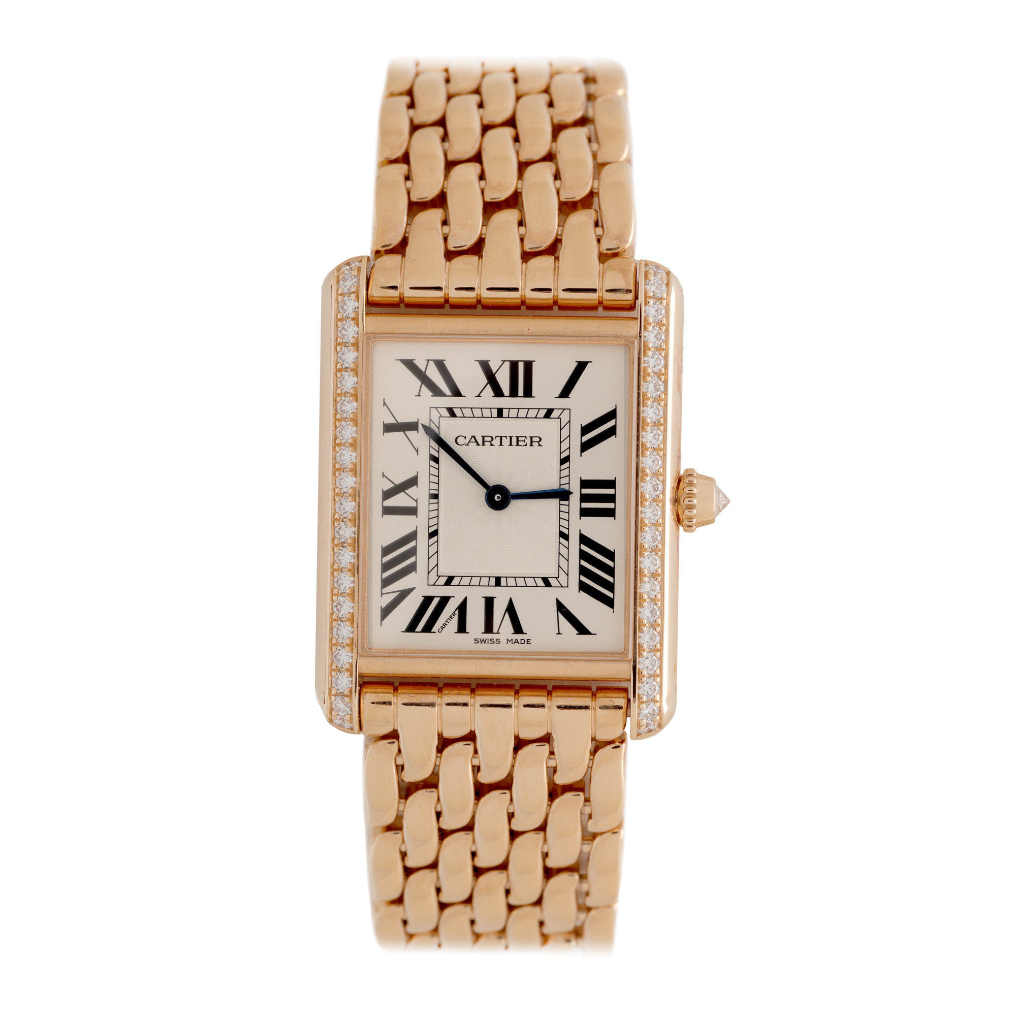 Ceas Cartier Tank, din aur roz, cu diamante, de mână, de damă, referință WJTA0021. Mecanism cu armare manuală, calibrul 1917 MC. Cadran de culoare alb, decorat în tehnica guilloche, indici cu numerale romane. Brățară originală, din aur roz, cu sistem de închidere de tip deployant. Accesorii: soluție de curățare, cutia originală.