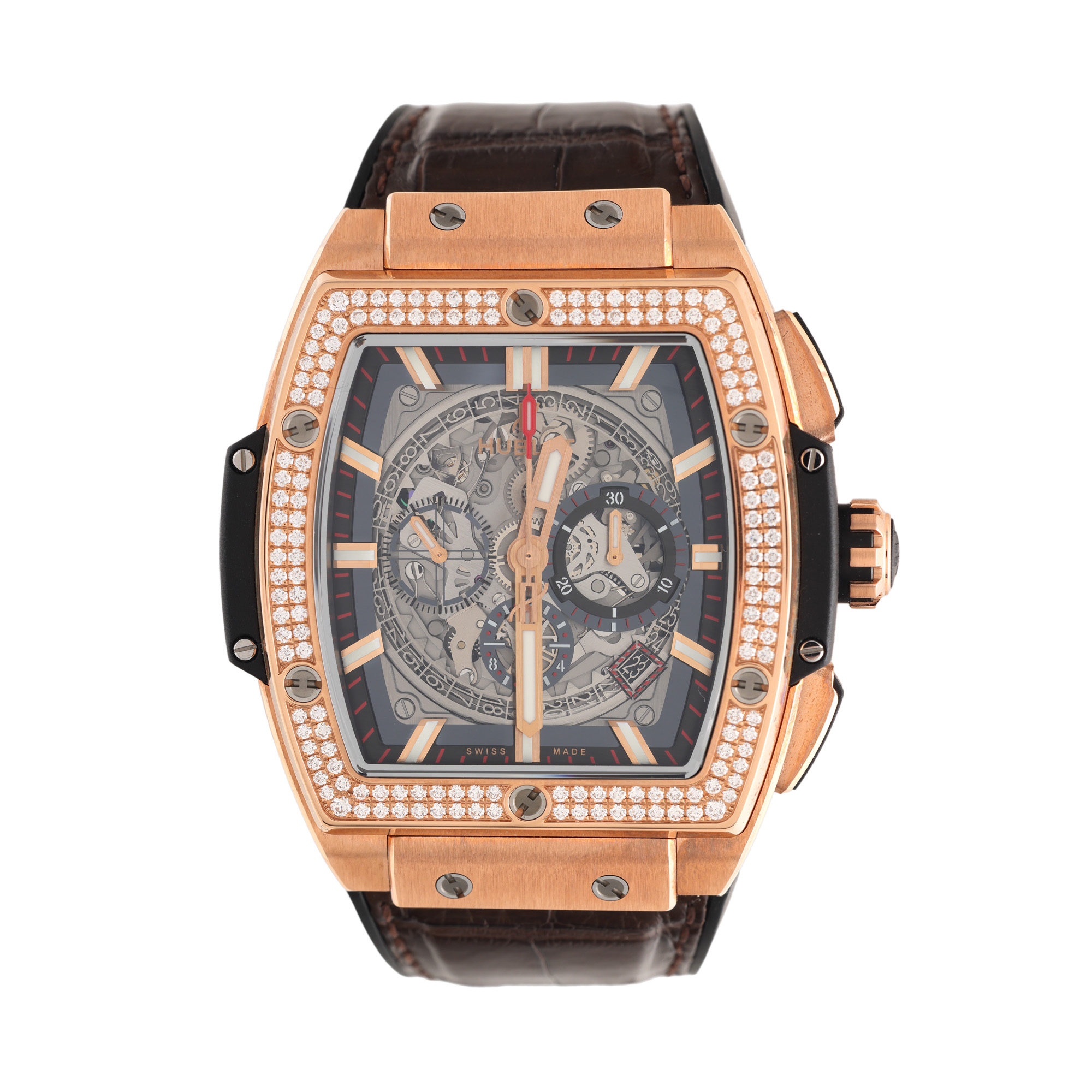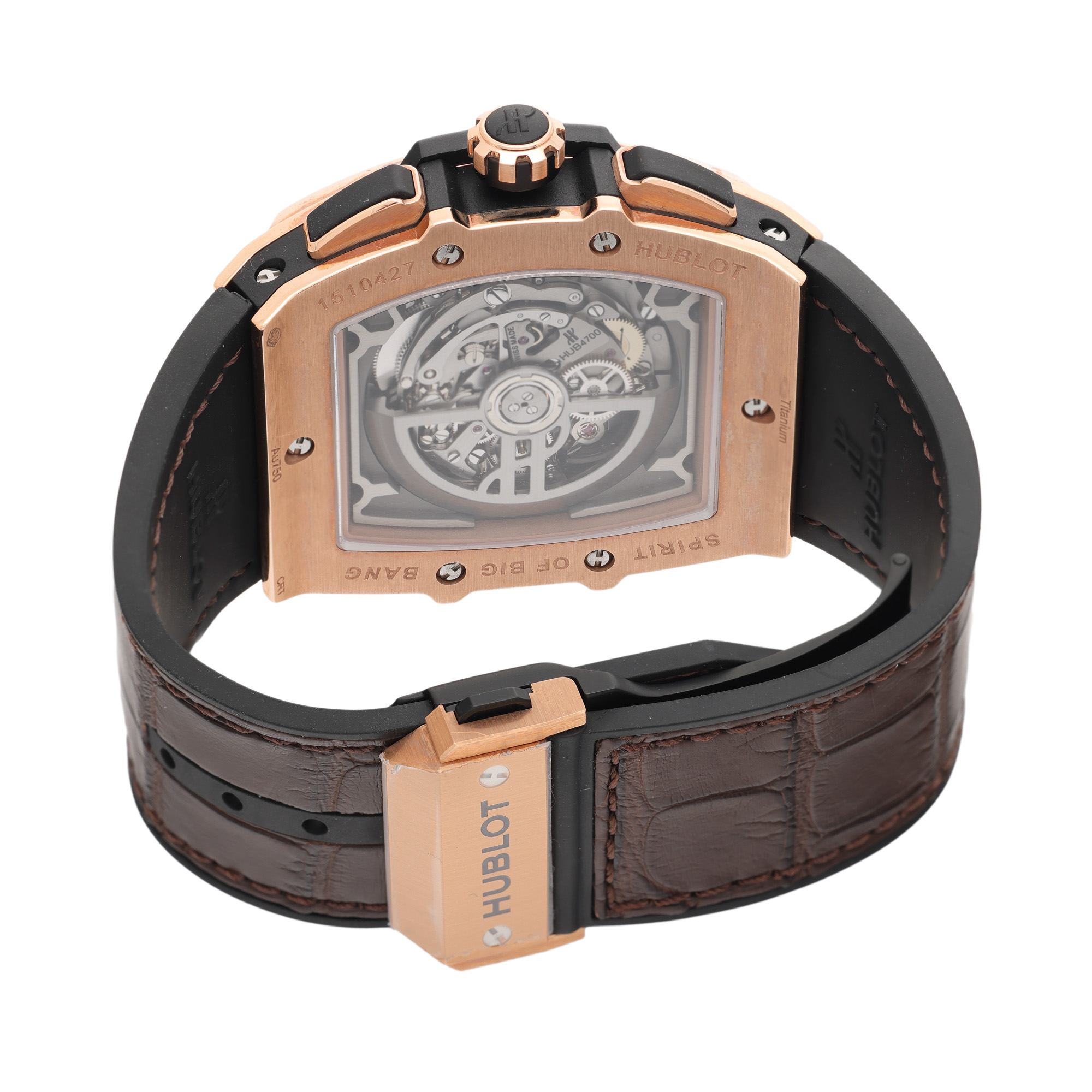 Ceas Hublot Spirit of Big Bang, din aur roz și titan, cu diamante, de mână, bărbătesc, referință 601.OX.0183.LR.1104. Mecanism automatic, calibrul HUB 4700, anterior vitrat, cu funcție de chronograph. Cadran de tip skeleton, indici baghetă aplicați, cu un registru pentru dată în dreptul orei 4:30, un registru pentru secundar în dreptul orei 9 și două registre pentru funcția de chronograph în dreptul orelor 3 și 6. Curea originală, din piele de culoare maro și cauciuc, cu sistem de închidere de tip deployant din aur roz și titan. Accesorii: cutia originală.