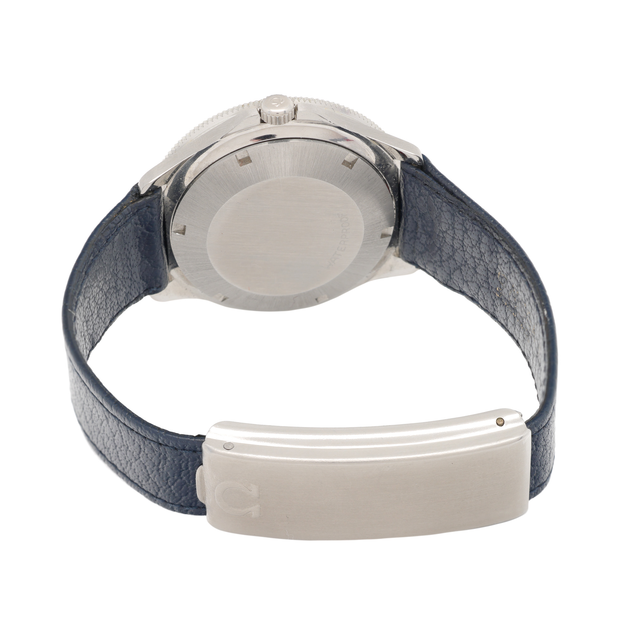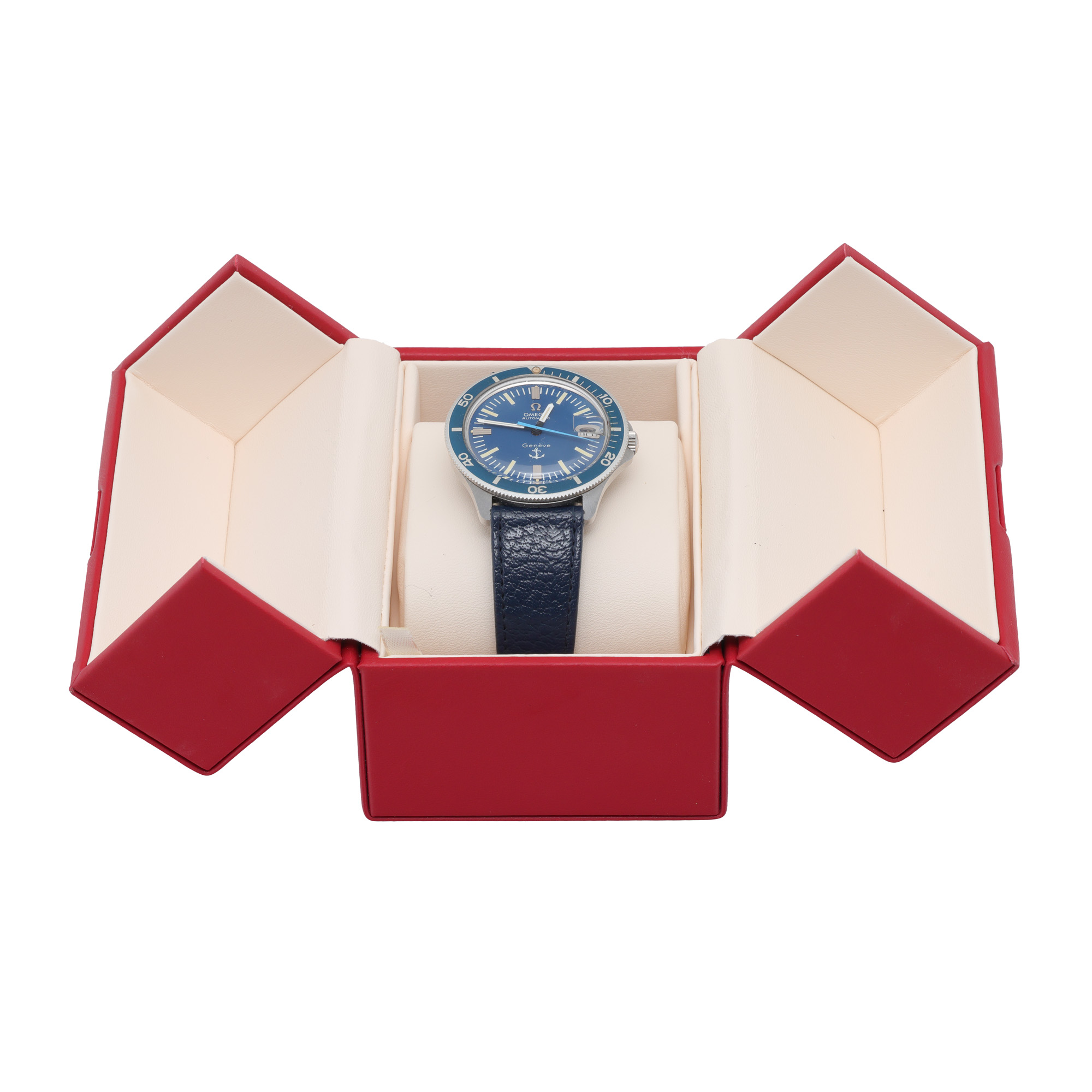 Ceas Omega Admirality Diver, NOS, de mână, bărbătesc, referință 166.054. Mecanism automatic, calibrul 565. Cadran de culoare albastru, indici dreptunghiulari, cu un registru pentru dată cu lupă în dreptul orei 3. Curea originală, din piele, de culoare albastră, cu sistem de închidere de tip deployant. Accesorii: cutie originală.