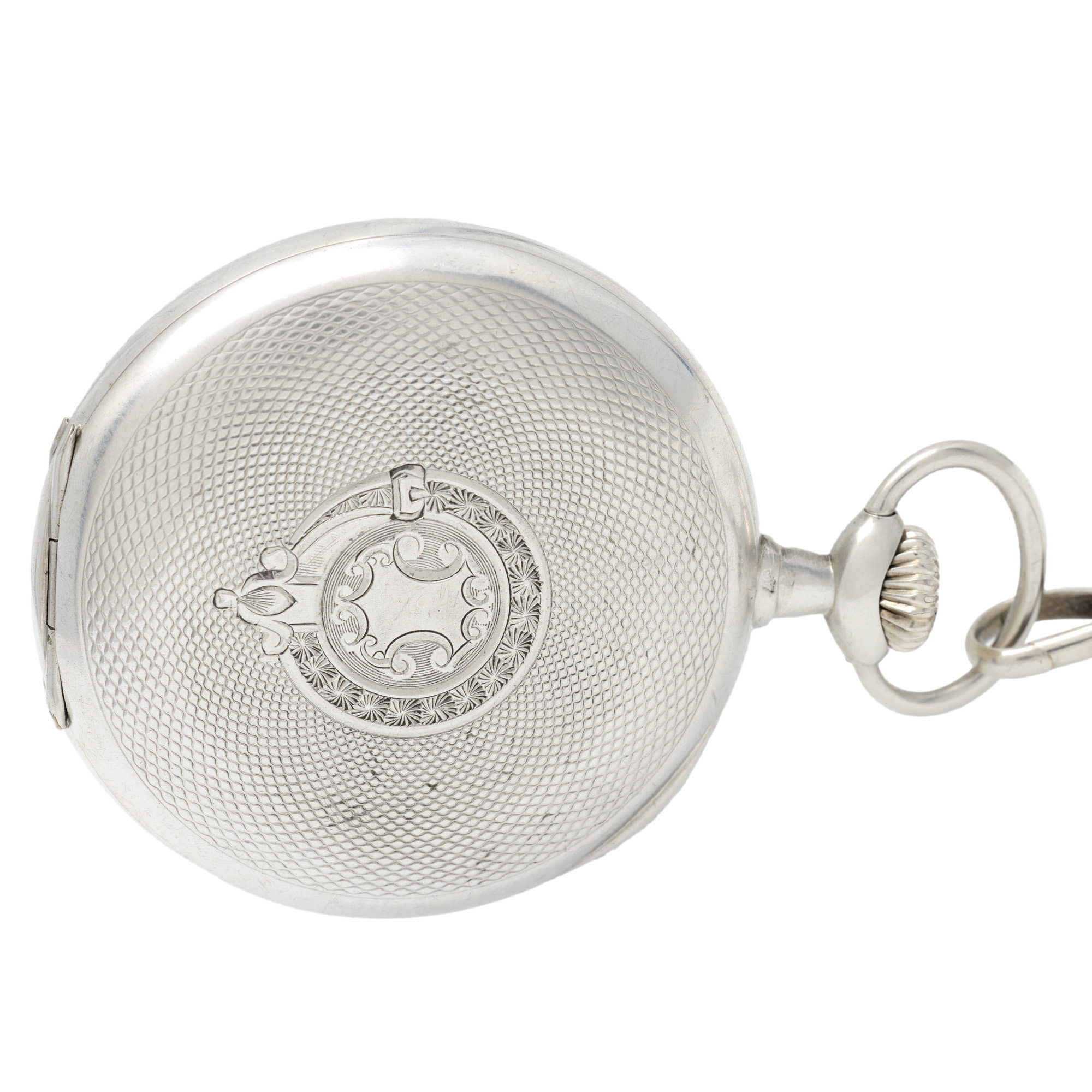 Ceas Omega, din argint, de buzunar, bărbătesc. Mecanism cu armare manuală. Cadran de culoare alb, indici numerale romane, registru pentru secundar în dreptul orei 6. Accesorii: lanț și monede din argint.