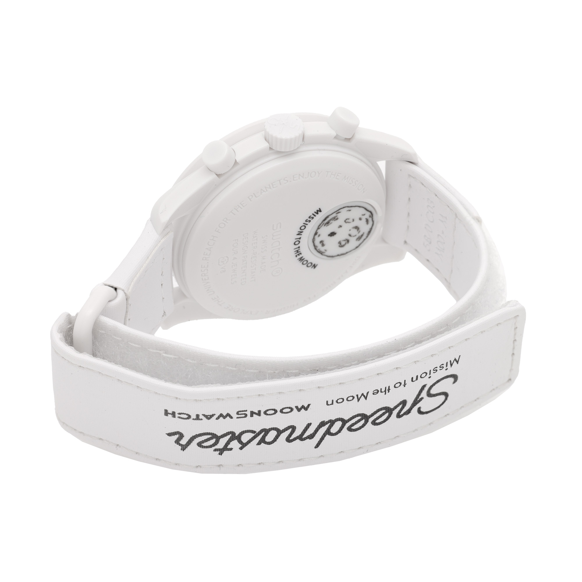 Ceas Omega MoonSwatch Mission to the Moonphase, de mână, unisex, referință SO33W700. Mecanism quartz, calibrul G10.212, cu funcție de chronograph și calendar. Cadran de culoare alb, indici liniari, cu un registru dublu pentru calendar în dreptul orei 2, un registru pentru secundar în dreptul orei 6 și un registru pentru funcția de chronograph în dreptul orei 9. Curea originală, din material textil, cu sistem de închidere velcro. Accesorii: cutia originală.