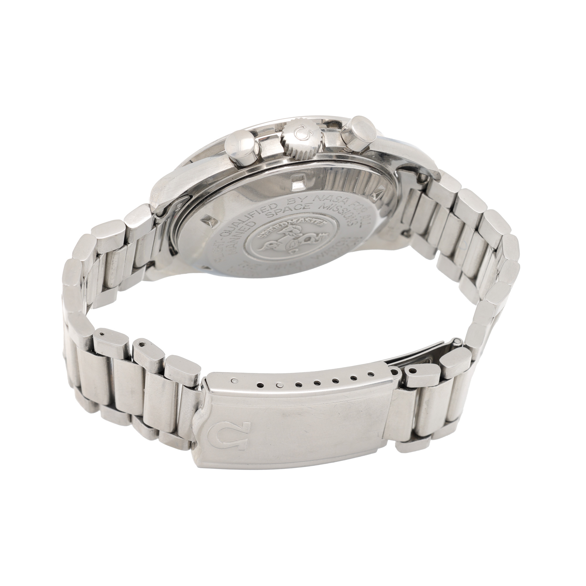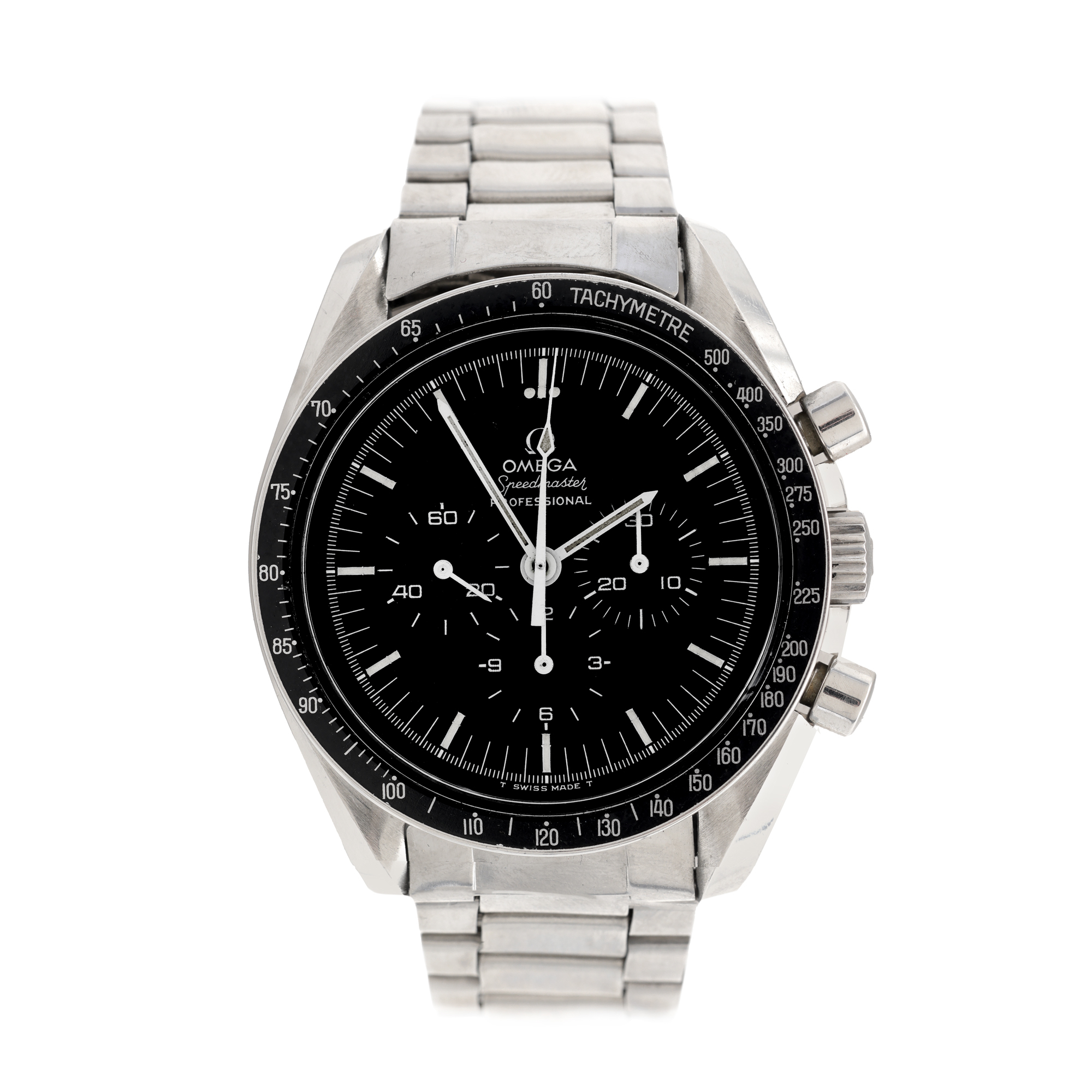 Ceas Omega Speedmaster Professional Moonwatch, de mână, bărbătesc, referință 145.022. Mecanism cu armare manuală, calibrul 861, cu funcție de chronograph. Cadran de culoare negru, indici baghetă, registru pentru secundar în dreptul orei 9, două registre pentru secundar în dreptul orelor 3 și 6. Brățară originală, din oțel, cu sistem de închidere de tip deployant. Accesorii: toc de călătorie original.