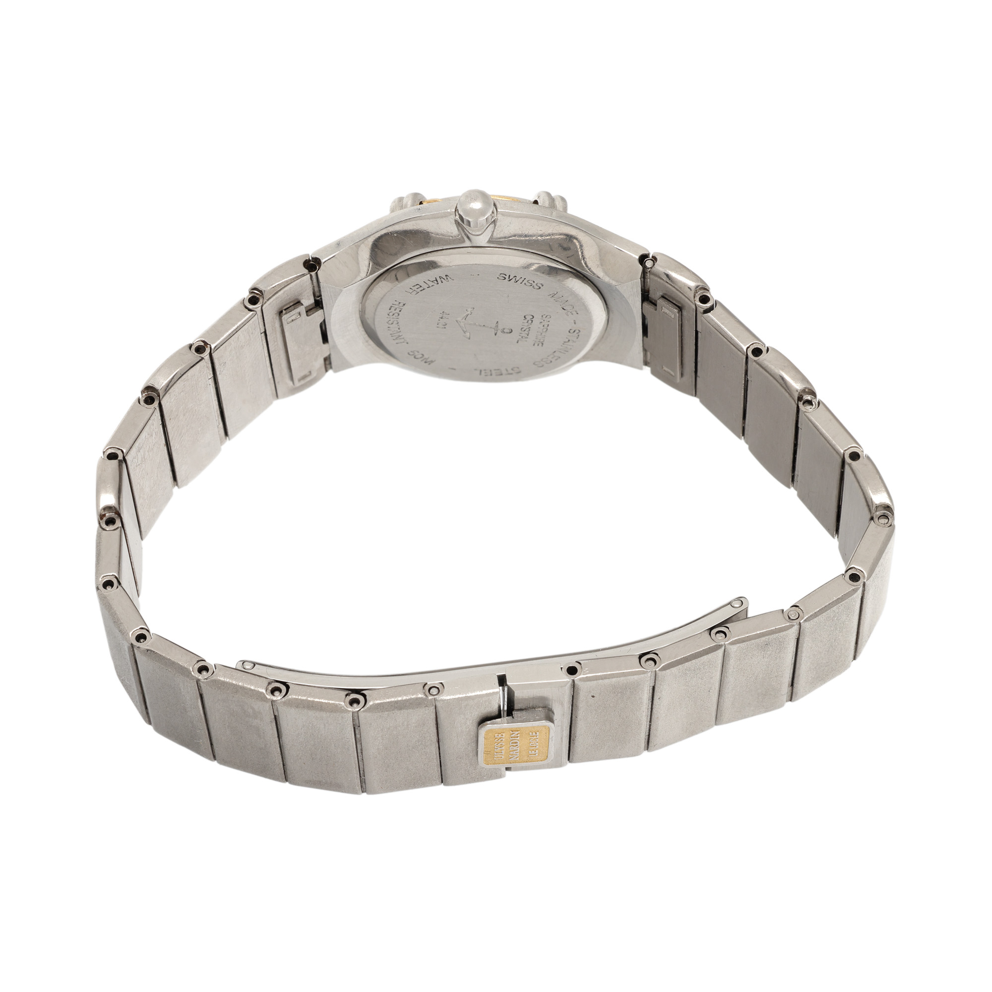 Ceas Ulysse Nardin La Chain, din aur și oțel, cu diamante, de mână, de damă, referință 4421. Mecanism quartz, calibrul 966. Cadran de culoare alb, indici punctați cu diamante, cu un registru pentru dată în dreptul orei 3. Brățară originală din oțel inoxidabil, cu sistem de închidere de tip deployant.