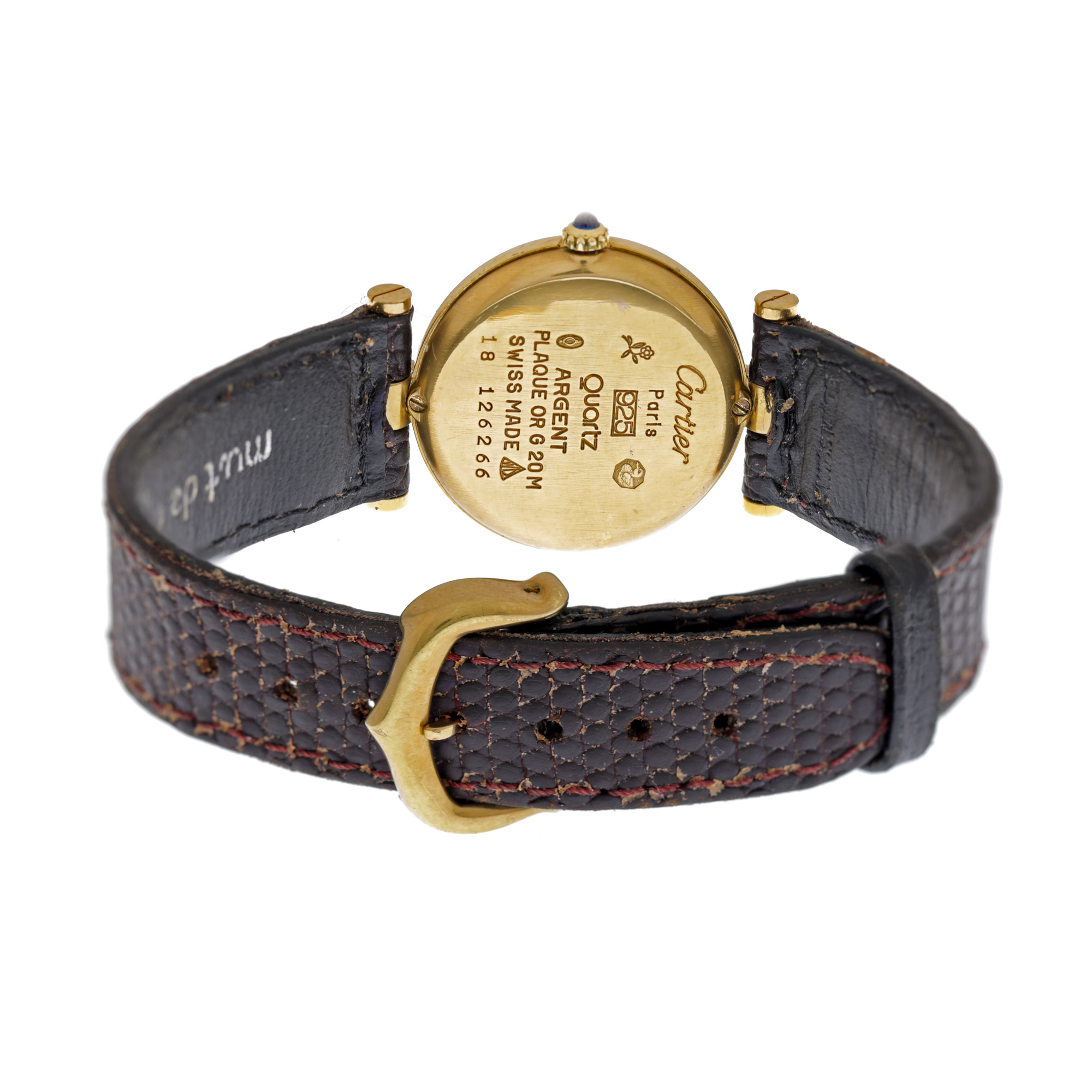 Ceas Cartier Must de Cartier, din argint placat cu aur, de mână, de damă, referință 18130719. Mecanism quartz, calibrul 057. Cadran de culoare bordeaux, lipsit de indici. Curea originală, din piele, de culoare neagră, cu sistem de închidere de tip deployant.
