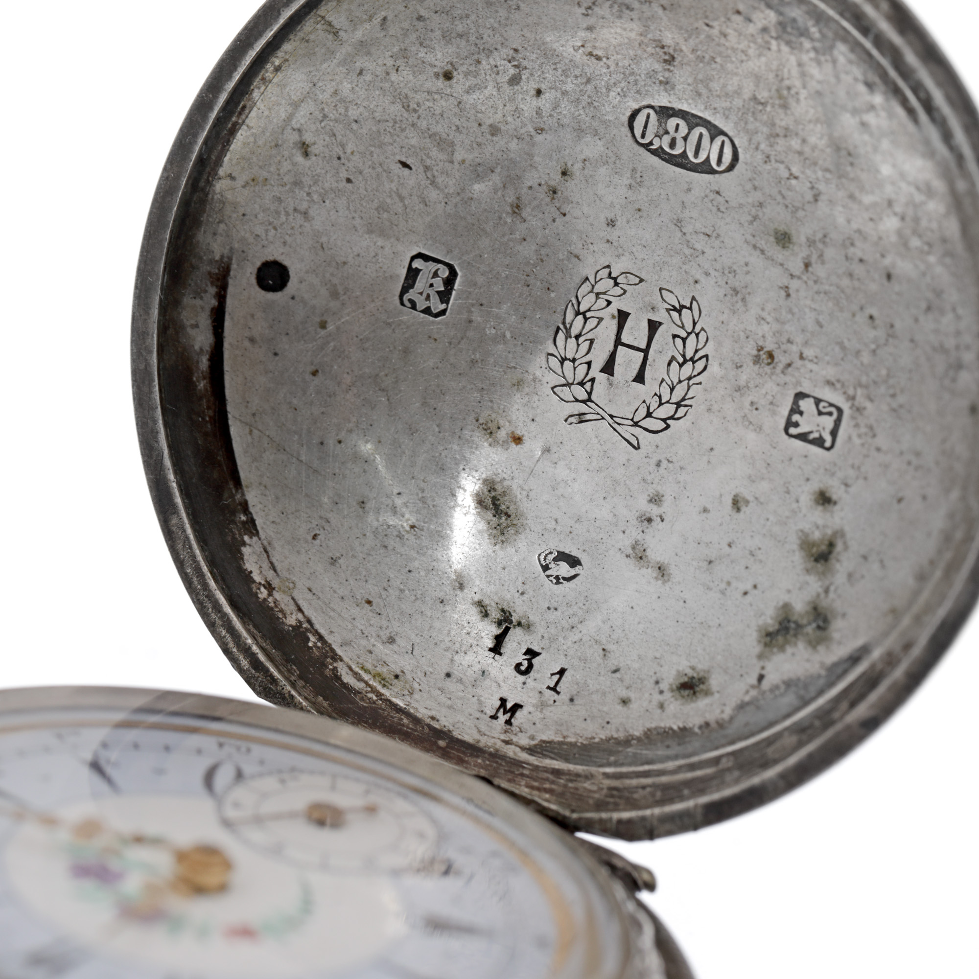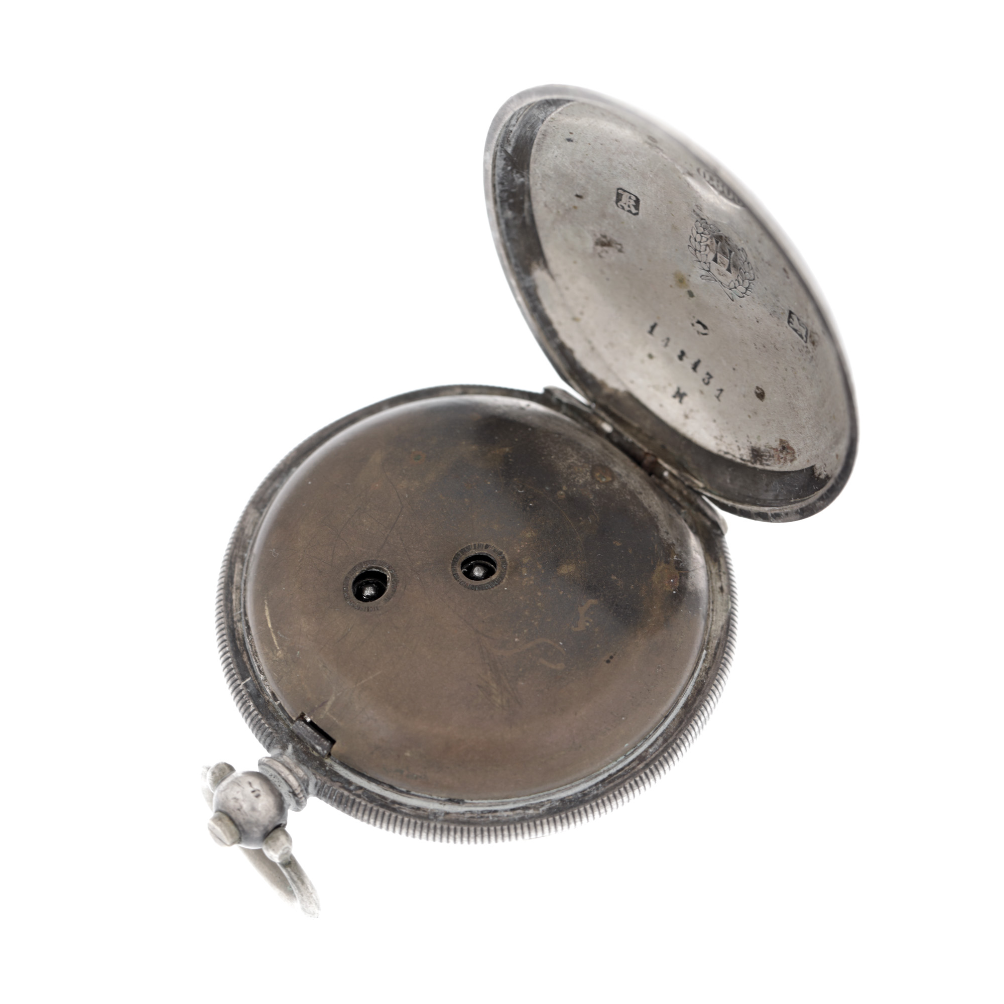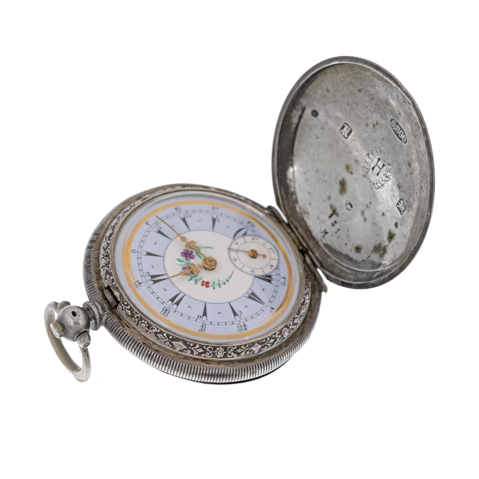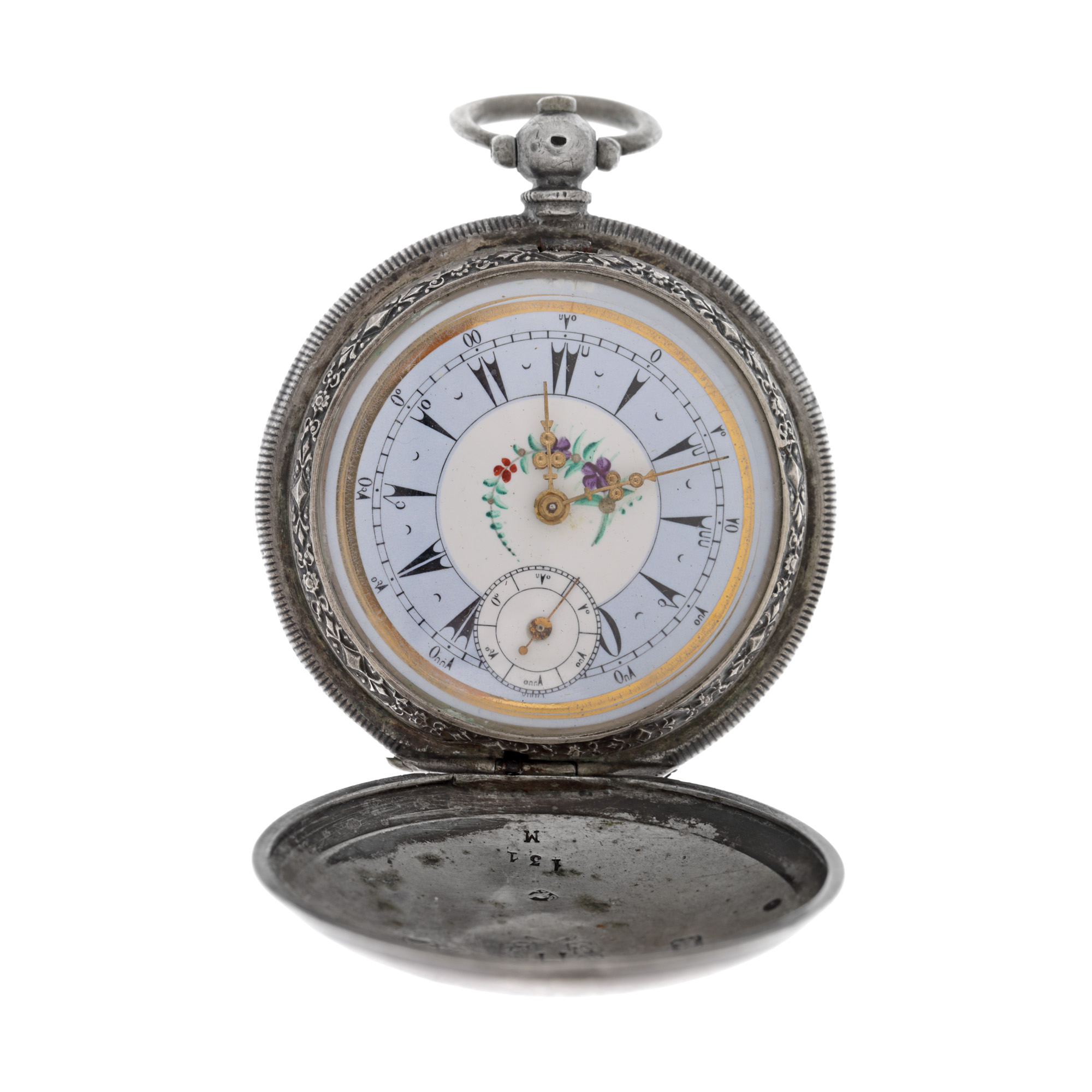Ceas J.Dent London, din argint, de buzunar, bărbătesc. Mecanism cu armare manuală. Cadran multicolor, indici săgeți, registru pentru secundar în dreptul orei 6. Mecanismul necesită revizie