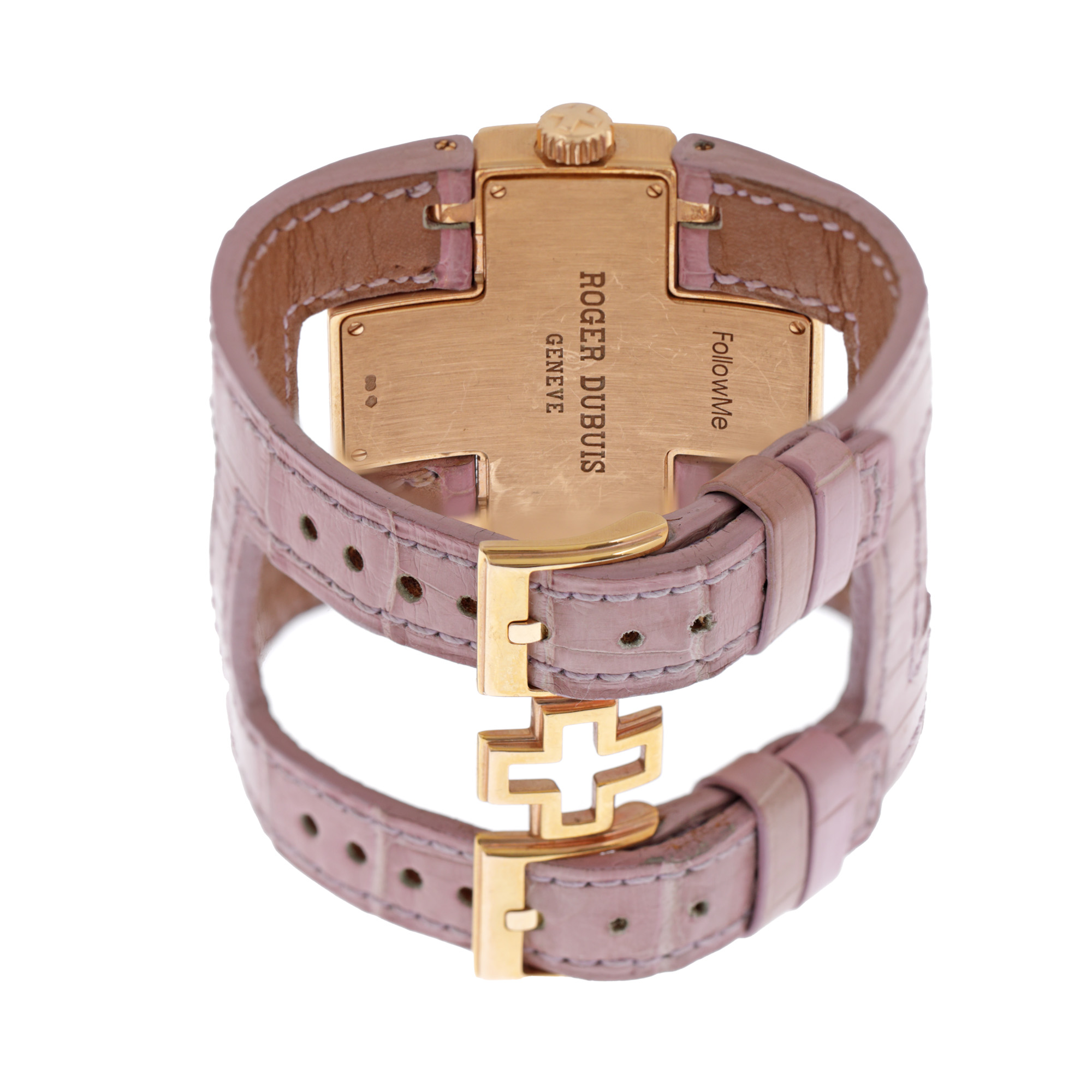 Ceas Roger Dubuis Follow Me, din aur, de mână, de damă, referință F16 855FDF1.6EA2 228. Mecanism quartz, calibrul RD85. Cadran de culoare roz, decorat în relief, indici cu numerale arabe pentru orele 12, 3 6 și 9, acompaniate de numerale-text pentru orele 3, 6 și 9. Curea originală, din piele, de culoare roz, cu sistem de închidere de tip clasic.