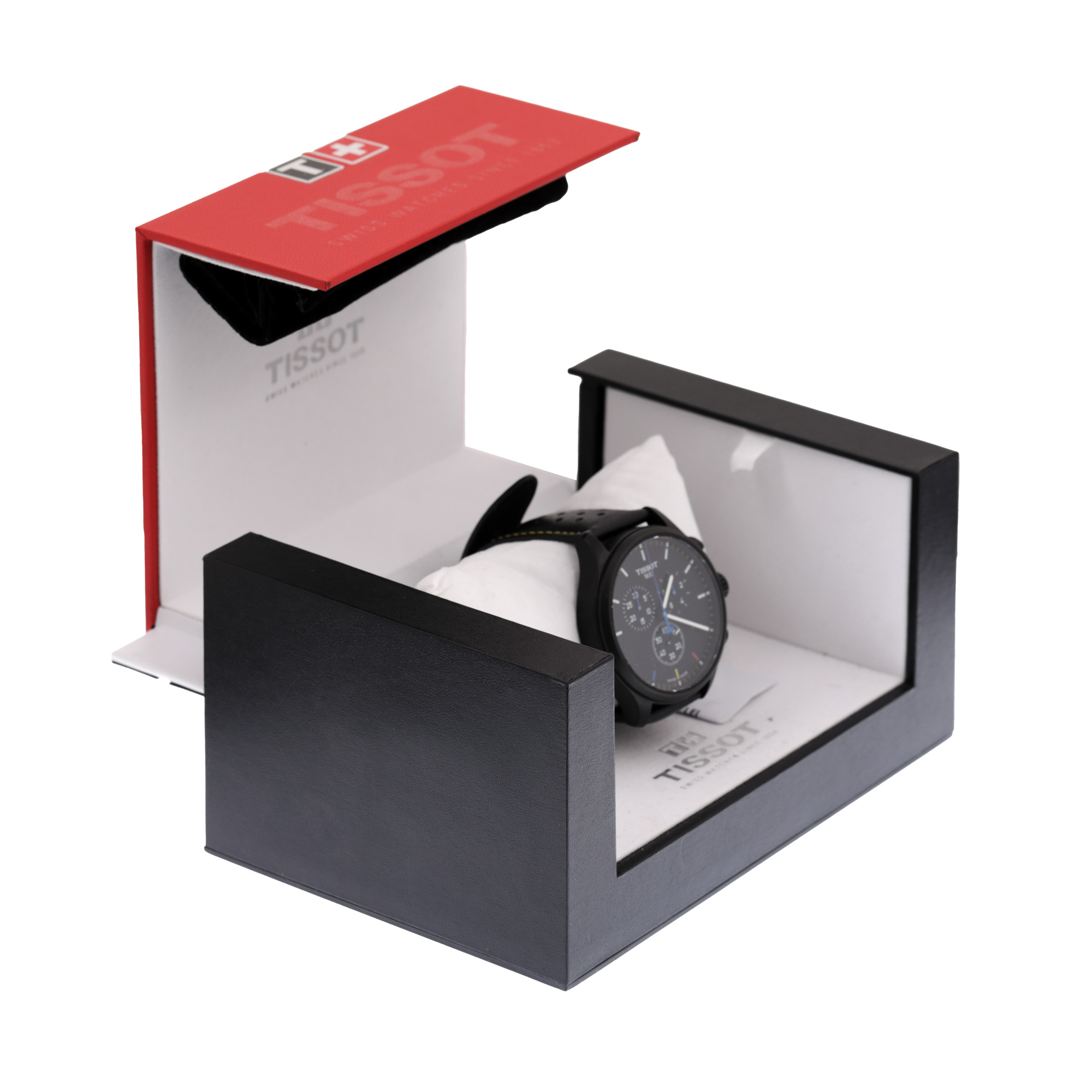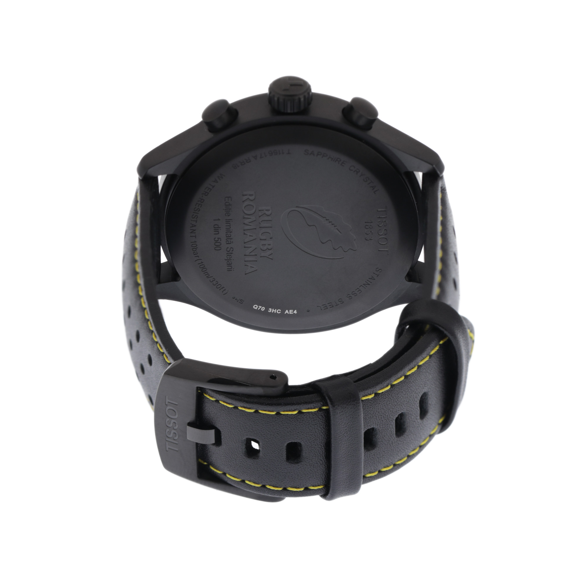 Ceas Tissot ediție specială Echipa Națională de Rugby a României, doar 500 de exemplare, de mână, bărbătesc, referință T116.617.36.051.07. Mecanism quartz cu funcție de chronograph. Cadran de culoare negru, indici baghete, registru pentru dată în dreptul orei 4, registru pentru secundar în dreptul orei 6, două registre pentru chronograph în dreptul orelor 2 și 10, logo ''Stejarii'' în dreptul orei 8. Curea originală, din piele, de culoare neagră, cu sistem de închidere clasic cu cataramă originală. Accesorii: cutia originală, card de garanție.