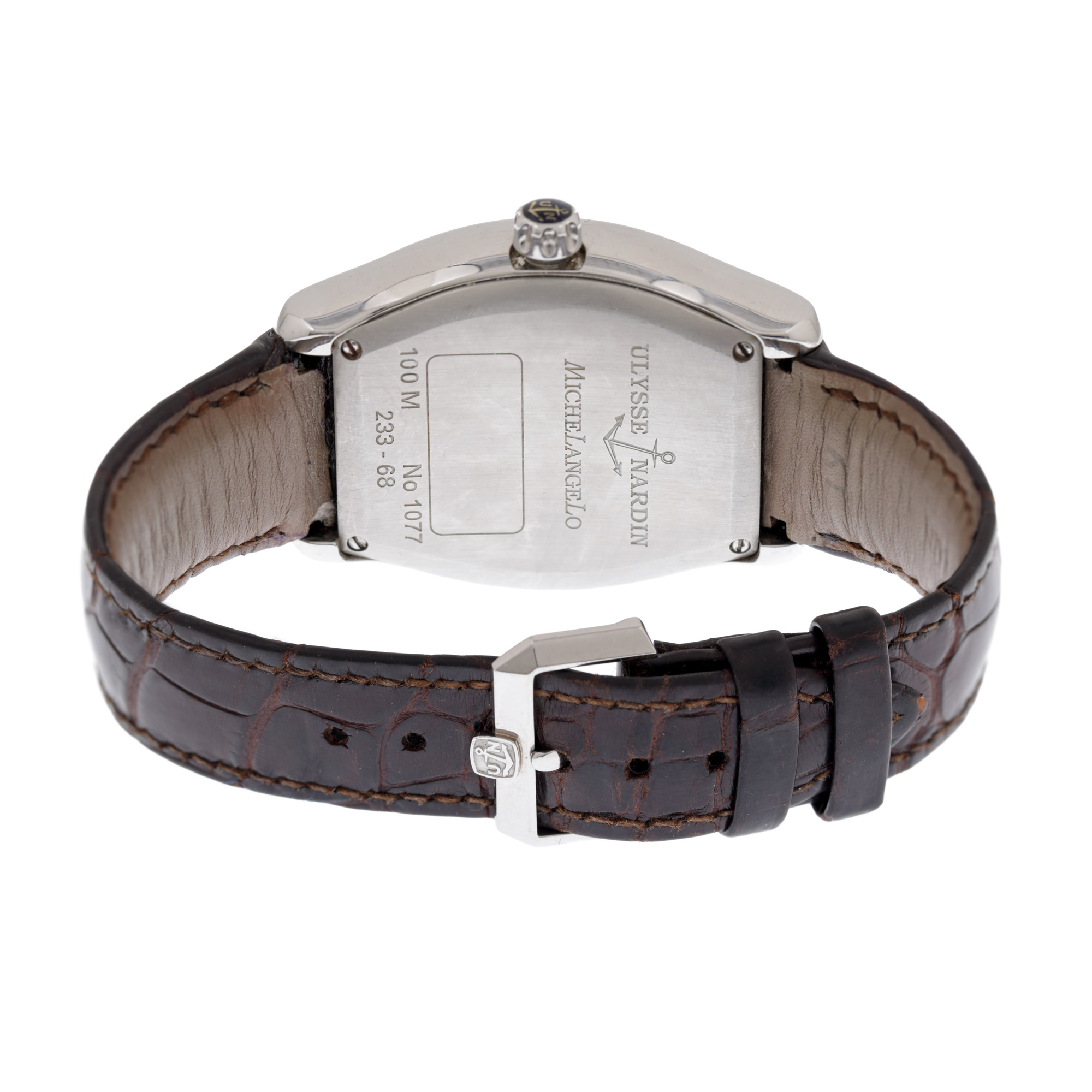 Ceas Ulysse Nardin Michelangelo Big Date, de mână, bărbătesc, referință 233-68. Mecanism automatic, calibrul UN 22. Cadran de culoare argintiu, indici numarale arabe pentru orele pare și baghete pentru cele impare, registru pentru dată în dreptul orei 2. Curea originală, din piele, de culoare brun închis, cu sistem de închidere clasic cu catarama originală.