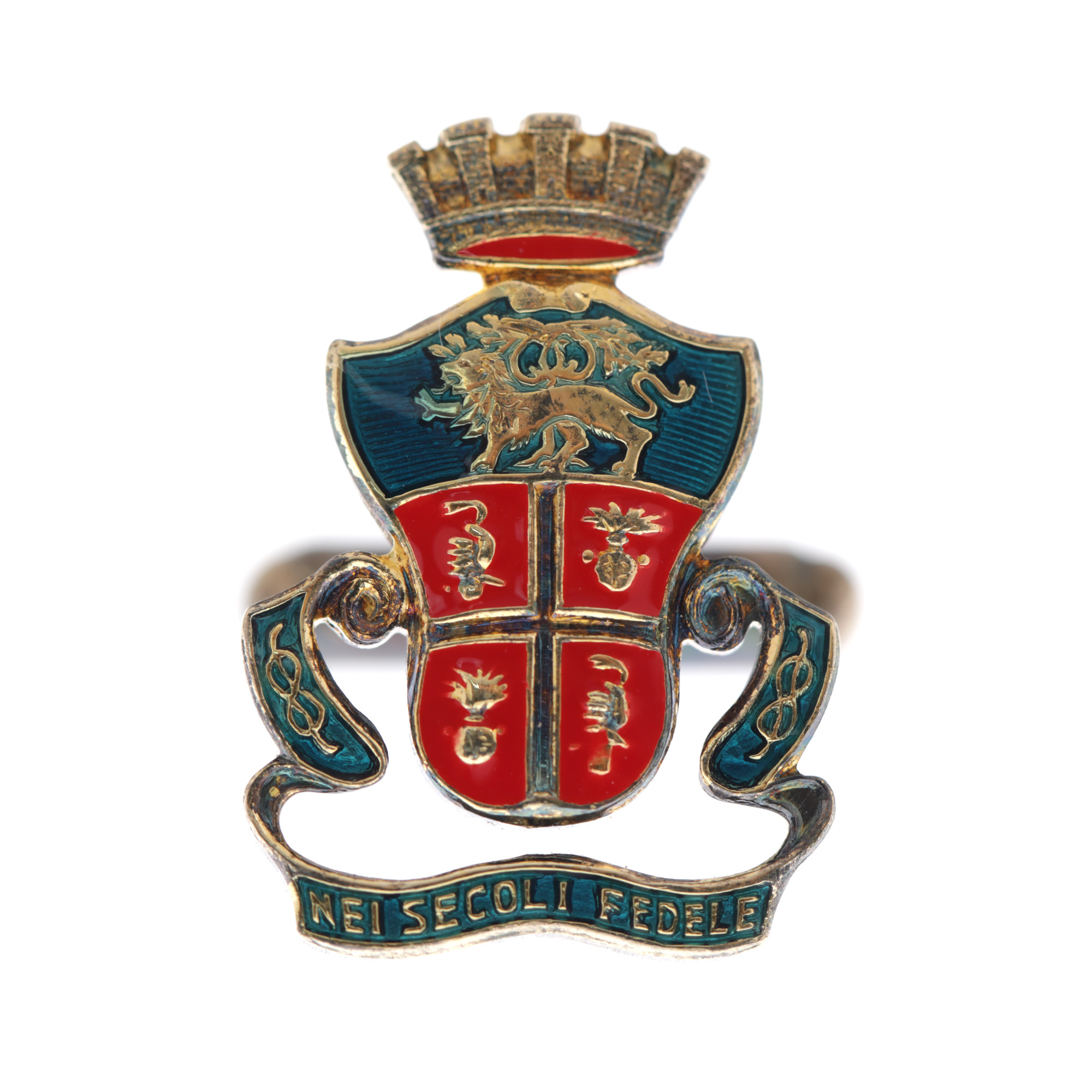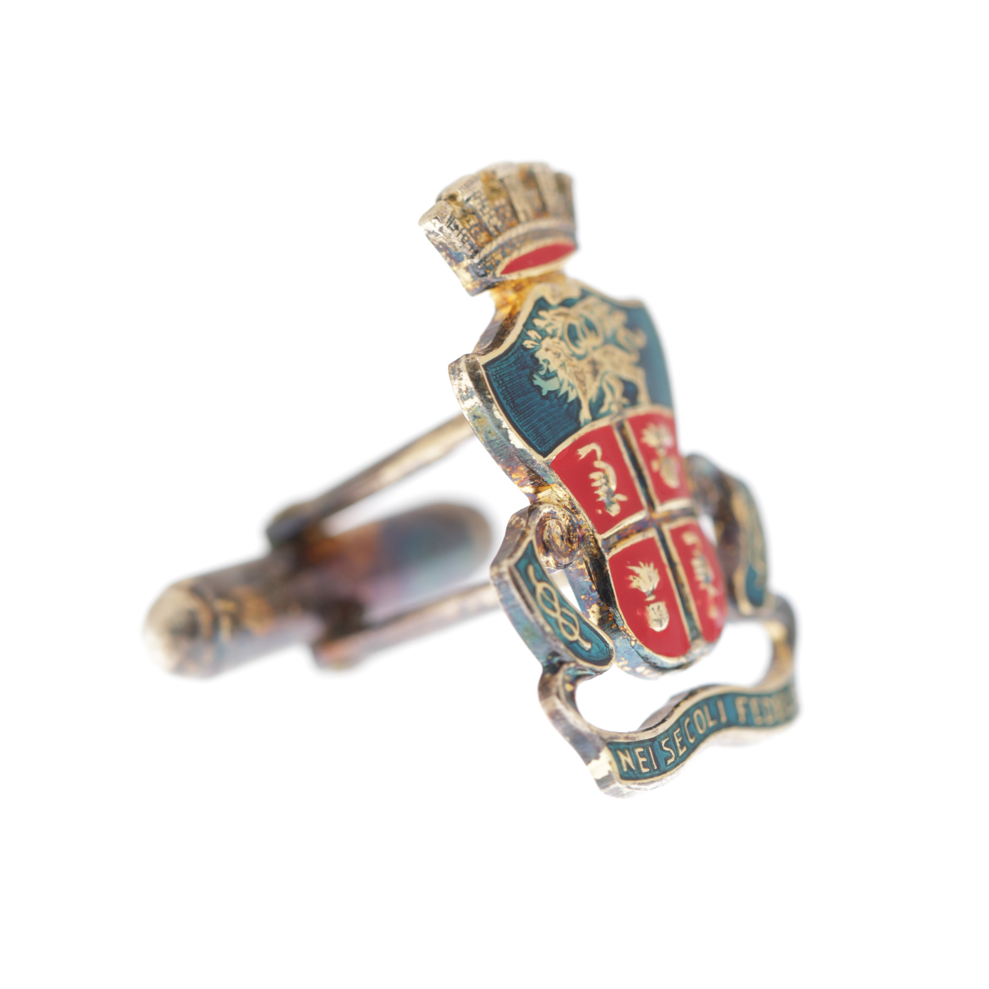 6. Pereche de butoni decorați cu blazonul Asociației Naționale a Carabinierilor, din argint aurit, decorați cu email, în cutia originală