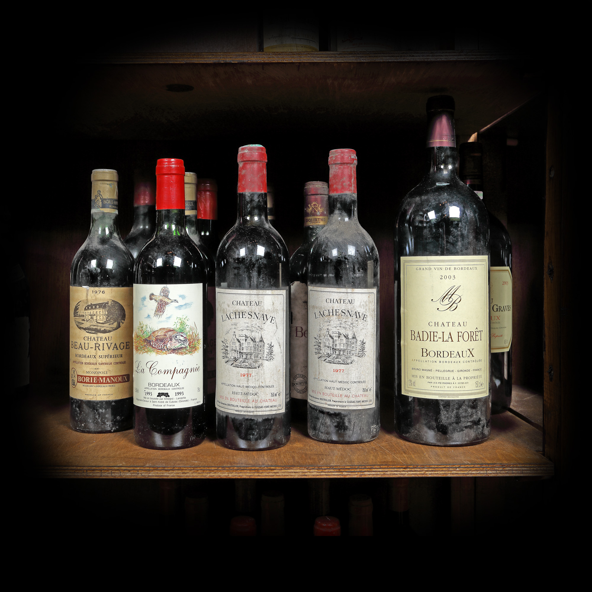 Beaumayne 1985 2st x 0,75l, Château Beau-Rivage 1976, 3 st x 0,75l, Château Charmail 1975 1st x 0,75l, Le Solitaire 1993, 1st x 0,75l, Château Beaumard 1885 1st x 0,75l, La Compagnie 1993, 1st x 0,75l, Cheateau Lachesnaye 1977, 2st x 0,75l, Château La Moulin des Graves 2003, 1st x 1,5l, Château Badie-La Forret, 2003, 1x 1,5l