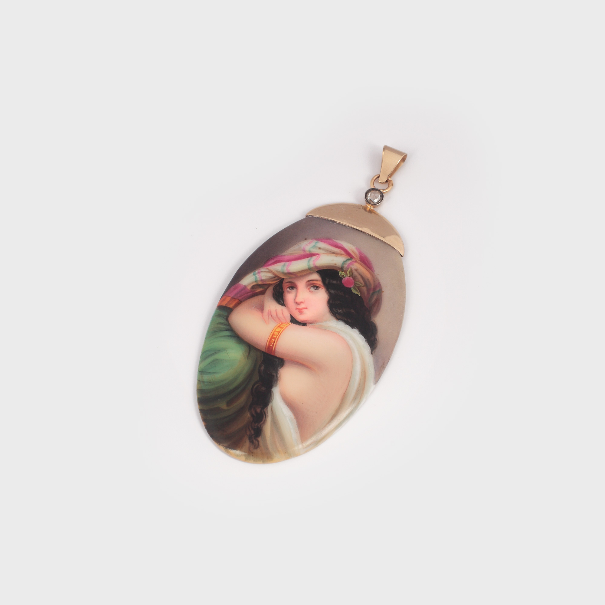 4. Pandantiv romantic, din aur și porțelan, pictat cu o odaliscă și decorat cu un diamant, începutul sec. XX