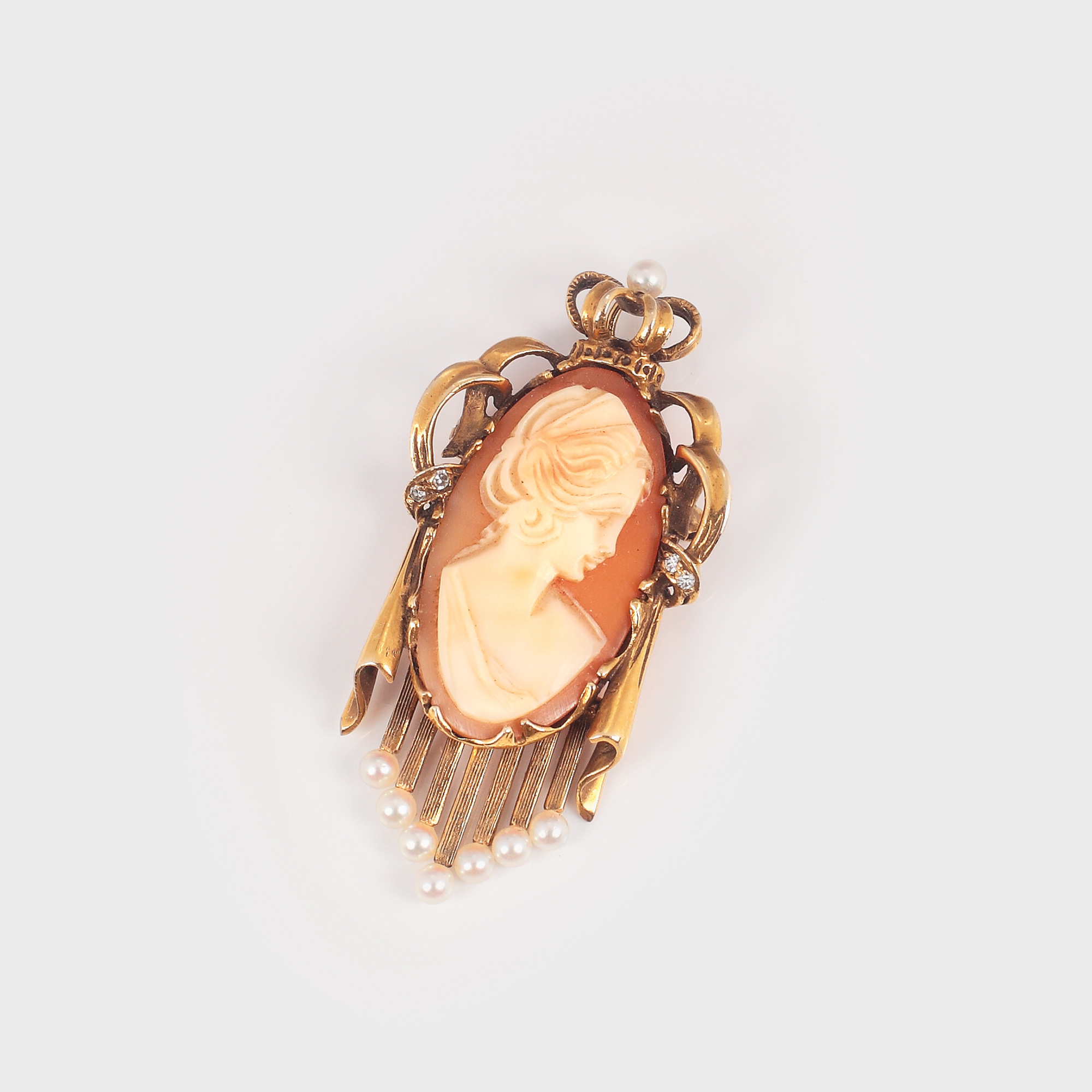 5. Spectaculoasă broșă-pandantiv din aur și sidef camee, sculptată cu personaj feminin și decorată cu diamante, începutul sec. XX
