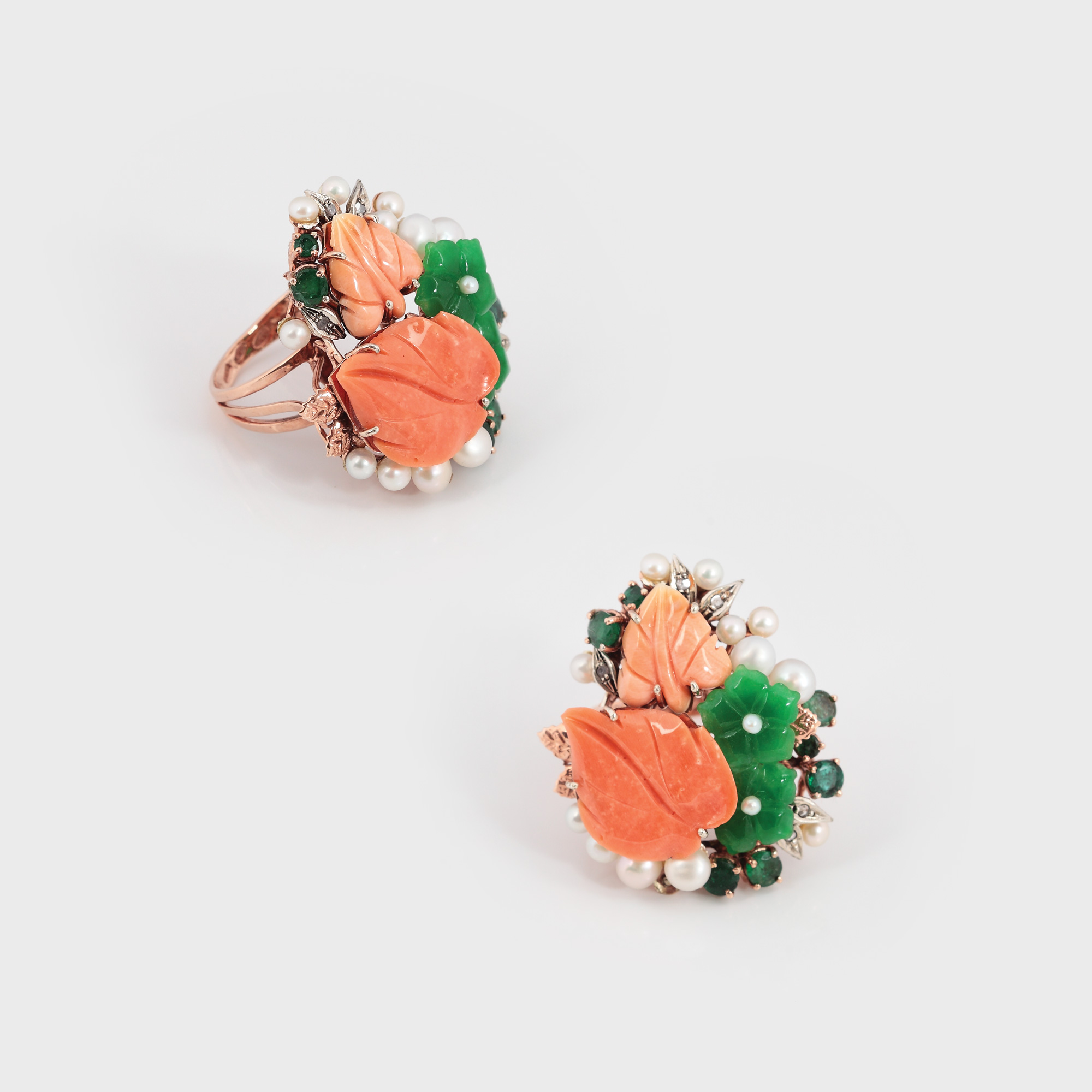 6. "Colț de grădină" - inel din aur, decorat cu diamante, smaralde, perle și coral [sec. XX]
