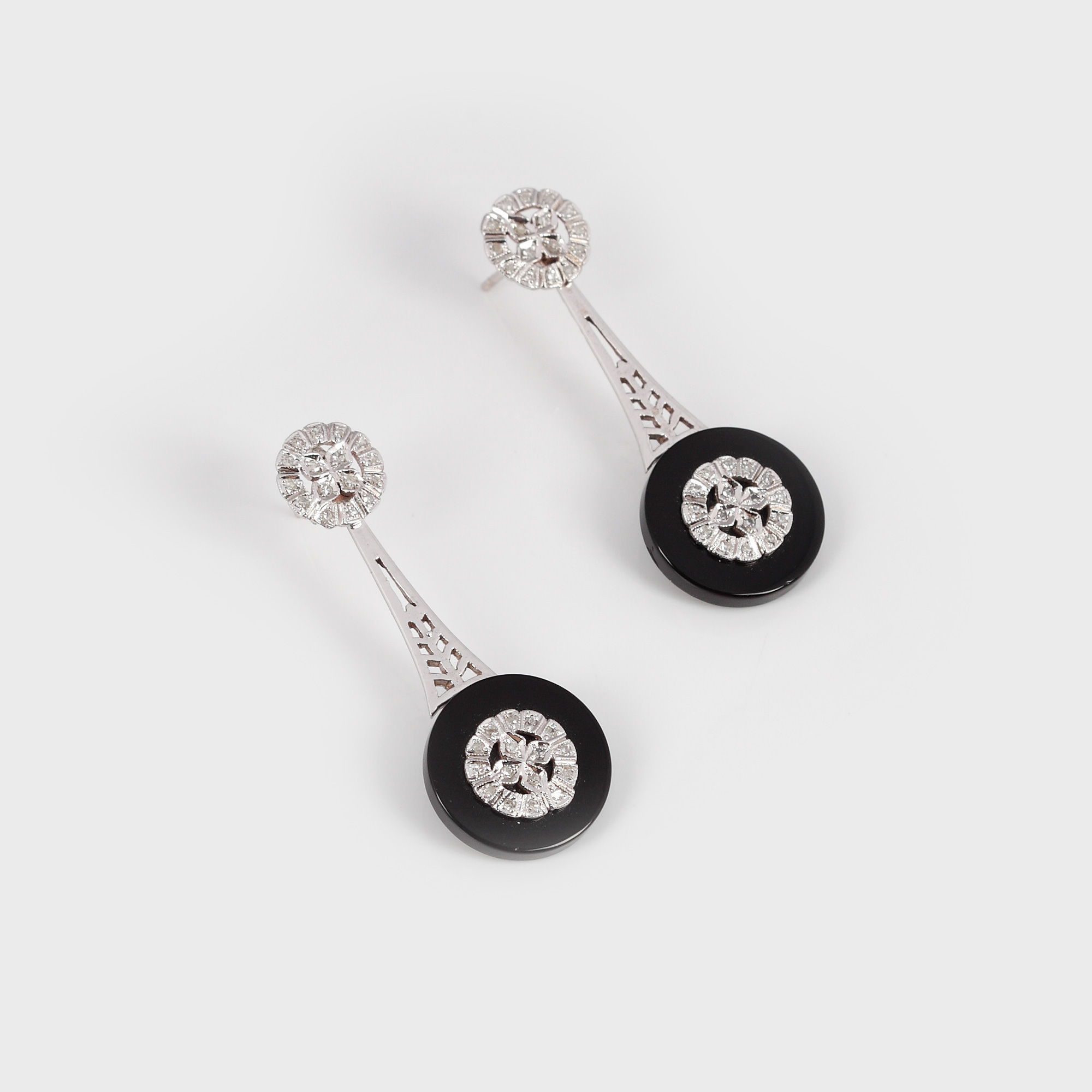 8. Interesantă pereche de cercei de seară din aur alb, decorați cu diamante și onix [sec. XX]