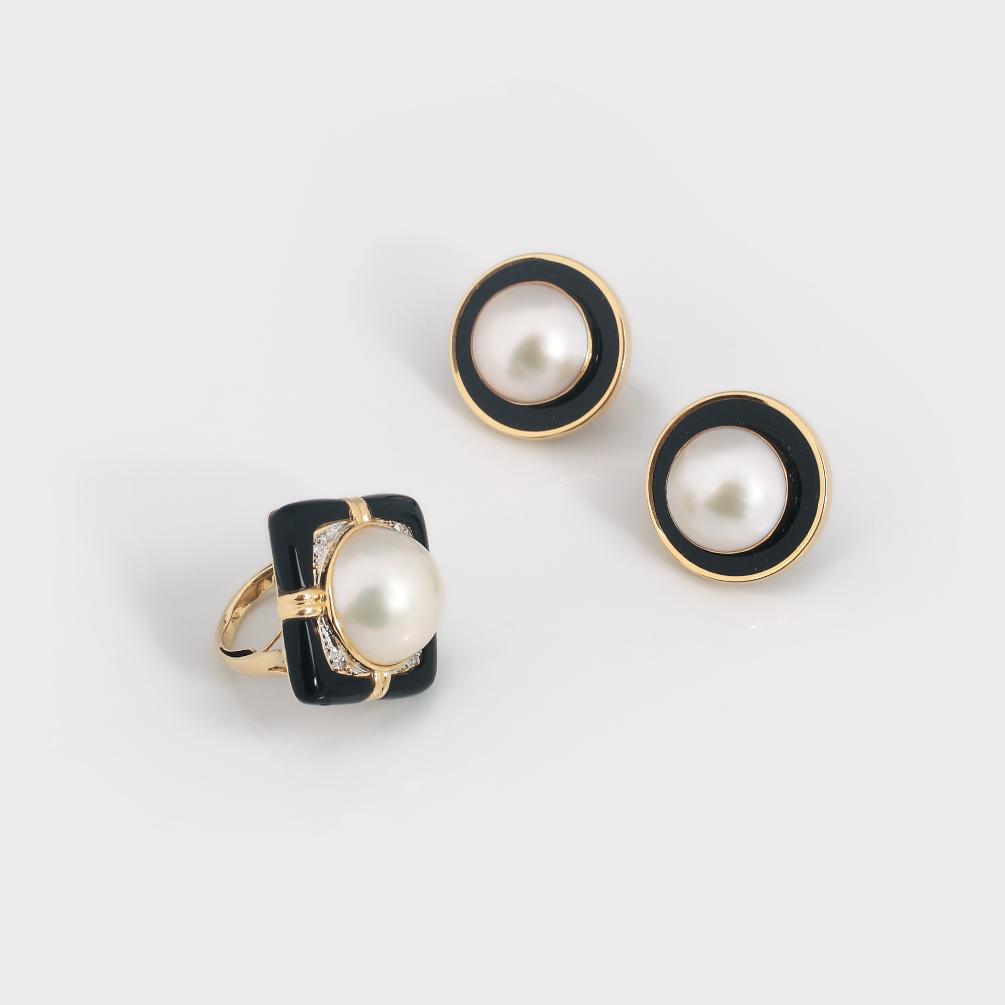9. Elegantă garnitură de cercei și inel din aur, decorată cu perle, diamante și onix [sec. XX]