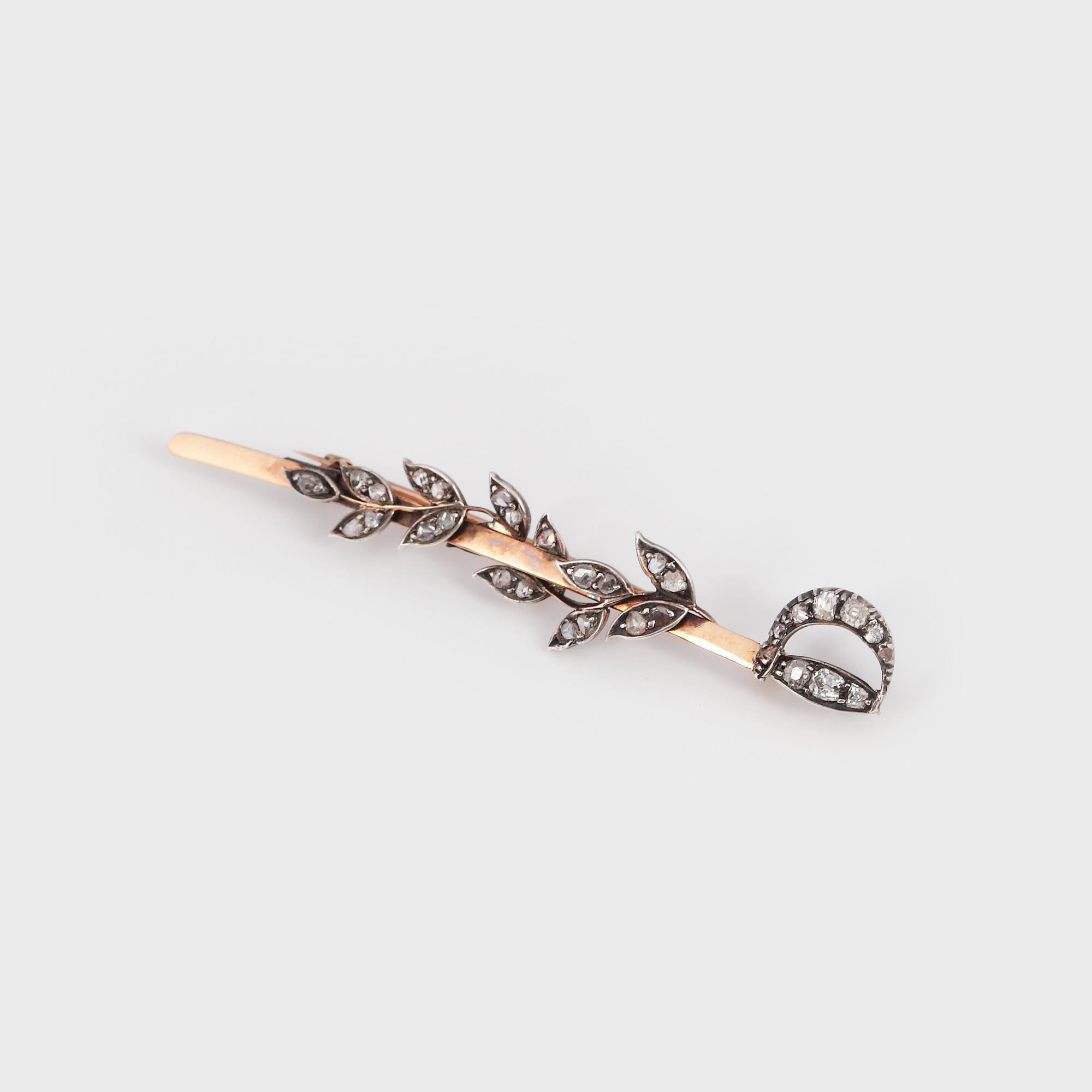 18. Inedită broșă din aur, decorată cu ghirlandă de diamante, realizată în forma unei săbii, începutul sec. XX, în cutie originală