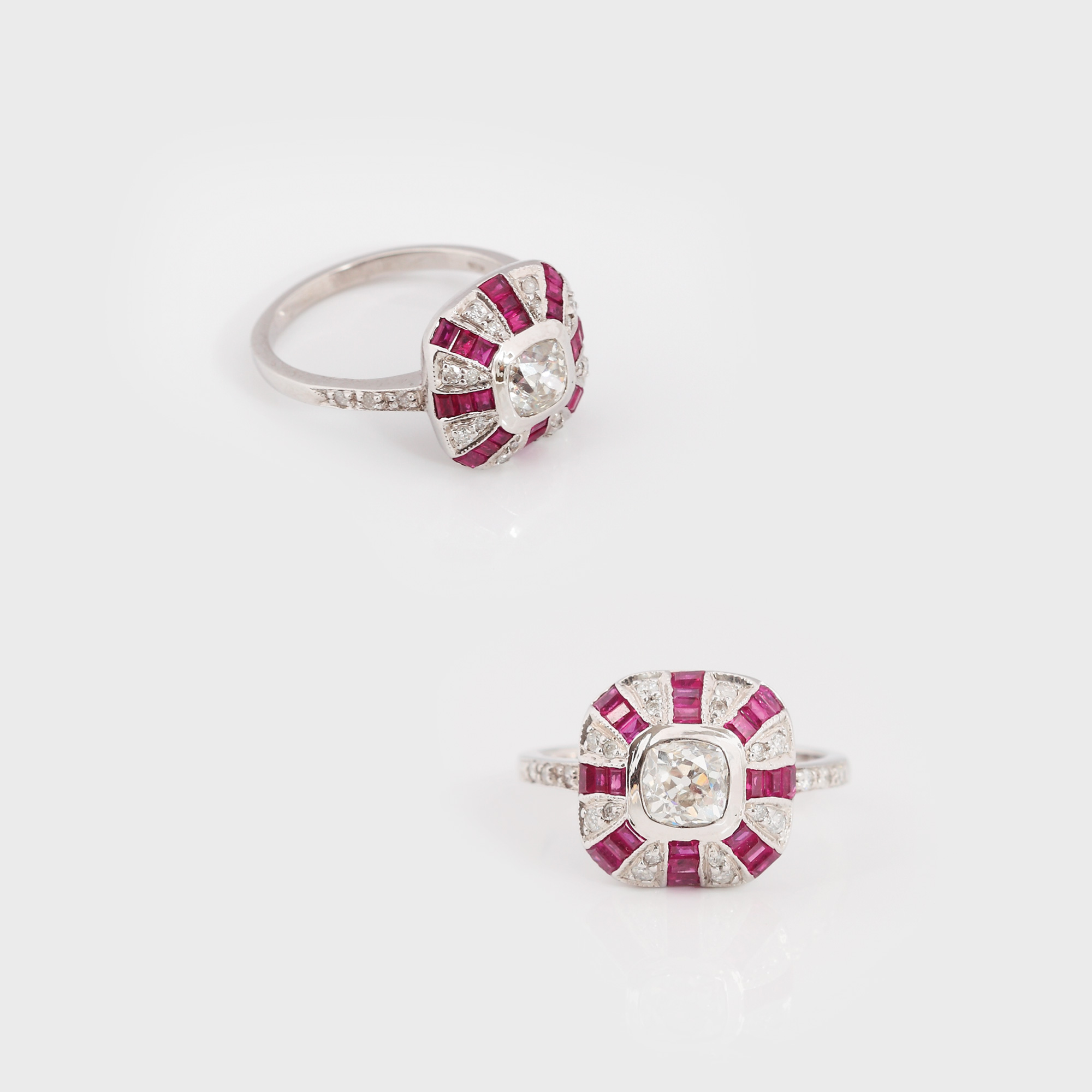 21. Prețios inel din aur alb, decorat cu diamante și rubine, cca. 1930, în cutie originală din fildeș