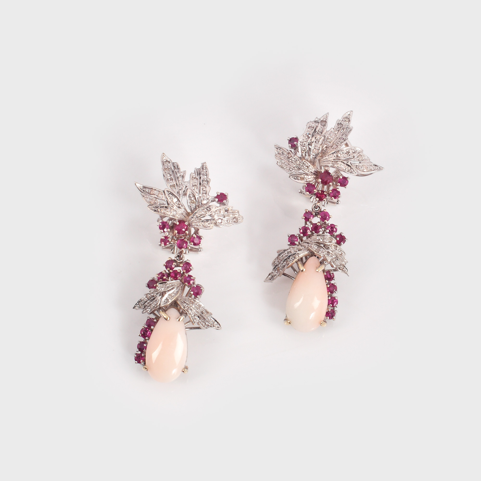 22. "Lacrimi de coral" - pereche de cercei din aur alb, decorați cu diamante și rubine [sec. XX]