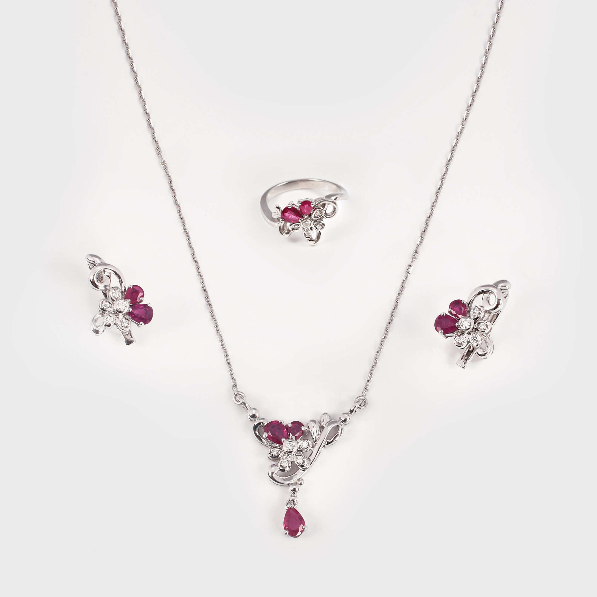 23. Fină garnitură formată din colier, cercei și inel din aur alb, decorate cu flori de diamant și rubine [sec. XX]