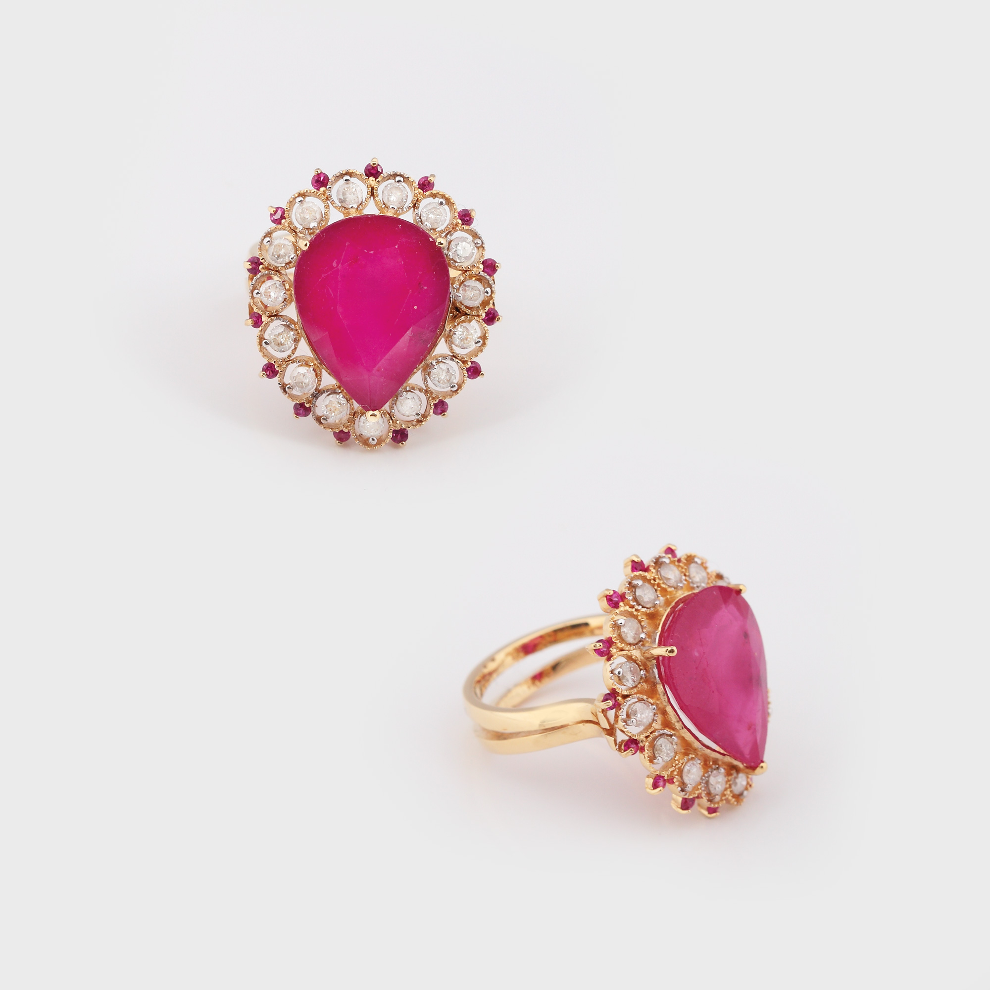 24. Impresionant rubin (peste 10 ct), anturat de diamante, montat pe un inel din aur [sec. XX]