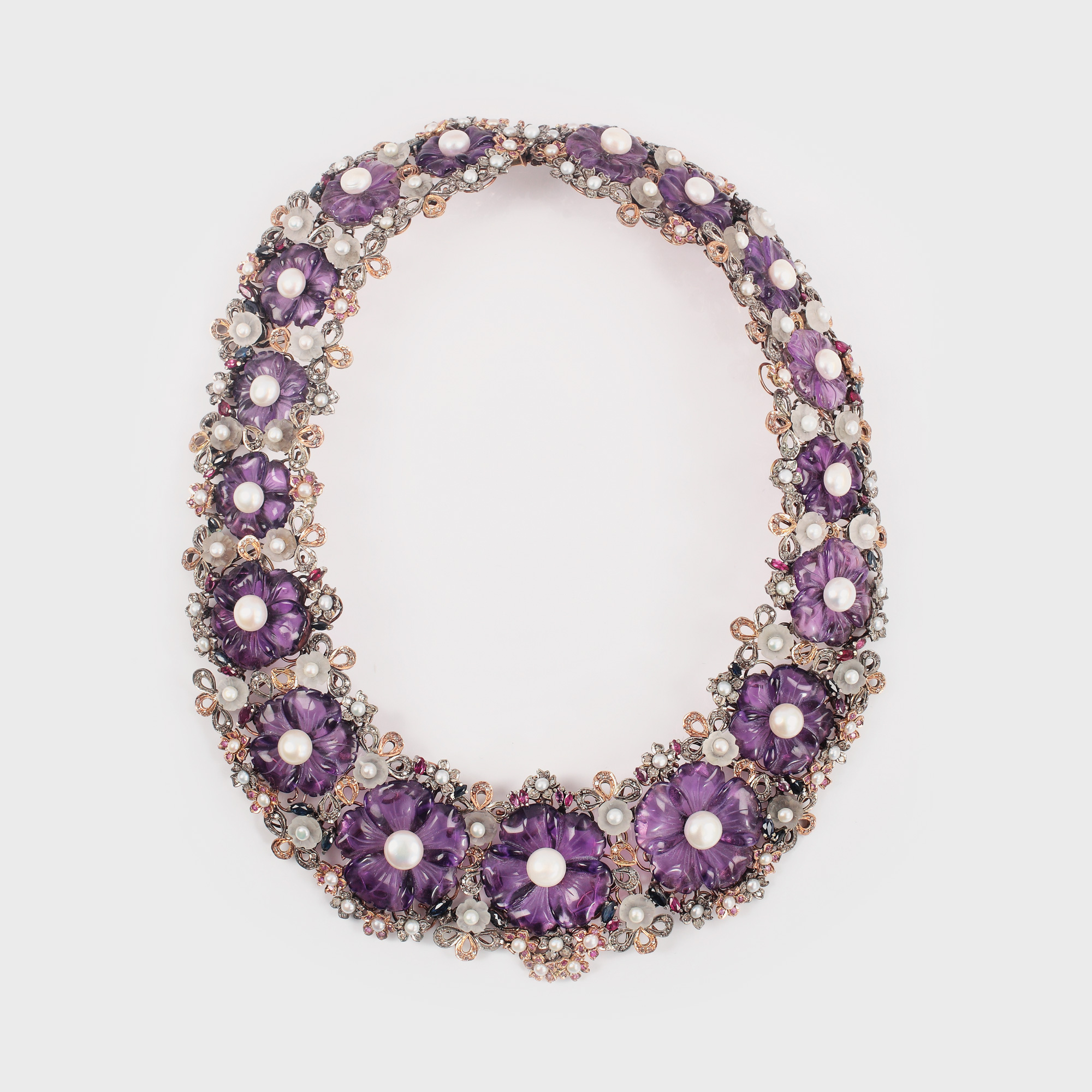 26. Spectaculos colier din aur, decorat cu flori sculptate în ametist, diamante, perle, rubine și safire [sec. XX]