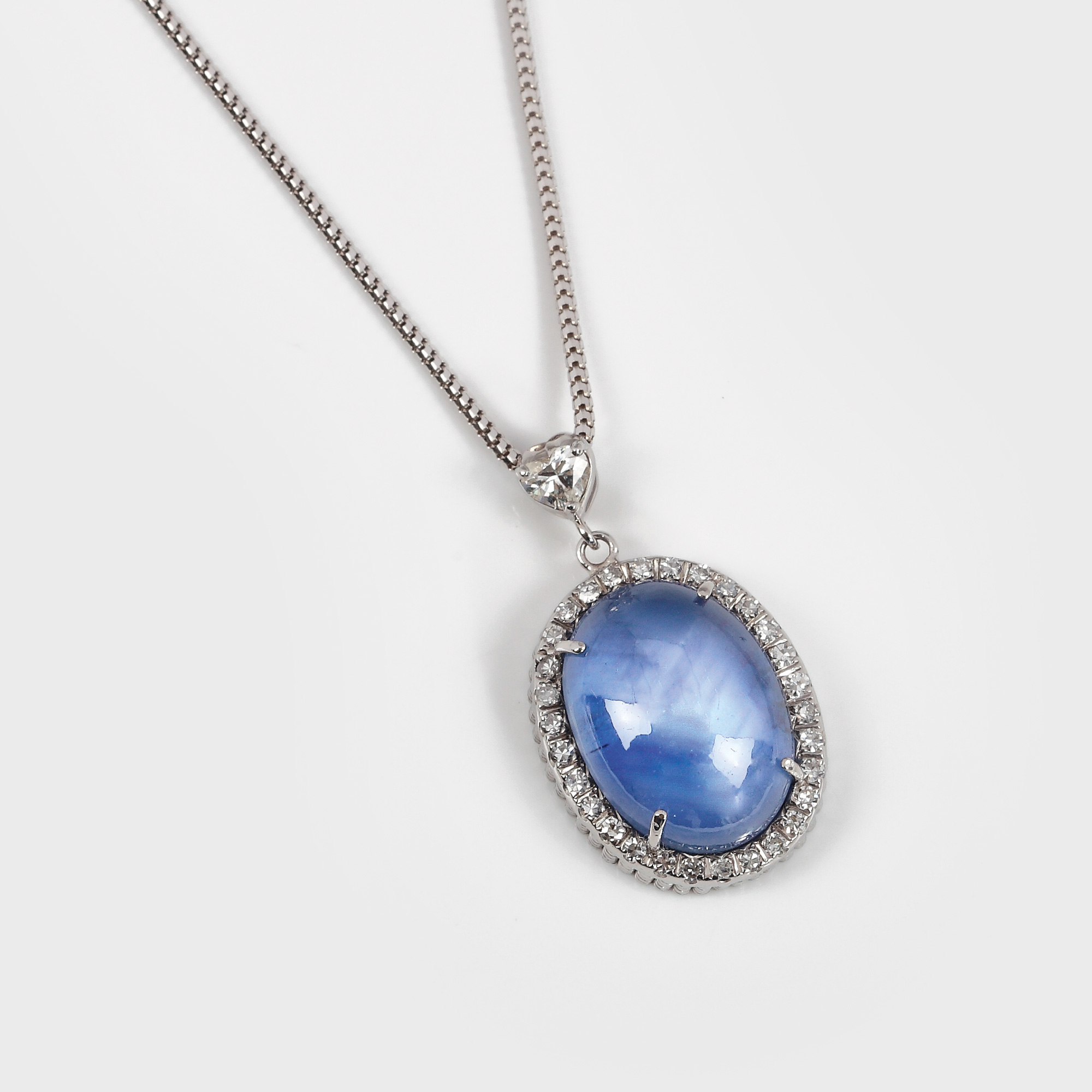33. Spectaculos safir (peste 27 ct), anturat de diamante, montat într-un pandantiv din aur alb [sec. XX]