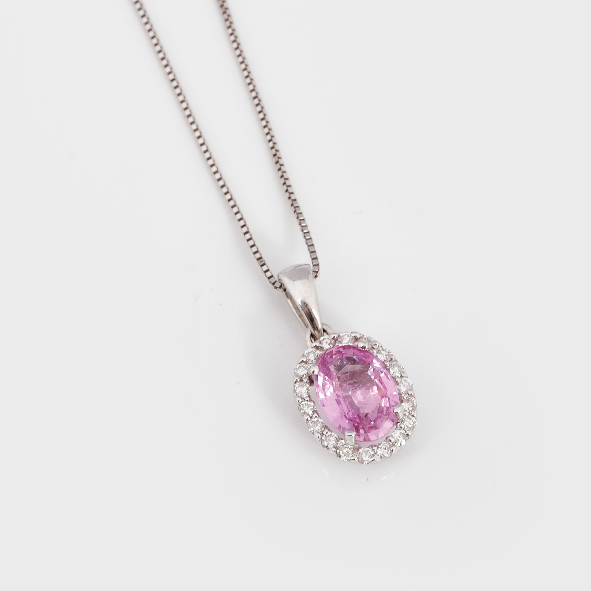 36. Delicat pandantiv din safir roz, anturat cu diamante și montat în aur alb [sec. XX]