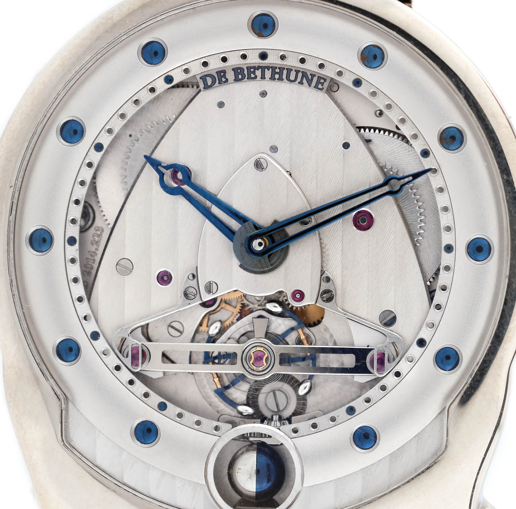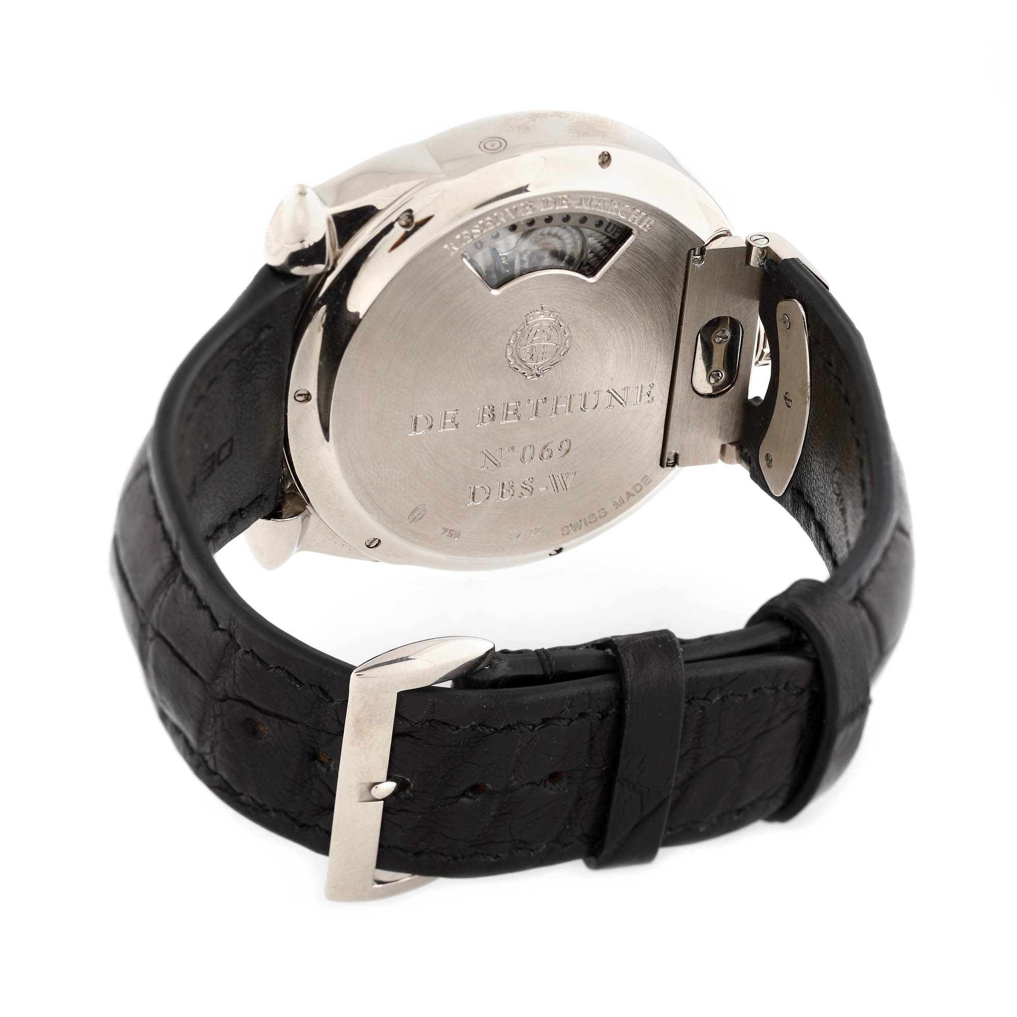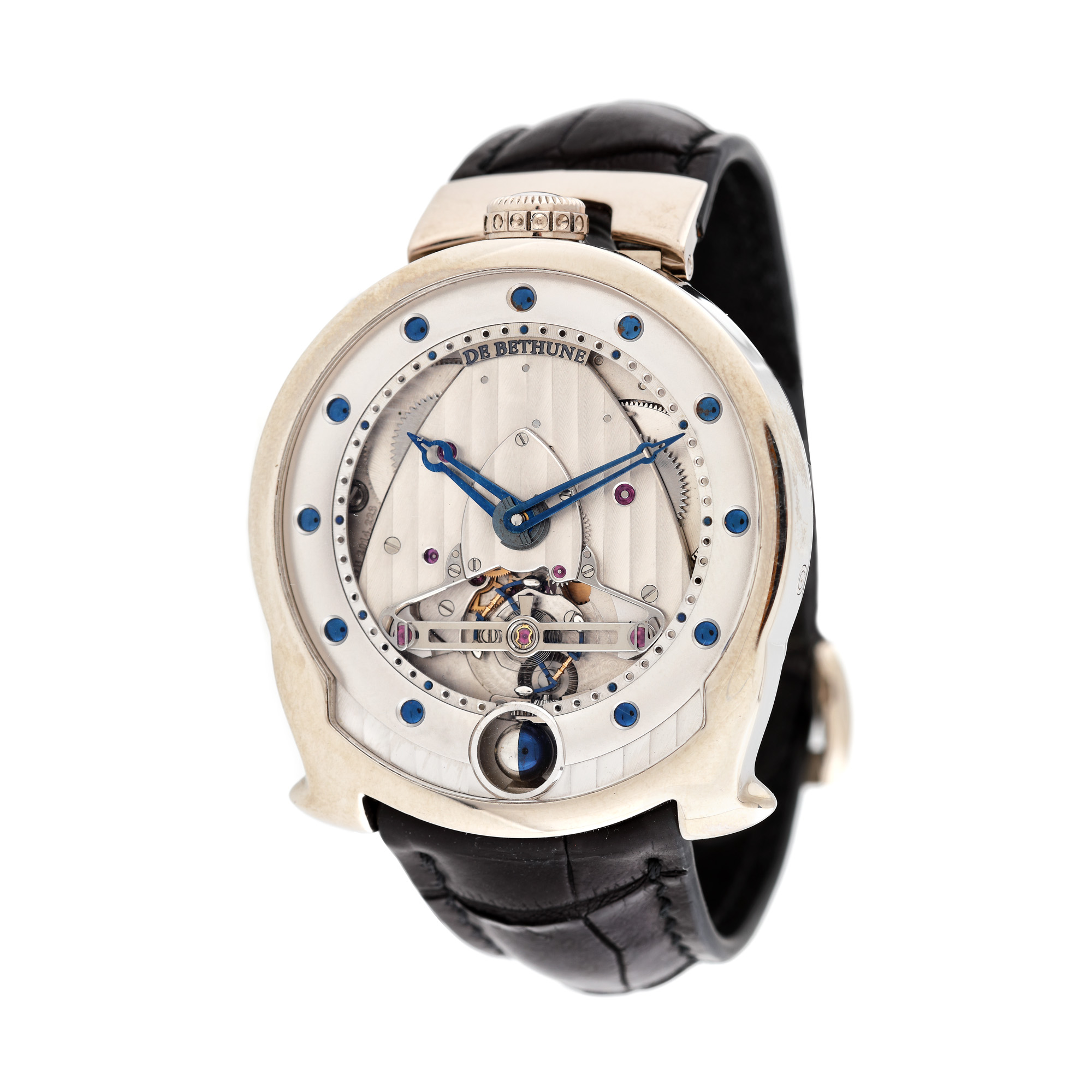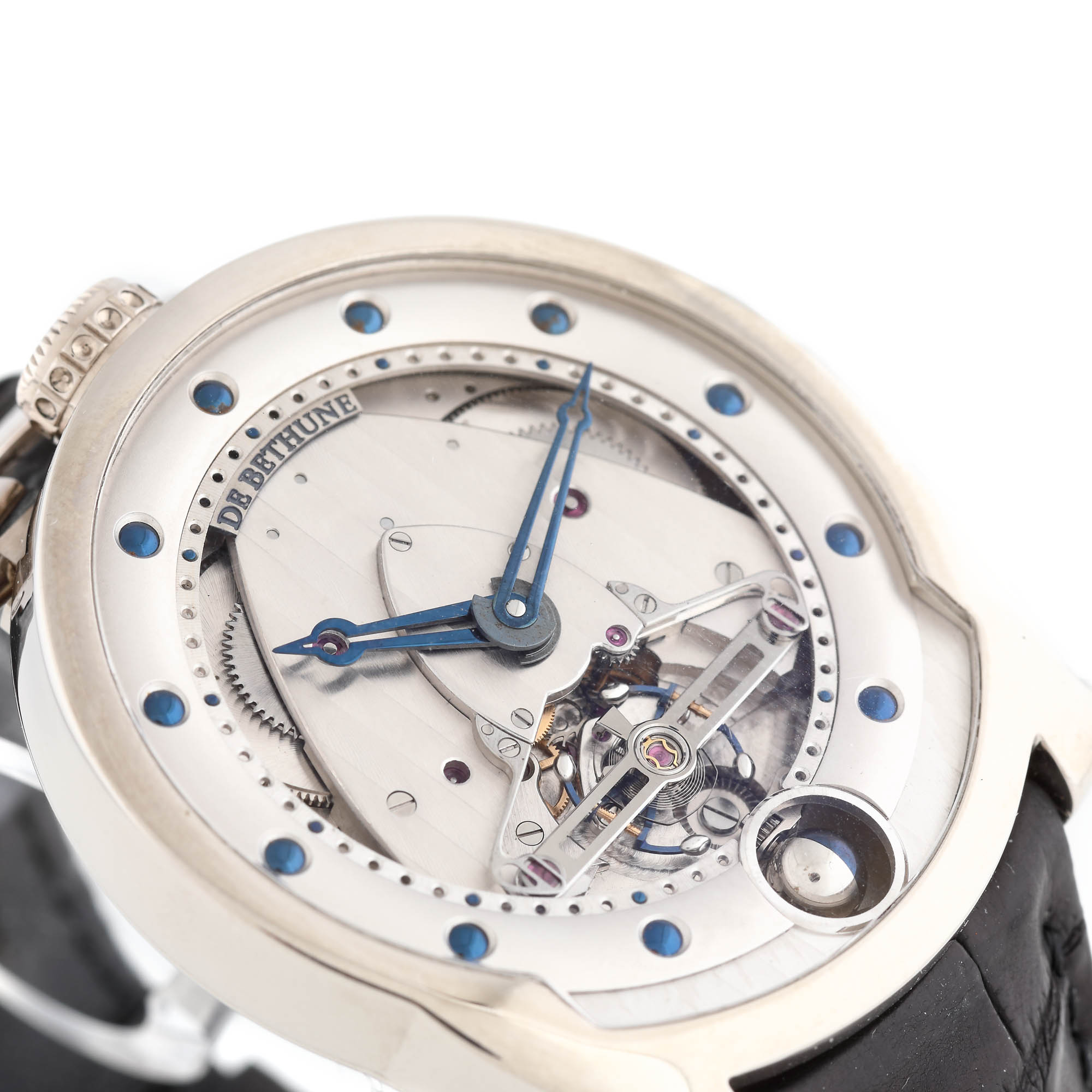 Ceas De Bethune Revolving Moon, din aur alb, de mână, bărbătesc, referință DBS-W, mecanism cu armare manuală, cadran skeleton. Curea din piele de aligator, de culoare neagră și cataramă originală. Ceasul vine însoțit de cutia originală.