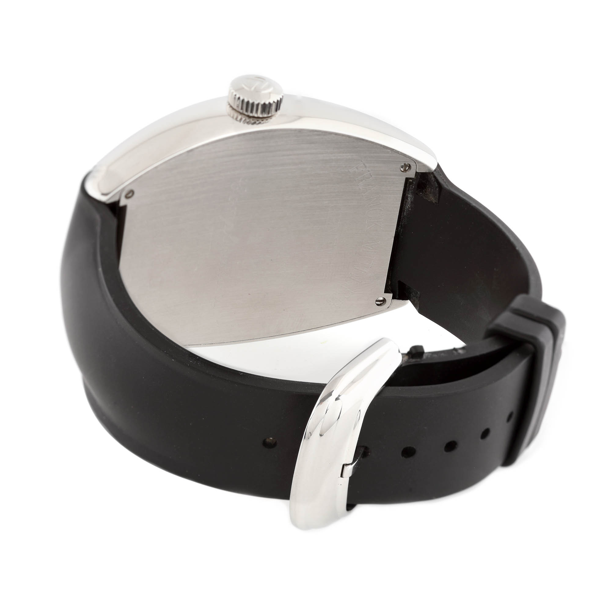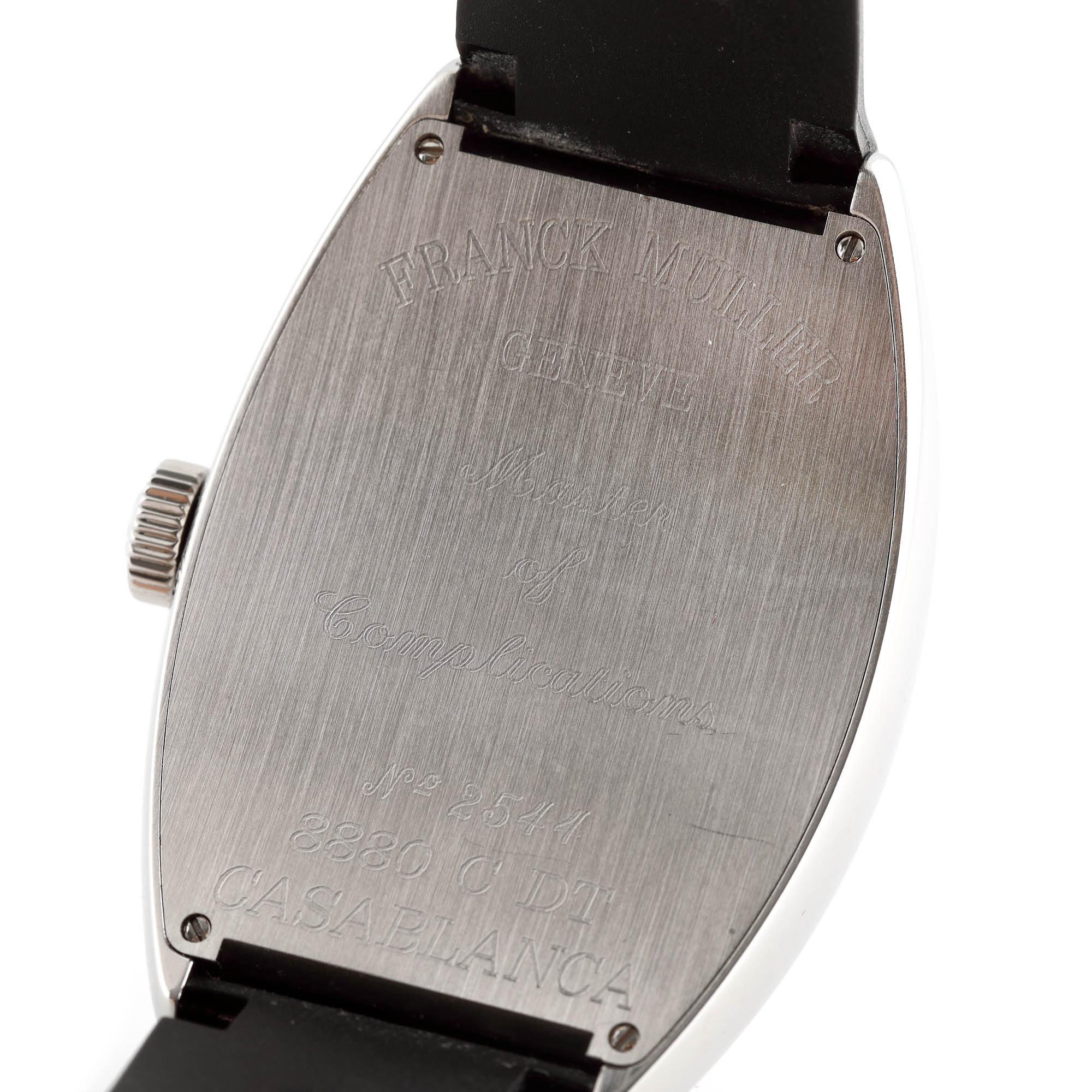 Ceas Franck Muller Casablanca, de mână, bărbătesc, referință 8880 C DT, mecanism automatic. Carcasă tonneau, cadran de culoare negru, numerale arabe, indecși orari luminiscenți și dată în dreptul orei 6. Curea din cauciuc, de culoare neagră și cataramă din oțel inoxidabil, originale.