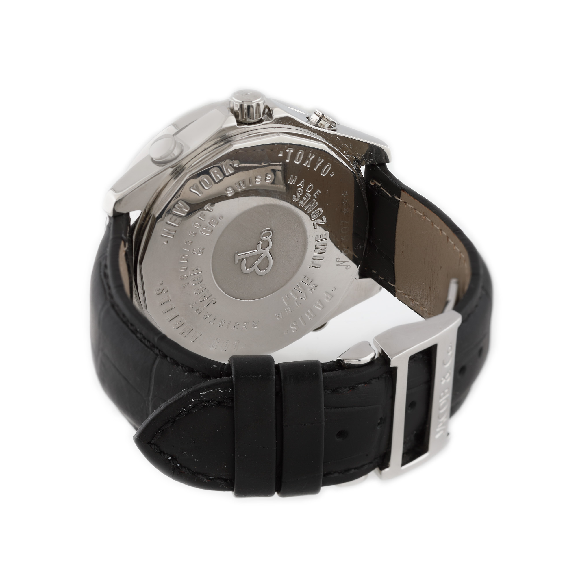 Ceas Jacob & Co, cu 5 fusuri orare, ornat cu diamante, de mână, unisex. Cadran de culoare alb, cu numerale arabe și dată în dreptul orei 6. Fiecare fus orar fiind poziționat în dreptul următoarelor ore: L.A. în dreptul orei 1, Tokyo în dreptul orei 4, Paris în dreptul orei 7, New York în dreptul orei 11. Curea din piele, de culoare neagră și închizătoare tip deployant, originale.
