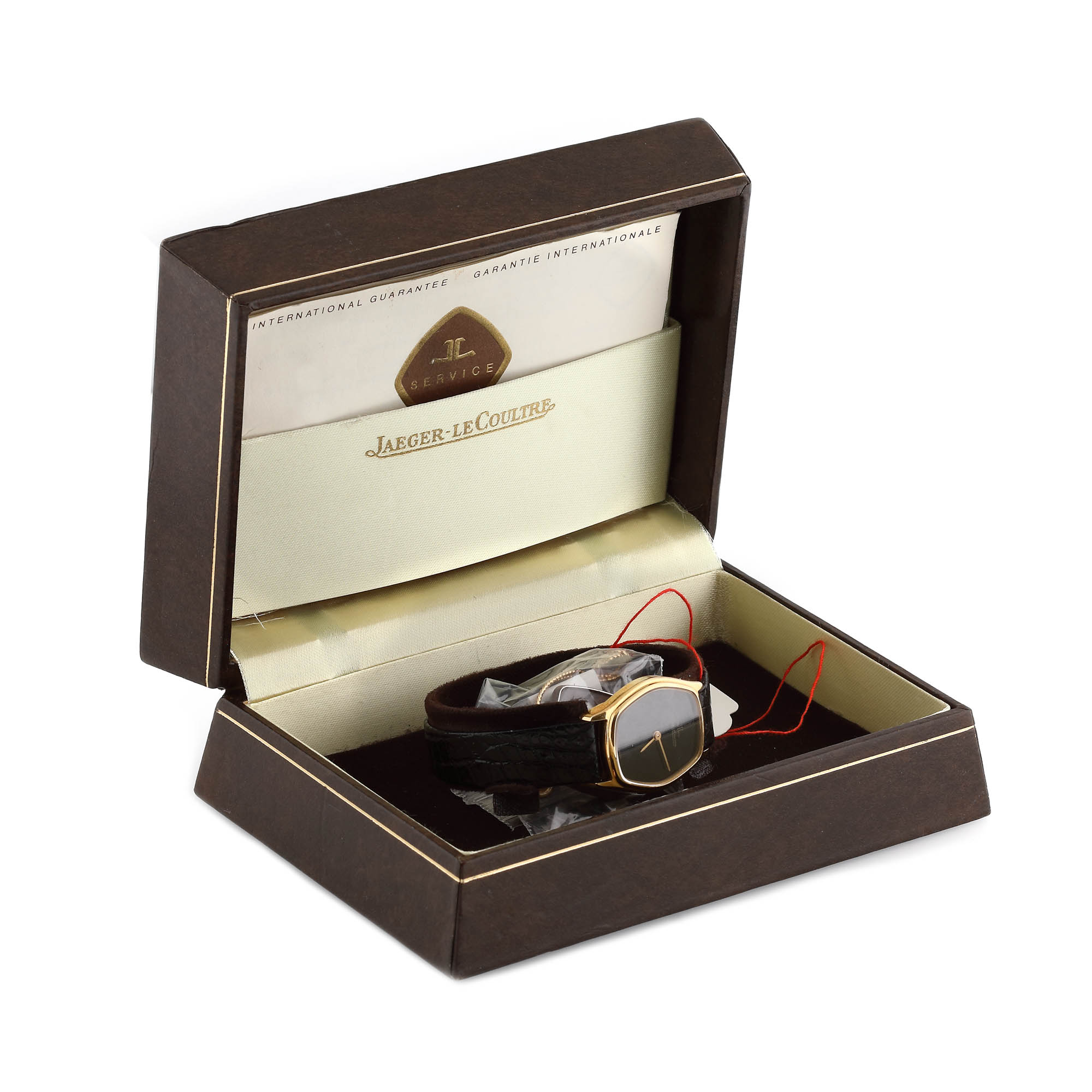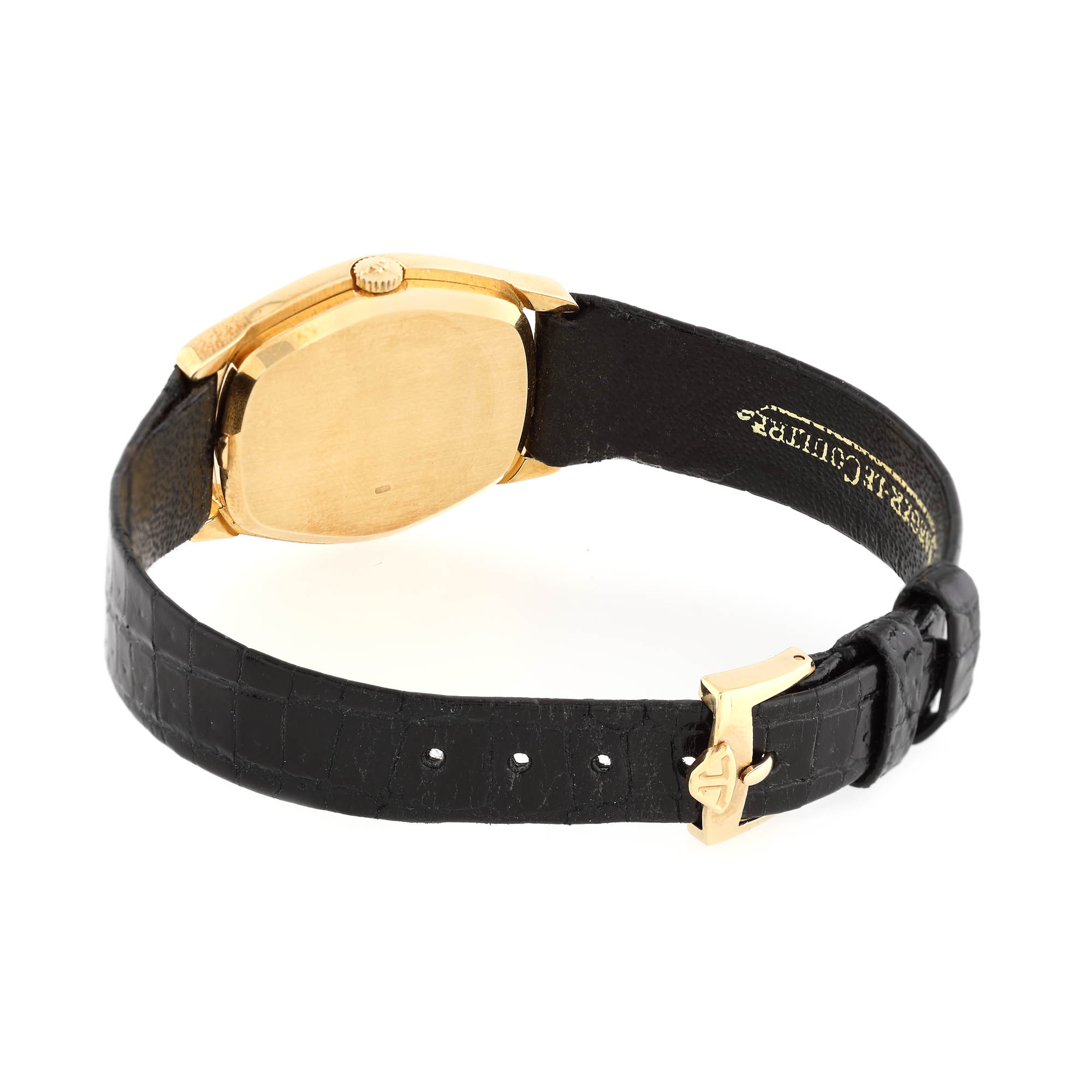 Ceas Jaeger LeCoultre vintage, din aur, de mână, de damă, mecanism cu armare manuală. Curea din piele, de culoare neagră și cataramă, originale. Ceasul vine însoțit de cutia originală și certificat de garanție, datat 30 noiembrie 1976 și ștampilat de retailer: "Vienna Watch Co. Ltd".