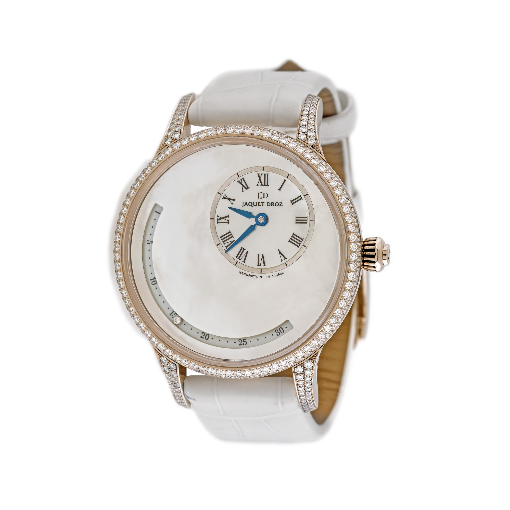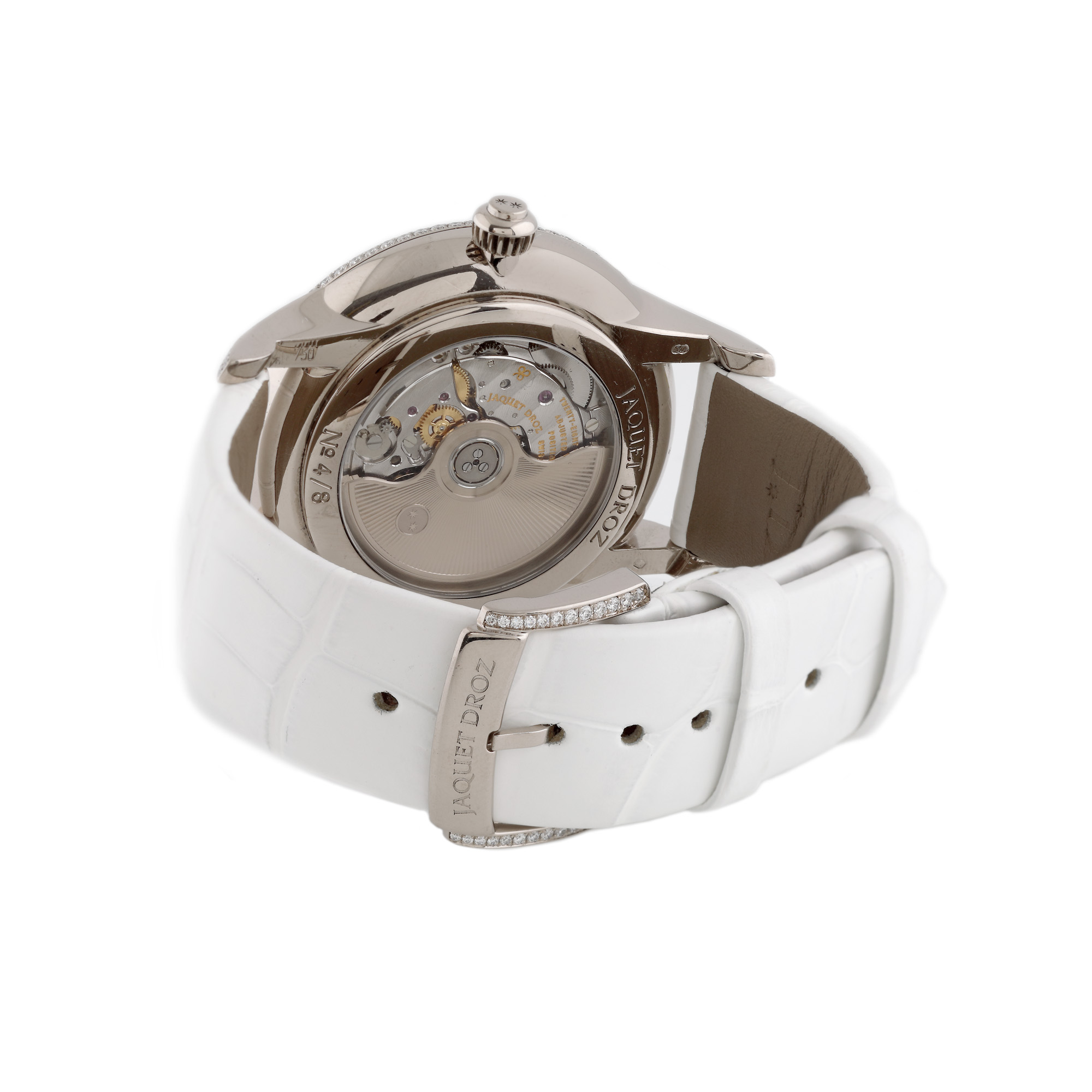 Ceas Jaquet Droz Date Astrale, din aur alb, de mână, de damă, decorat cu diamante, referință J021014204, mecanism automatic. Cadran din sidef, registru pentru dată, numerale romane și bezelul decorat cu diamante. Curea din piele de aligator, de culoare albă și cataramă decorată cu diamante, originale. Date Astrale este un ceas de excepție. Adepții adevărați își vor prețui aspectul contemporan, designul superior și excelența performanței sale mecanice. O pictogramă poetică, cadranul este traversat de un diamant care indică data. Acest diamant o dată pe lună la miezul nopții, revine la poziția inițială. Urmărind traiectoria sa, diamantul scânteie maiestuos ca o stea căzătoare care trasează propia cale. Prezentând linii sofisticate, cadranul este un studiu în echilibru: subdialul descentrat la ora 2 contrabalansează perfect curba indicatorului pentru dată. Cadranul ceasului este iluminat de frumusețea irizată a sidefului și strălucirea diamantelor, montate pe cadru. Această interacțiune subtilă a luminii sugerează atât forță, cât și blândețe, ambele calități pe care le posedă femeile rafinate cărora le este destinat acest ceas de lux.