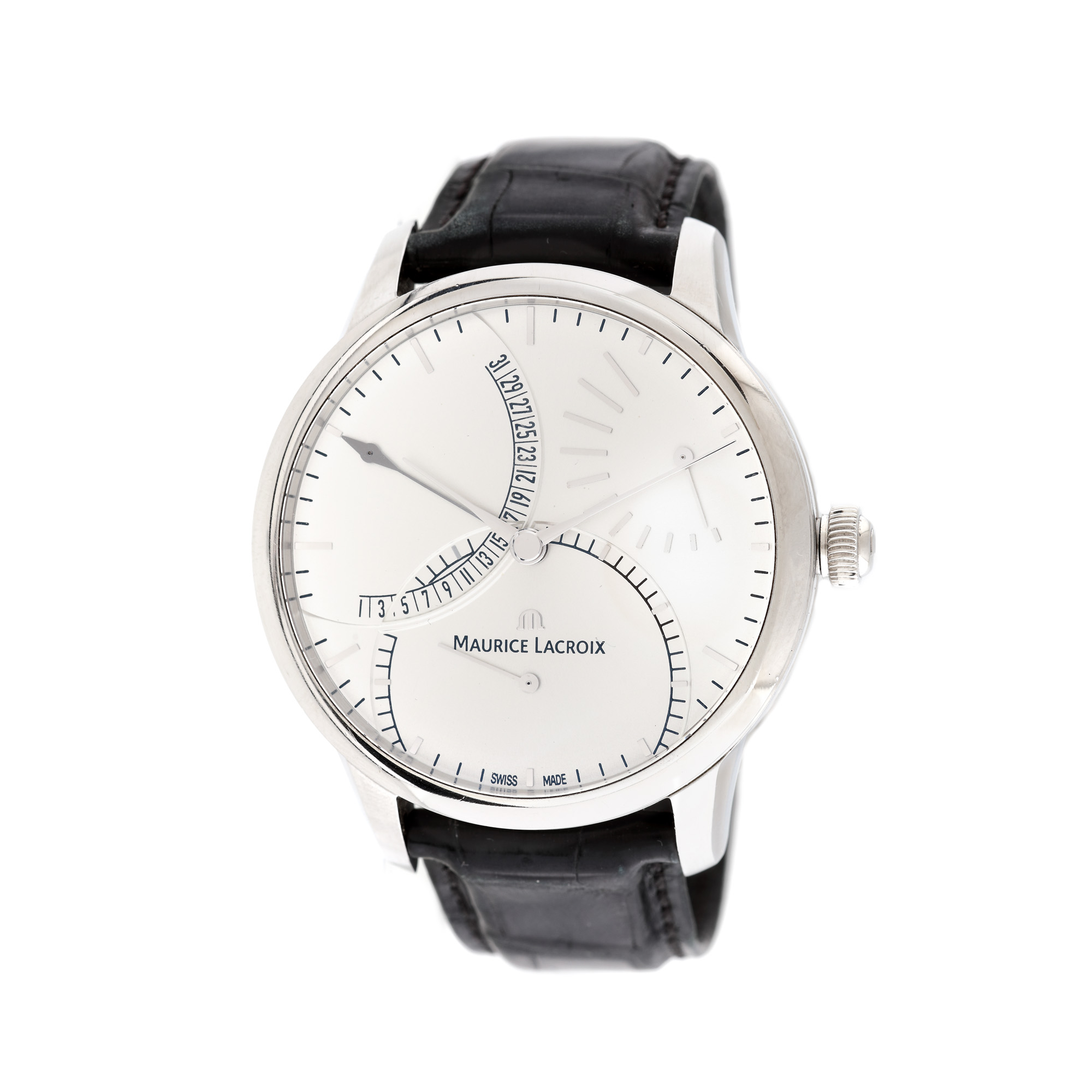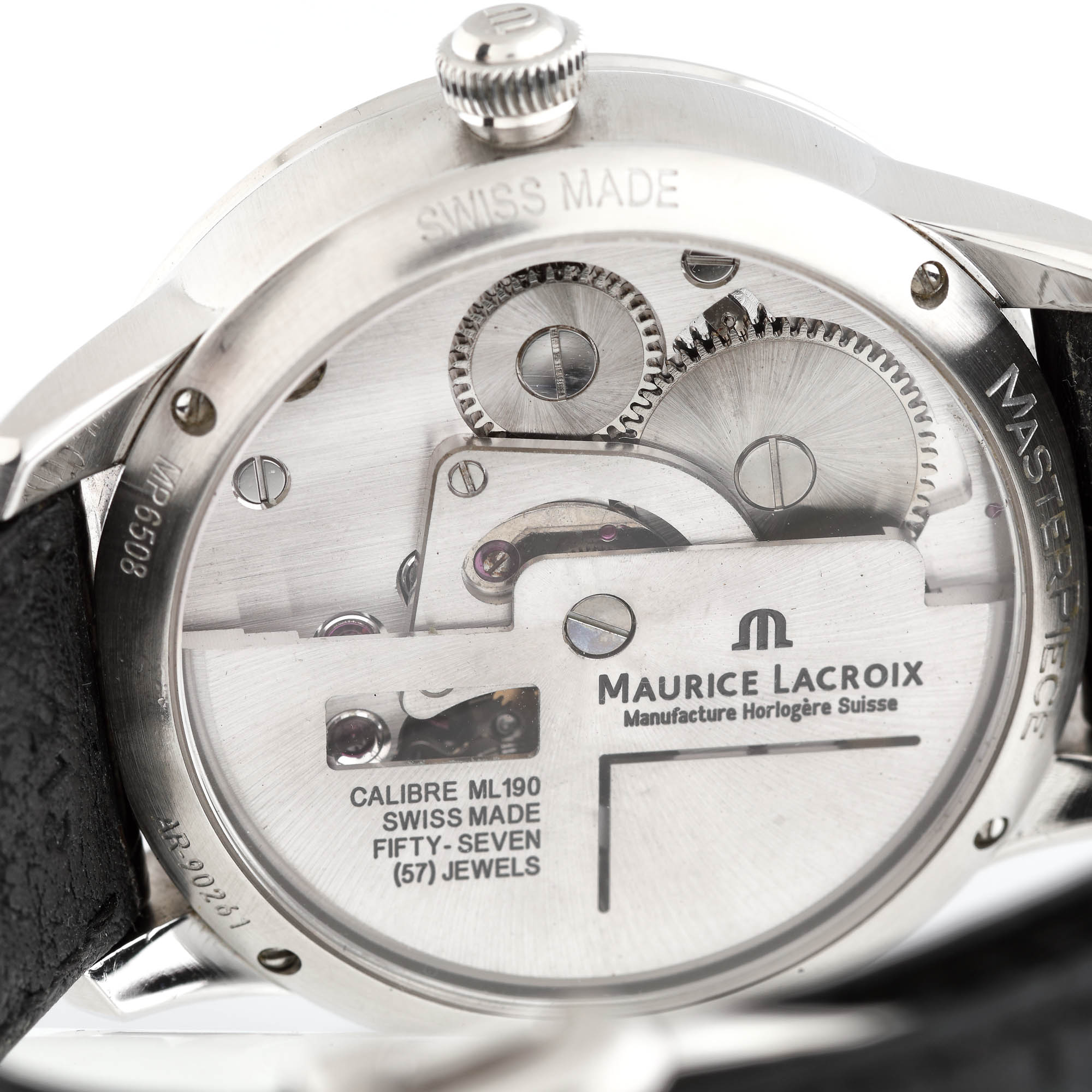 Ceas Maurice Lacroix Masterpiece, de mână, bărbătesc, referință MP6508, mecanism automatic. Cadran silver, registru rezerva de timp în dreptul orei 2, registru pentru secundar în dreptul orei 6 și registru pentru dată în dreptul orei 10. Curea din piele de aligator, de culoare neagră și sistem de închidere deployant, originale. Ceasul este însoțit de card de garanție, cu ștampila retailerului.