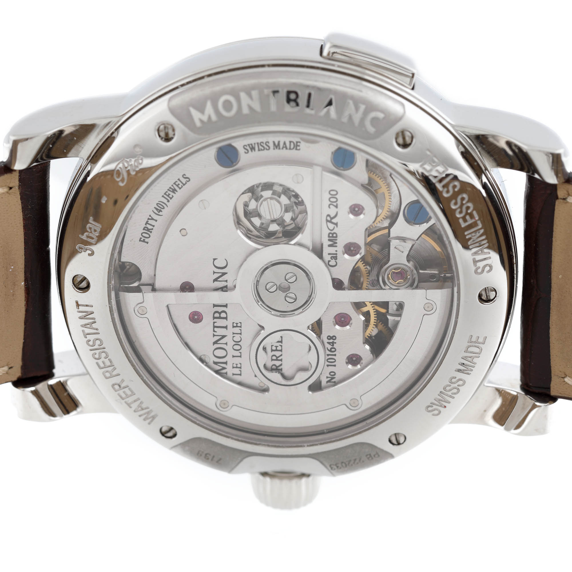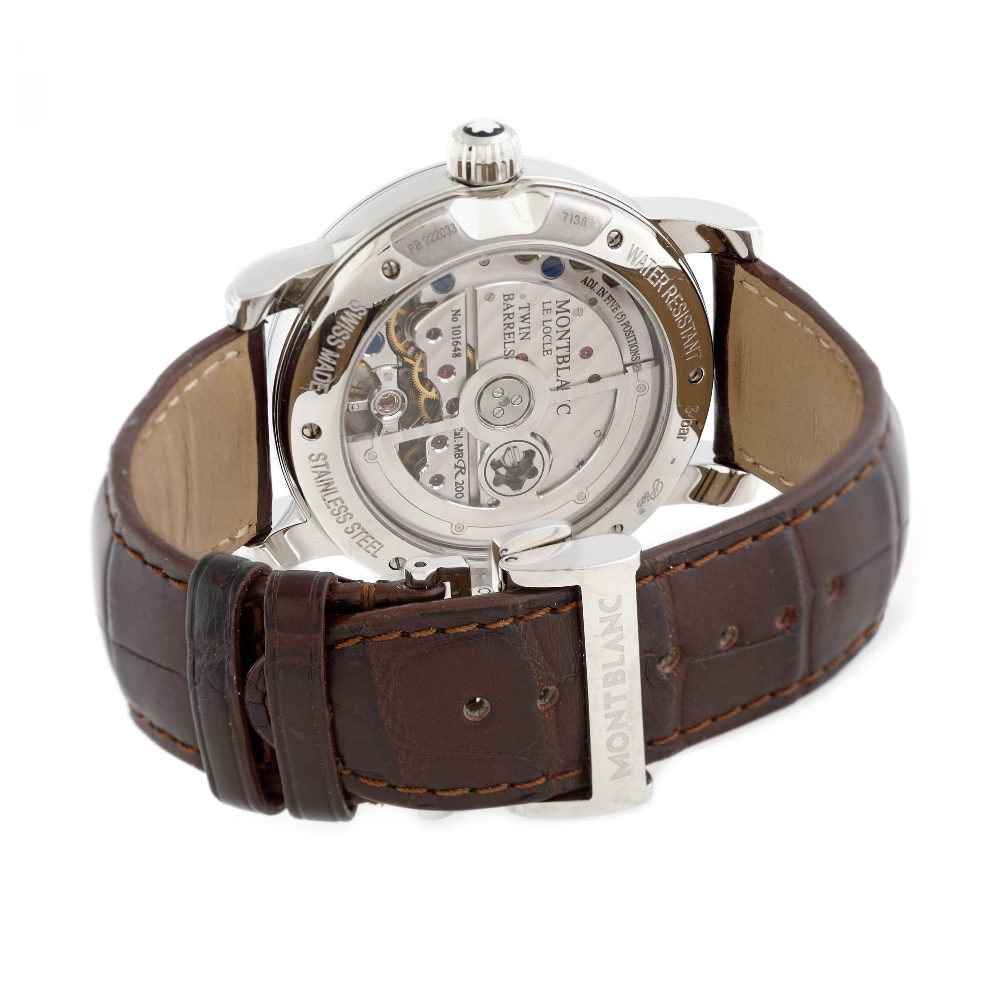 Ceas Montblanc Nicolas Rieussec, de mână, bărbătesc, referință 106487, mecanism automatic, anterior vitrat. Cadran de culoare alb, numerale arabe, registru pentru dată în dreptul orei 3, două registre, în dreptul orei 5 și 7 și un registru pentru rezervă de timp, în dreptul orei 9. Curea din piele de aligator, de culoare maro și închizătoare tip deployant, originale. Ceasul vine însoțit de cutie originală și cutie rotativă.