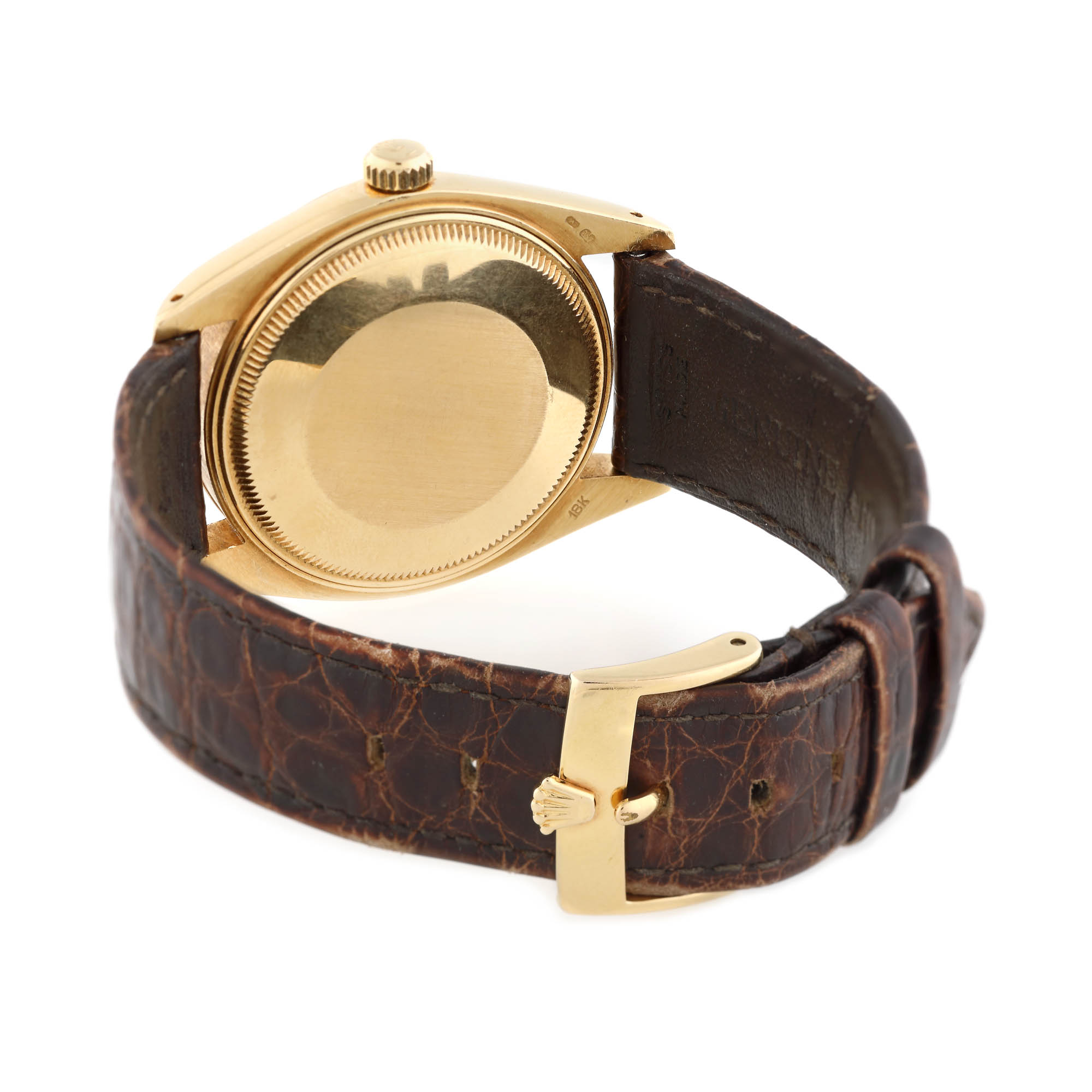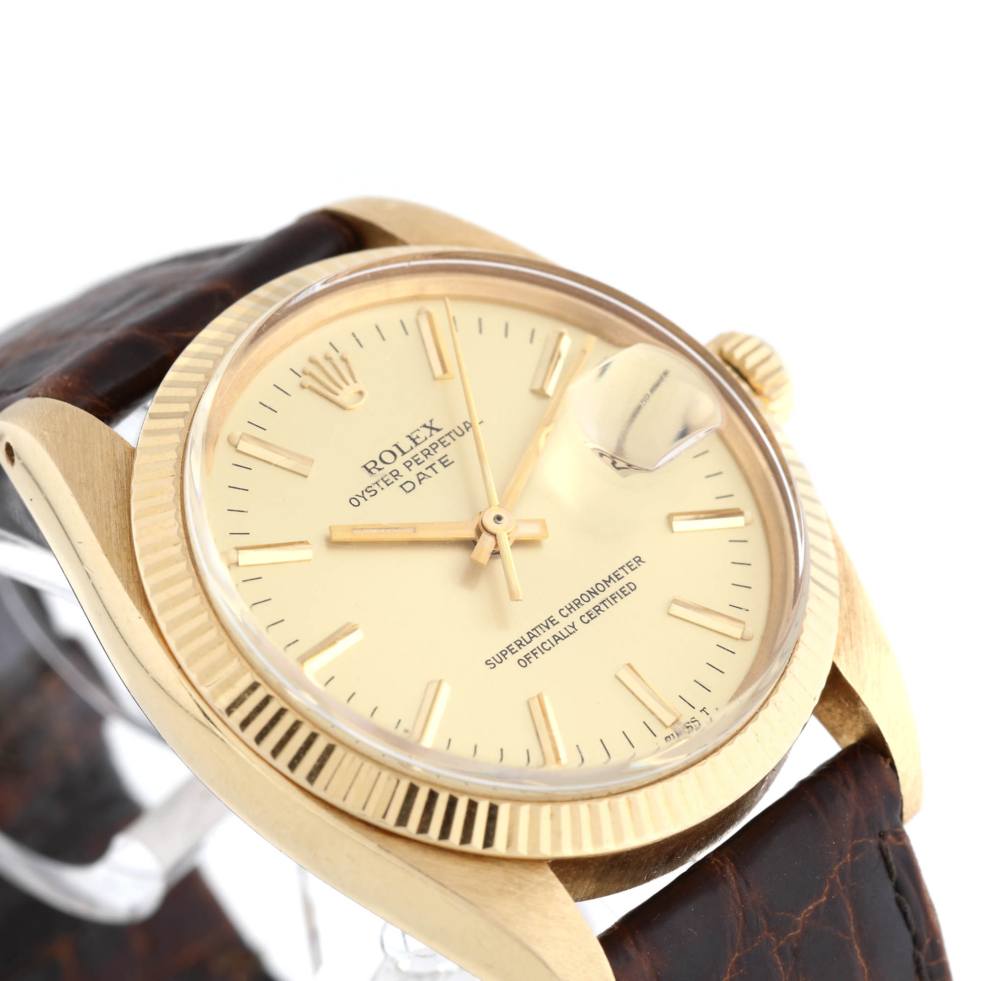 Ceas Rolex Oyster Perpetual Date, din aur, de mână, unisex, referință 1503, mecanism automatic. Cadran de culoare auriu, dată și lupă în dreptul orei 3. Curea din piele de aligator, de culoare maro și cataramă din aur, originale.
