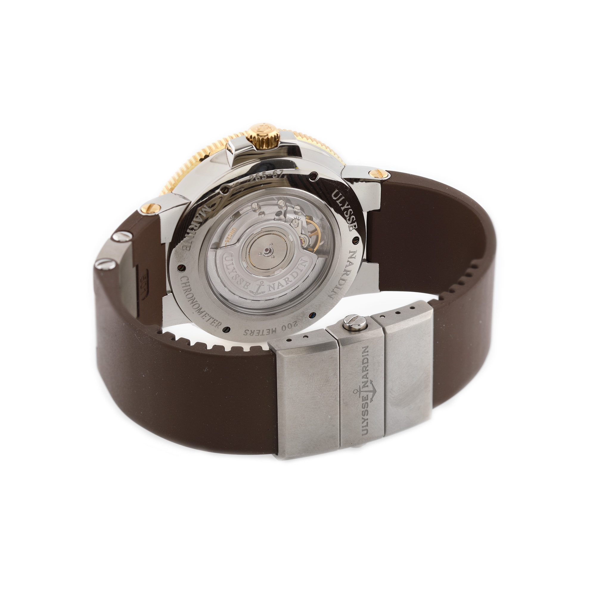 Ceas Ulysse Nardin Marine Chronometer, de mână, bărbătesc, referință 265-67/4179, mecanism automatic, vitrat anterior. Carcasă din oțel inoxidabil, bezel din aur roz, cadran "chocolat" cu numerale romane, registru pentru rezervă de timp în dreptul orei 12 și secundar, respectiv dată cu lupă în dreptul orei 6. Curea din cauciuc, de culoare brun, cu sistem de închidere tip deployant. Cardul de garanție, semnat, are consemnate locul și data achiziționării produsului (18 august 2013).