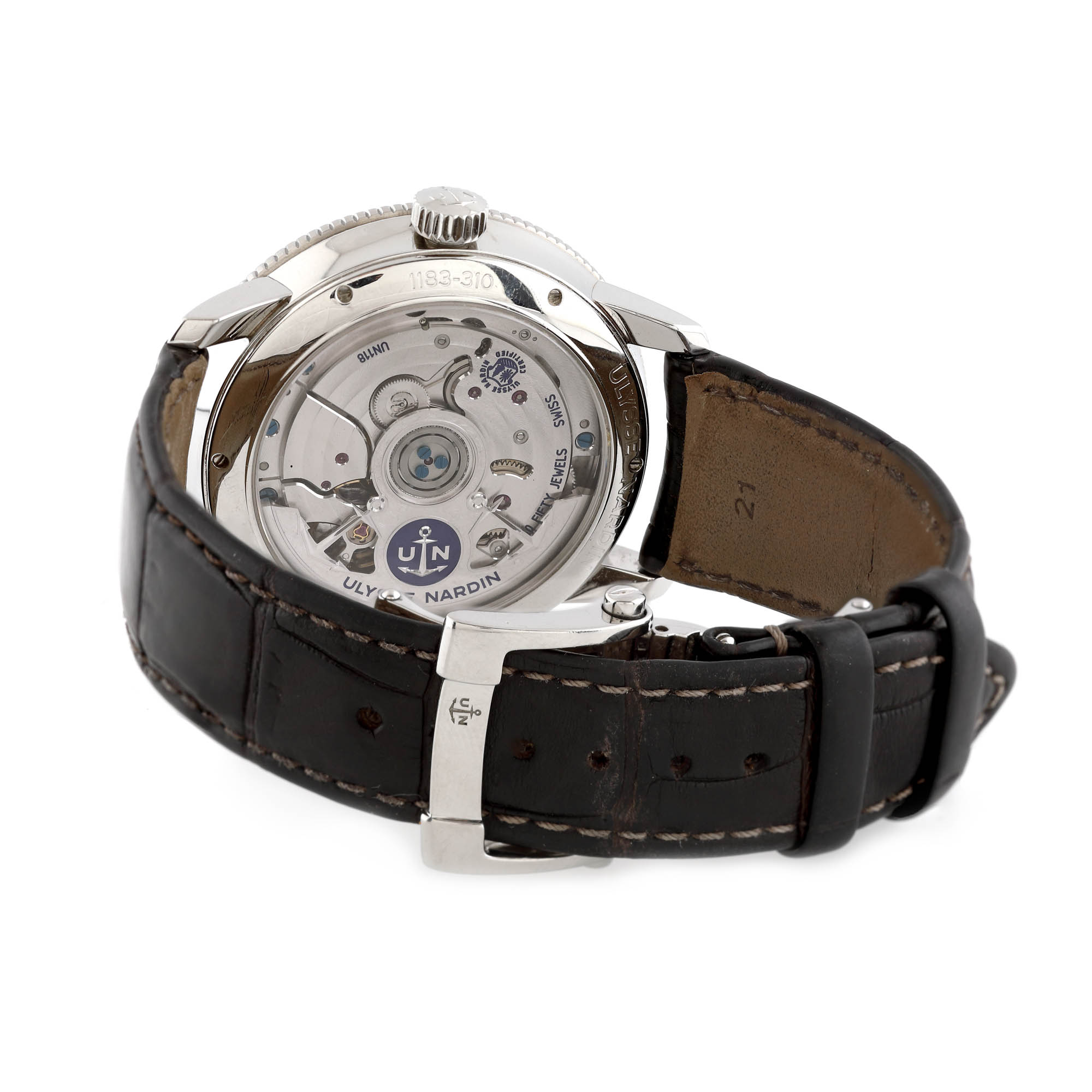 Ceas Ulysse Nardin Marine Torpilleur Military, de mână, bărbătesc, referință 1183-310, mecanism automatic, vitrat anterior. Cadran gri-argintiu, cu numerale romane, registru pentru rezervă de timp în dreptul orei 12 și registru pentru secundar și dată în dreptul orei 6. Curea din piele, de culoare neagră, cu închidere tip deployant.
